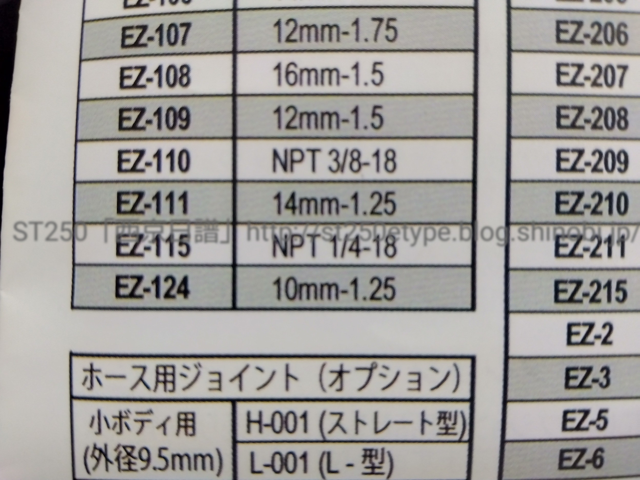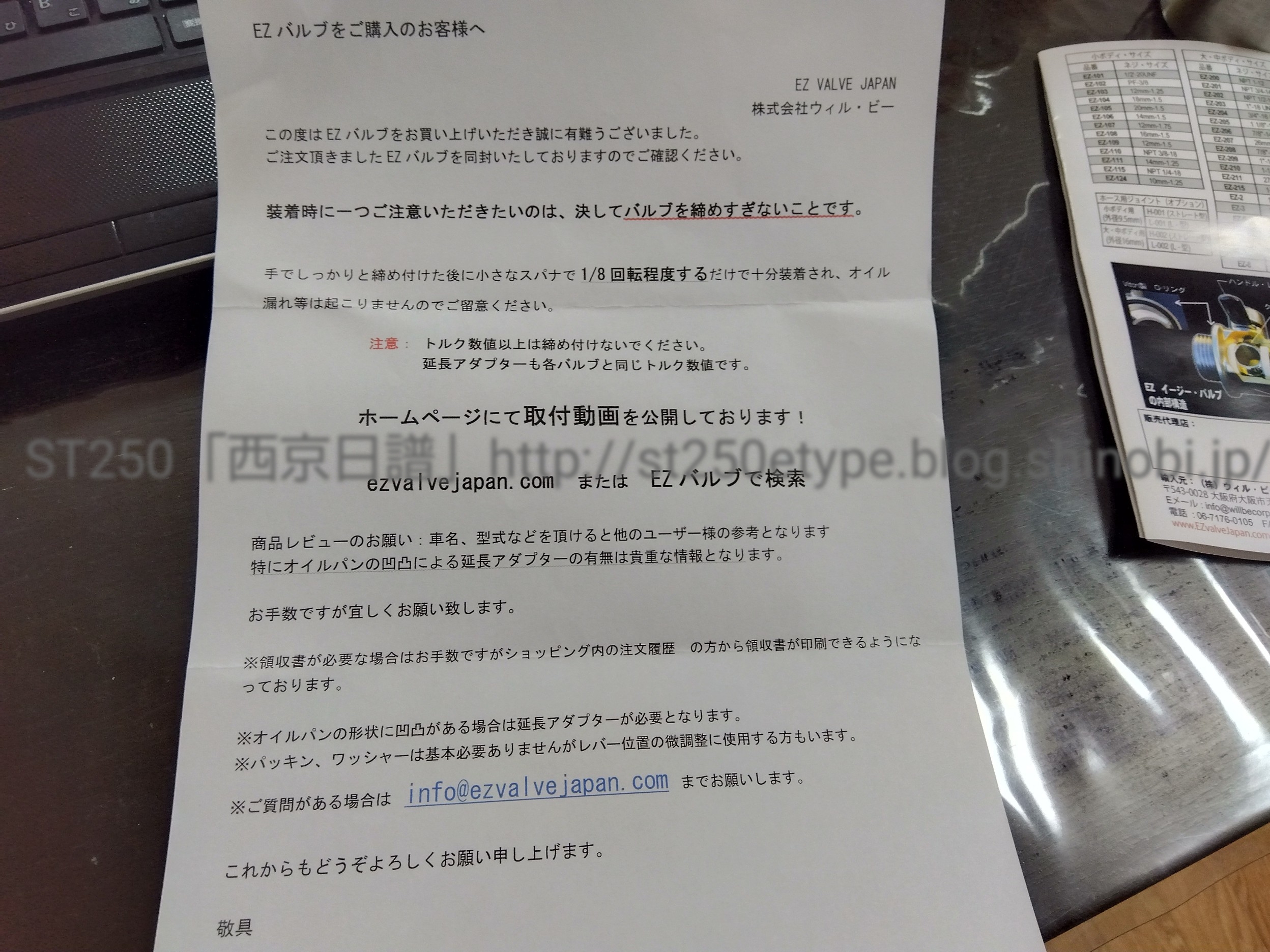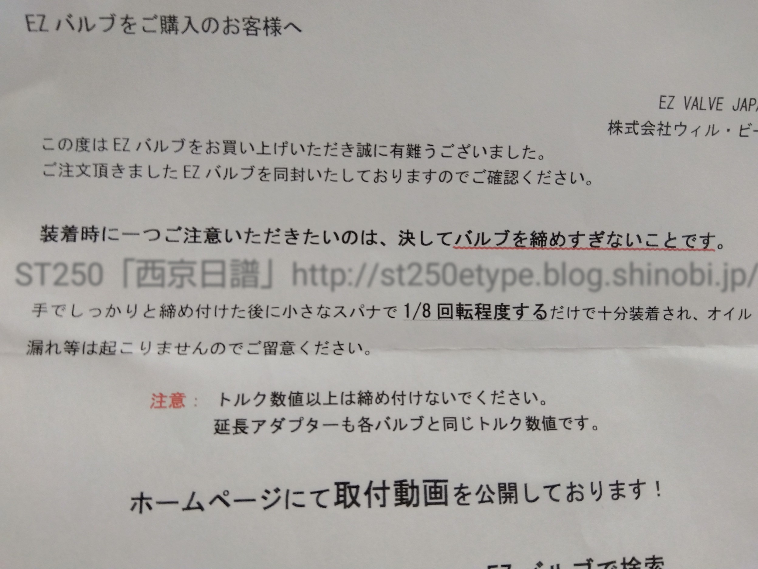 EZバルブを購入(R4.6) 日記 2022年06月17日 0 今回はパーツ購入の件購入したパーツは、オイル交換を容易にするアイテムです。商品名は「EZ OIL DRAIN VALVE」略して「EZバルブ」です。 ▲同封だったEZバルブのパンフオイル交換がワンタッチでできるEZ イージー・バルブ・オイル抜きはレバーを回すだけ・装着は簡単・時間と労力を大幅に削減・手が汚れず、環境にも優しい・ネジ山もつぶれません要は、オイル交換時によく着脱するオイルドレンボルトと交換することで、オイル交換作業が効率よくできるようになるものです。▲内部の仕組みハンドル・レバーを開閉するだけで内部のオイルを排出できるようになっています。このレバーは本体の溝に噛むようにロックされているので、走行中に誤作動することはなさそうです。(ただ、どんなこともそうですがイタズラには耐えられないという危惧はあります。その場合はすぐに110番で通報しましょう) ▲サイズ表ST250は「EZ-111」が適合します。 ▲同封の書面……注意書きが書いてある▲赤線部バルブを締めすぎないことです。とあります。通常、ドレンボルトはトルクレンチを使って規定トルク値で締め付けますが、このEZバルブは最後に1/8回転ほど締め付けるだけでいいそうです。▲延長アダプターの件(透かしと重なっていて見えないですが……)バイクの車種ごとに適合のアドバイスができるよう、購入者にレビューを求める内容です。商品レビューでの情報ですが、ST250はオイルパンが凹んでいますが、延長アダプターは必要ないことが分かっています。 ▲EZ-111(オモテ) ▲別途購入品……キャップ(小)EZ-111(14mm-1.25):¥2,780キャップ(小):¥280送料(一律):¥360合計:¥3,420ドレンボルトの交換の手間を省くために、約¥3,500をかけるべきか悩みましたが……【レッドバロンでの交換費用】 オイルリザーブ加入:¥9,000 又は ¥18,000(初回のみ) フィルター交換なし:¥590(技術料) フィルター交換あり:¥2,020(フィルター代+技術料+税) ※混雑時、待ち時間あり ※定休日あり【今後、自分でやる場合】 フィルター交換なし:約¥700(オイル代) フィルター交換あり:約¥1,800(オイル代+フィルター代+廃油袋等)オイルリザーブって1Lあたり¥600をまとめ買いしてる計算になるから、単純に「技術料」の違いになってくるのか。店の制約が無いだけ自分でやる方がまし?レッドバロンでマフラー凹んだし、バーエンドのロックナット紛失されたり、整備力(というか客への配慮)に一定の不安あり?自分で交換しやすくなるから、バイクにも良い?ま、なんでもやってみないと評価はできないものですね。後日、オイル交換と同時にドレンボルトをEZバルブに交換します。バイク(スズキ)ランキングへ
