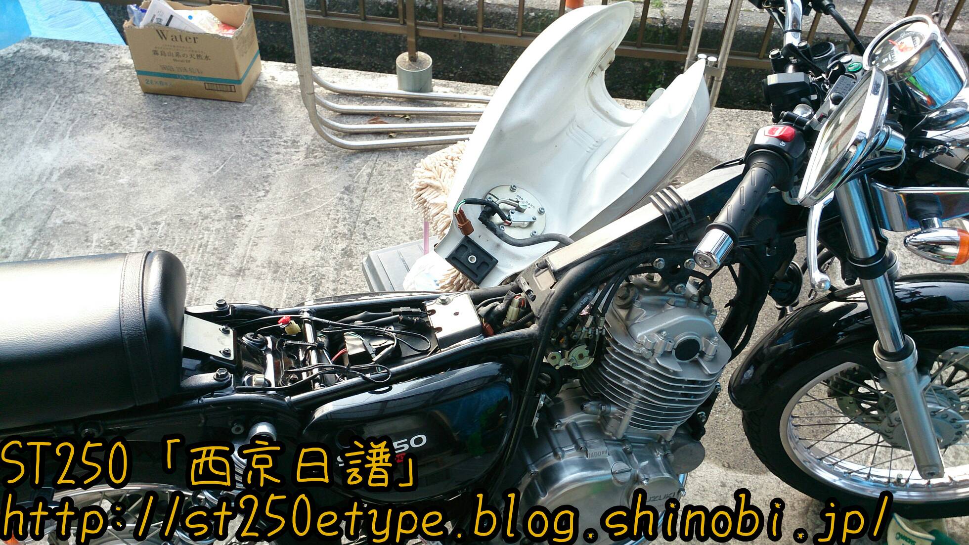 アーシングケーブルの取付け 日記 2016年03月27日 0 今回は先日届いたアーシングケーブルを設置した件です。今回のアーシングはシリンダーヘッドとイグニッションコイルを結ぶ配線なので、タンクを取り外す必要があります。初めてです。タンクを外すということは、タンクに繋がってる部分(ガソリンホース、FIのカプラー)を外す作業が出てきますが、できればホースは抜きたくない。ネットで調べると、タンクを外す手順としては……1*フロントシートを外す2*タンクの六角穴スクリューを外す3*FI関連カプラーを確認して外す4*ガソリンホースを外す 5*タンクを逆さに置くという感じです。で、4の「ガソリンホース」をつないだまま作業してみます。タンクと同じような高さの台を用意し、その上にクッションを敷いてにタンクを裏返しで保持。ガソリンはあらかじめ300km走行した状態ですので少ない状態になっています。ガソリンホースの形状と配置から、左側に置くことしかできません。FI(茶色)のカプラーを外しました。黒のガソリンホースは繋いだままです。このガソリンホースですが、ホースとは名ばかりでパイプのように固く、しなやかさがなく曲がりません。そのため写真のようにフレームとギリギリの位置になります。タンクの裏とフレームにサビがあったので、サビチェンジャーを塗って防錆し、シリコンスプレーを吹きました。イグニッションコイルは左側に延びています。今回の方法では、タンクも左側によけてあるので作業がやりにくかったです。アーシングケーブルは、イグニッションコイルが固定されているボルトに共締めするだけです。(詳しくはST250の某サイトにて。)タンクから少しガソリンが漏れていたようなので、共締めしてすぐにタンクを戻しました。アーシングケーブルの先はシリンダーヘッドです。20センチという長さの制約でこの場所になりました。20センチでは短すぎたかも。遠目にはまったく分かりません……(;´Д`)短すぎて目立たずドレスアップとしての効果はありませんでした。次はもう少し長めの30cmで用意してみようと思います。装着後のインプレッションです。効果はよく分かりません。よく分からないだけで、効果はあるのかもしれません。■アーシングの主な効果■全域にわたるトルクアップスロットルレスポンスアップ燃焼効率が向上し低燃費を実現中・低速域のトルクの向上ヘッドライト照度の向上等旧車には効果が覿面しかし、作業としては簡単なのでやってよかったと思います。バイク(スズキ)ランキングへ PR