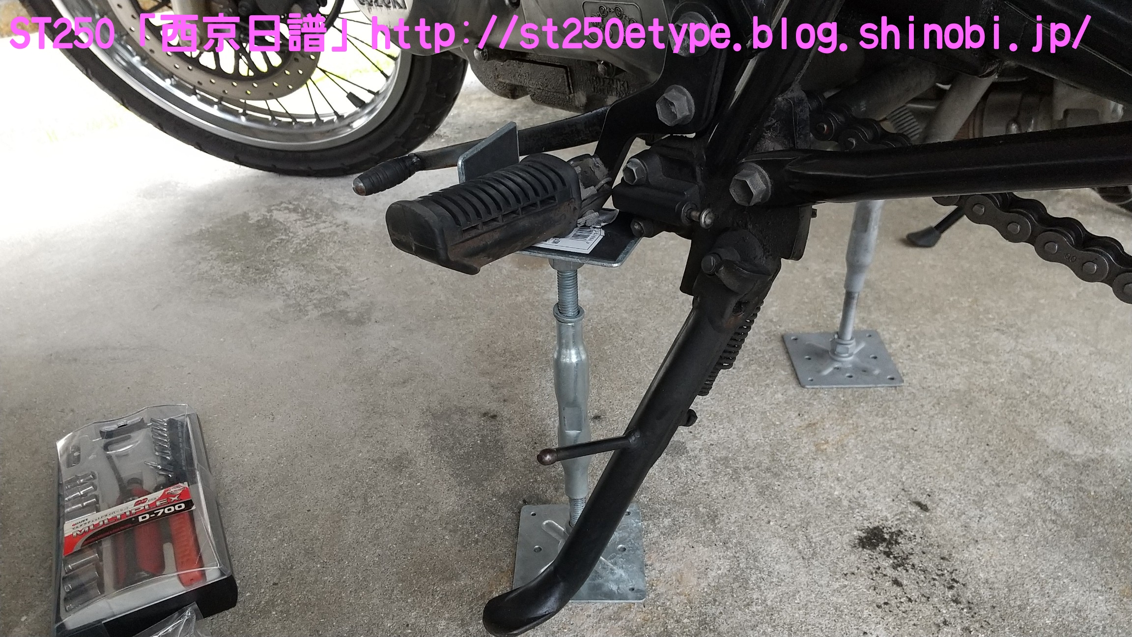 ドライブチェーン調整 日記 2020年11月25日 0 今回はドライブチェーンのアライメント、遊びを調整した件です。チェーン調整に関しては、後輪のシャフト付近にある目盛を頼りに行っていましたが、ネット情報では目盛にも差分があり正確ではないという情報が。調べたくなったのでチェーンアライメントツールを購入しました。↑デイトナ製↑パッケージ表示は1900円となっていますが、アマゾンで1200円位で購入。更に安価なのだと800円位でありましたが、こちらは横の方に針があって便利そうだったので決めました。準備としては、ジャッキアップです。いつもの鋼製束を使います。今回やり方を変えてより安全になりました。まずはフロントブレーキ固定↑マフラー側、右ステップの下へ配置↑スタンドを下ろしたまま、左ステップの下へ配置↑左の鋼製束を回して、後輪が軽く回転するまで持ち上げます。全体的に左に傾いている状態になります。スタンドは倒れた時の保険です。アクスルシャフト、右側ナットを緩めます。↑ツールを装着使用前後を写真に撮って比較↑ビフォー↑アフター↑ビフォー↑アフター使用前はやや右に向いていました。使用後、真っ直ぐにはならなかったものの前よりマシになりました。※なかなか上手く修正できなかったんですが、今考えるとリヤブレーキを緩めていなかったせいかも知れない。目盛を確認してみると……↑左側↑右側目盛が狂っているようにはみえませんでした。それより、アクスルシャフトをいい加減に締めていると走行中に狂ってしまいます。同時に遊びを調整します。サービスマニュアルでは遊びは10~20mmとのことですが、サイドスタンド使用時の基準。そもそもサイドスタンドを立てた状態でチェーン調整が上手くできるのか疑問ですが、今回はジャッキアップしています。サスが沈んでない状態なので30mmで調節してみました。少し固すぎる気もしますが、様子をみてみます。バイク(スズキ)ランキングへ PR