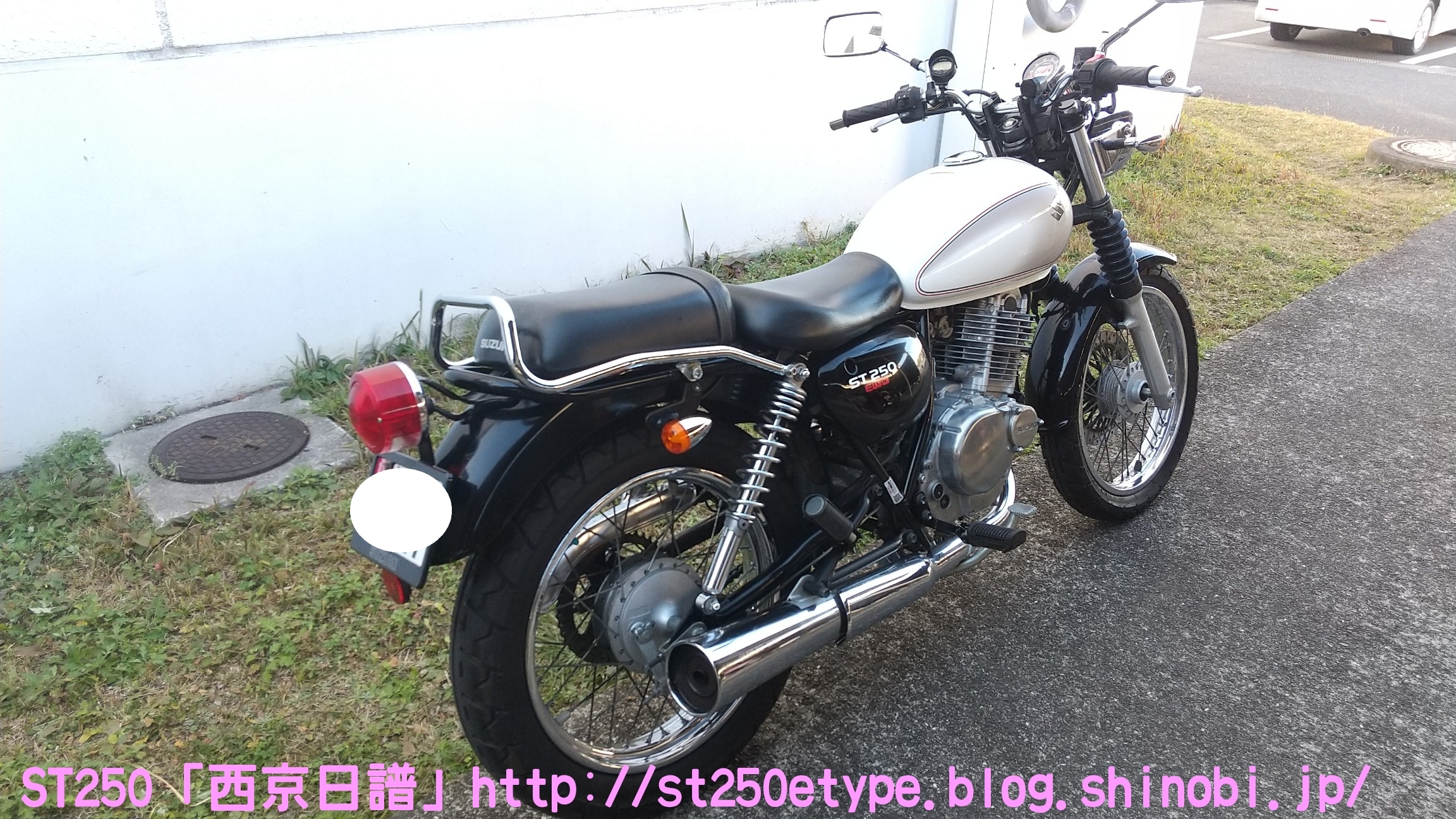 フォークブーツ&タンデムグリップ装着 日記 2020年12月30日 0 タイトルのとおり、フォークブーツとタンデムグリップを装着しました。ですが、本来の目的はフロントフォークのオーバーホールとステムベアリングの交換です。もう何年も前から、というか納車して1年後辺りからフロントフォークからオイル漏れの症状がありました。よく見るとフォークシールにヒビがあり、そこから漏れているようでした。当時はローンの返済で、修理なんかに費用を充てられませんでした。DIYも考えましたが、追加購入しなければならない工具なんかもあり断念。騙しだまし乗り続け、はや7年……さすがにフロントフォークも限界かと。ローンもだいぶ前に完済したし、いつものレッドバロンで見積りを依頼。フロントフォークのオーバーホール……だけでなくステムベアリングの交換も追加され、部品代&工賃込みで総額3万ちょい。ちなみにフォークは再利用します。時間と労力を考えると対価としては妥当……?しぶしぶ了解し、帰ろうとした時にふと思いつきました。ついでにフォークブーツもお願いしよう。確認すると、フォークを分解するのでフォークブーツに関しては技術量が掛からないので、部品代だけで良いとのこと。フォークブーツはキジマの汎用品で適合するものを取り寄せるとのことで、代金は3千円。↑装着されました。下部に太めの結束バンドが目立ちますが、納得の仕上がりです。渋く良くなりました。見た目のクラシックさが増し、レトロ感が上がりました。見た目だけでなく、フォークシールが完全にカバーされるので紫外線による劣化防止になると思います。フォークブーツの耐久性はどれくらいか、様子見です。ステムベアリングは、正直変える必要があるのか……?と思っていましたが、とても効果がありました。ハンドルが軽くなり、運転しやすくなりました。↑DIYで取り付けました。次はハリケーン製のタンデムグリップを取り付けました。部品の購入価格は9千円くらいでした。見た目がSR風で、納得の仕上がりです。ちなみに、取り付けには少々苦労しました。アーレンキーだけでは後方のネジが回らず、コンビネーションレンチを組み合わせ、何とか回しました。バイク(スズキ)ランキングへ