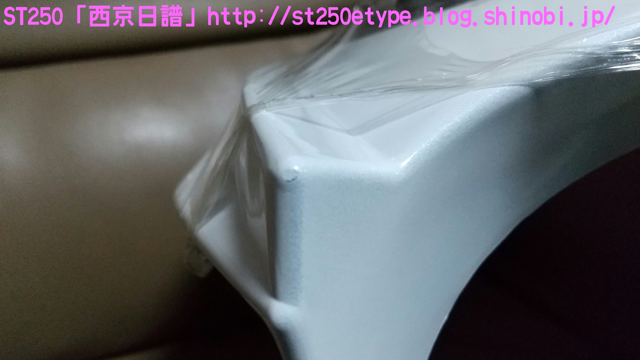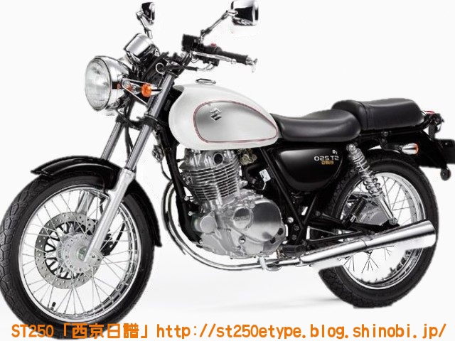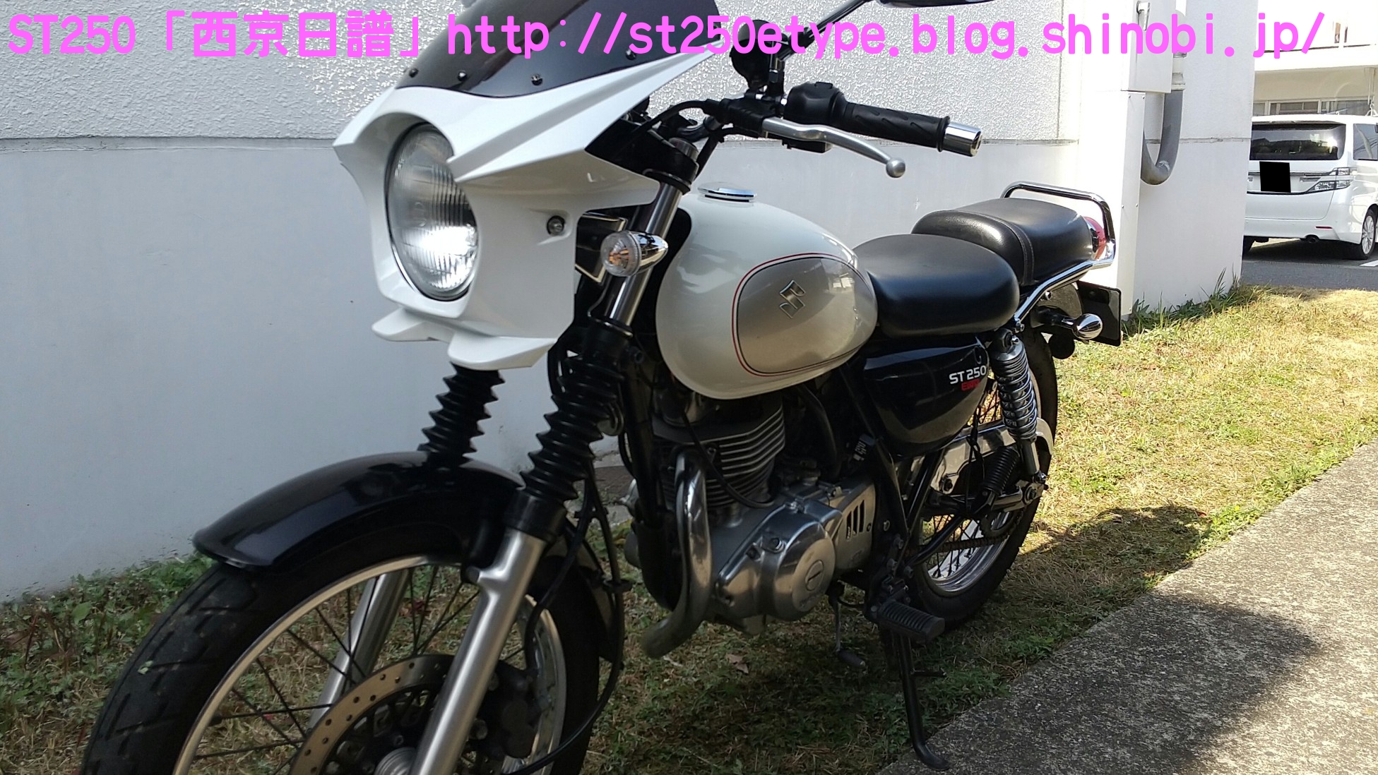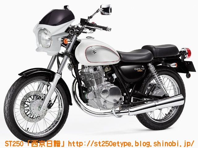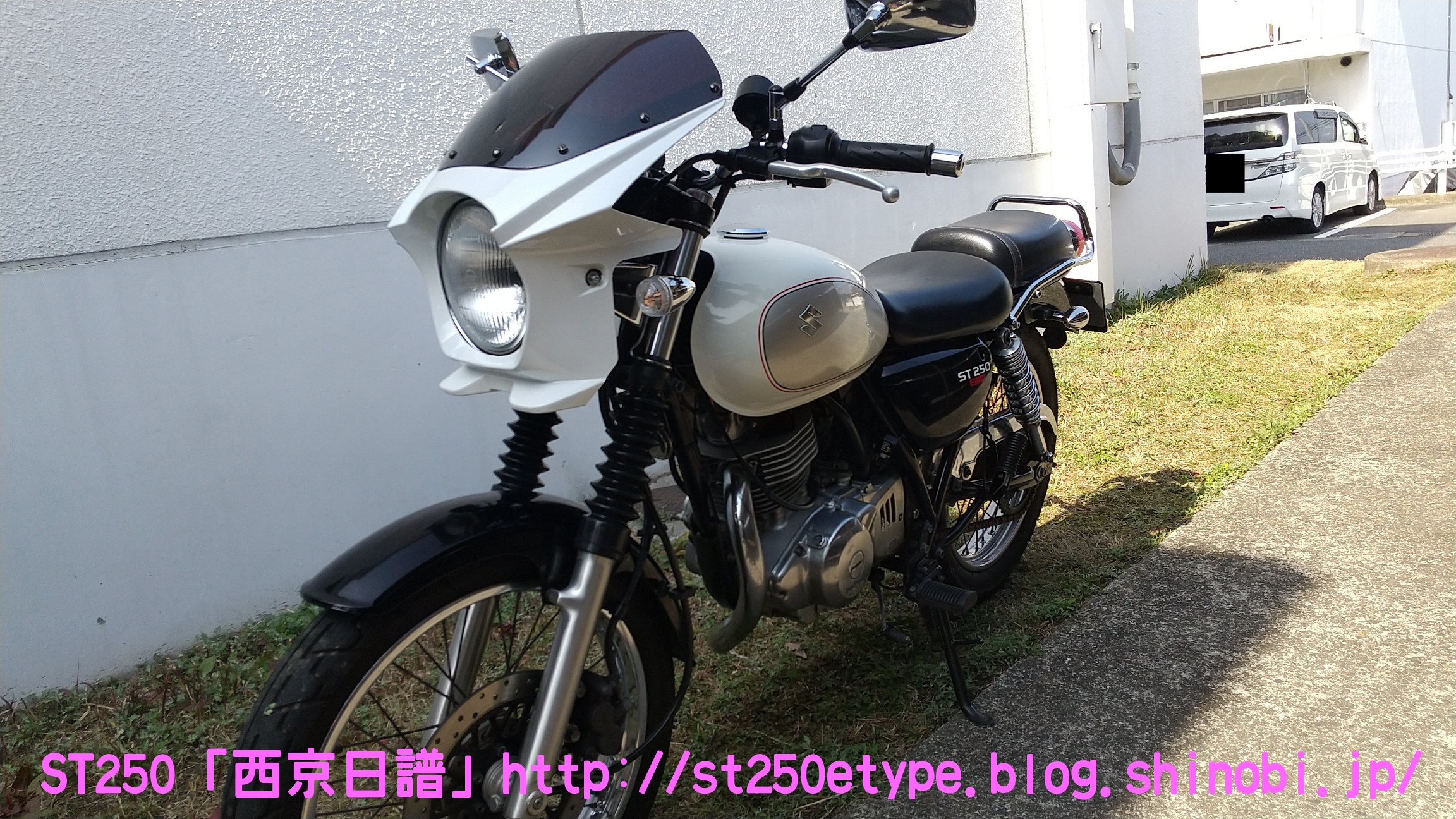 カウル色の選定 日記 2021年02月13日 0 STにカウルを付けようと考えています。以前から、フロントマスクを装着したスタイルもいいな……と思っていましたが、一番の理由は近々高速道路で長距離を移動する予定があるからです。高速道路の走行で絶対の条件は「フロント(ドライブ)スプロケの16丁化」です。幹線道路でも最高速度の維持が楽になりますから高速道路では尚更です。次に走行風をどうするかを考えた時に、やはり風防があると幾らか違うでしょう。可能な限り腹部~胸部への抵抗を抑えられれば、もっと高速道路も移動が楽になると思います。ノーマルの外見を活かすのであれば、透明のバイザーがあります。ライト横の固定部で挟むだけで装着も簡単、価格も2千円~5千円と手頃。フロントマスクは「ビキニカウル」と検索すると商品が出てきます。本当なら、シックデザインのコメットやクラシカルなデザインが良いのですが、それだと価格が5万円ほど。今はまだお試しで着ける程度なので、アマゾンなどで売られている安物を探します。4千円~5千円の安物とはいえ、レビューを見ると台湾製でそこまで悪くない様子。カラーが赤、青、白、黒、シルバーの5色の展開。ここからが本題です。普通ならバイクカラーに合わせてカウル色も選ぶことで統一感や純正感が出るものだと思いますが、厄介なことにうちのSTはタンクカラーがパールホワイト、フェンダーその他のカラーがブラックと全然違います。挙げ句タンクも単なるパールホワイト一色ではなく微妙にシルバーのグラデーションがかかっています。つまり、今の検討段階では白、黒、シルバーの三つ巴状態です。画像で検索してもイメージが湧かなかったので、合成してみました。Windowsのペイント3Dというエディタを使用、今は随分便利になっていますね。比較用のノーマルブラックホワイト(パールではない)シルバー遊びついでに赤現段階での印象ブラック……タンクが浮いてる気がする。ホワイト……パールホワイトなら有りかも。シルバー……後づけ感が強いかも。こういったものは、深く考えては頭を冷やす……を繰り返して納得のいくものを選ぶことができると思います。もうしばらく考えます。バイク(スズキ)ランキングへ