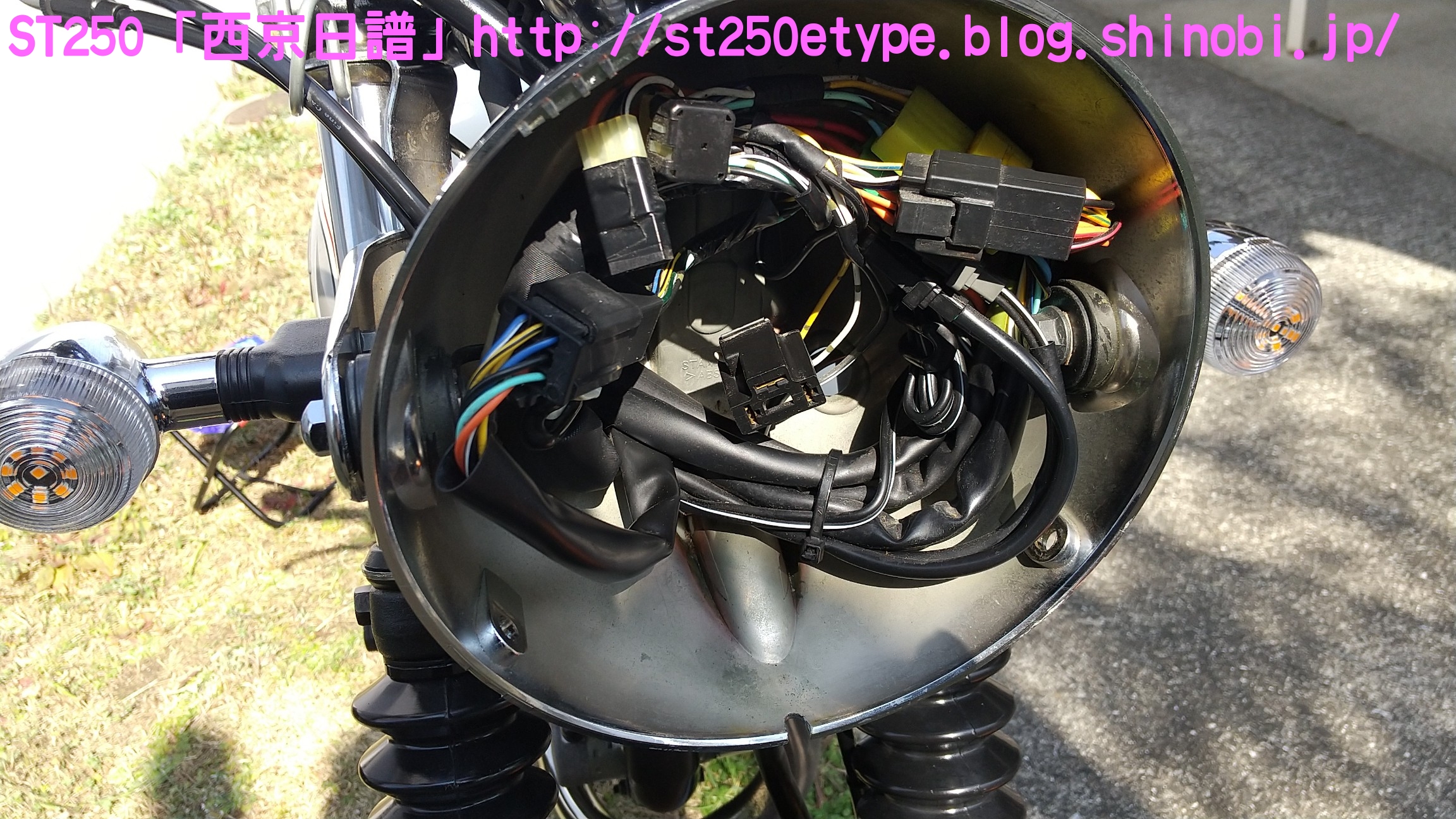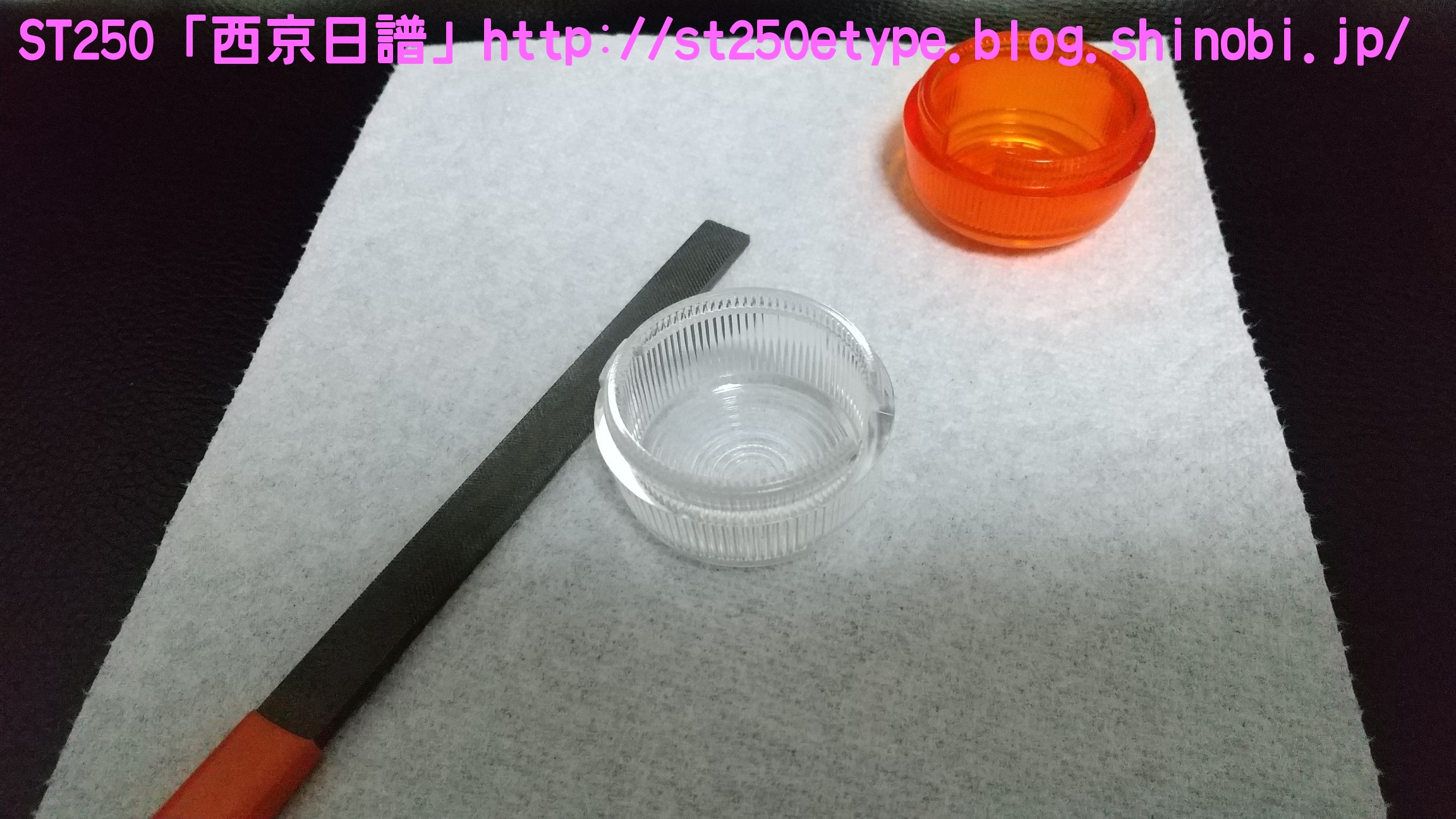 クリアウインカー導入 日記 2021年02月20日 0 これまで、通常のオレンジのウインカーレンズに白色LEDを組み合わせて使用していました。夜間は問題ないのですが、昼間はどうも視認しづらいと感じていました。太陽光の下では点滅してるのかどうかが分かりにくく、安全面に疑問を抱いていました。さらに、最近の車のウインカーは目につく限りではクリアが一般的でオレンジのウインカーなどは一昔前のもののようです。今日のスマホのニュースで流れていた、ホンダのニューマシンである「GB350」。ネオレトロというジャンルですがやはりウインカーレンズはクリア。安全面、見た目……どういう理由なのかは分かりませんが、これから販売される車両にはクリアが採用されていくものと思われます。ということで、安全性の獲得と時代の流れに合わせるためクリアレンズの購入です。ネットショッピングで2個/1,100円と送料で計2,800円ほどと少し高め。↑宮崎県からの発送。メイドイン台湾の表記。ちなみに、MADE IN PRCは中華人民共和国(Peaples Republic of China)です。ブレーキパッドなど重要部品で見かけます。理由は分かりますよね?China表記では印象が悪いからです。私は敢えて避けるようにしています。台湾製は、国力や国情的に信頼しています(日本精神という考え方がある国ですから)。※あくまで印象です。純正との比較(表)クリアの方にはメーカーの文字がありません。純正との比較(裏)ほぼ分かりませんが、凸部分がクリアの方がわずかに大きい。既に購入者レビューで確認済みでしたが、やはりウインカーケースに嵌め込む凸部分がクリアの方が若干大きいため、そのままではキツすぎました。純正は手で着け外しできますが、クリアはキツすぎてマイナスドライバーがないと外すことができません。それはそれでイタズラ防止にはいいんですが、レビューによるとウインカーケースが過負荷によりヒビ割れを起こすようです。 ウインカーケースの交換となると面倒なので、クリアの凸部分をヤスリで削りました。純正と見比べながら削ります。結局、慎重になり過ぎて思ったより削れませんでした。ヒビ割れの恐れはたぶんなくなり、ポン着けよりマシという程度ですが、装着感が固いので外しはマイナスドライバーが必要です。小さめのマイナスを地面側にある隙間から差し込んでテコの原理で外します。特に傷もつかないので大丈夫でした。では装着後です。↑比較用(純正)オレンジ感がなくなり、端正になった気がします。球にはアンバー色のLEDを使用。規格は平行ピン180度です。元々着いているのを見れば分かりますね。↑こちらも宮崎県からの発送でした。2個/1,200円と送料で2,600円ほど。商品説明では「爆光」タイプではなく「高発光」タイプとのことでしたが、これでも眩しいくらいよく光ります。最近は種類が多いのであまり長いものだとレンズに干渉するので注意が必要です。期待していた安全面での視認性アップと、ドレスアップ効果が一気に獲得できた気分となりました。追記です。後日、ウインカーが点滅しているところを写真を撮りました。なかなか良く光っていて視認性良好です。バイク(スズキ)ランキングへ