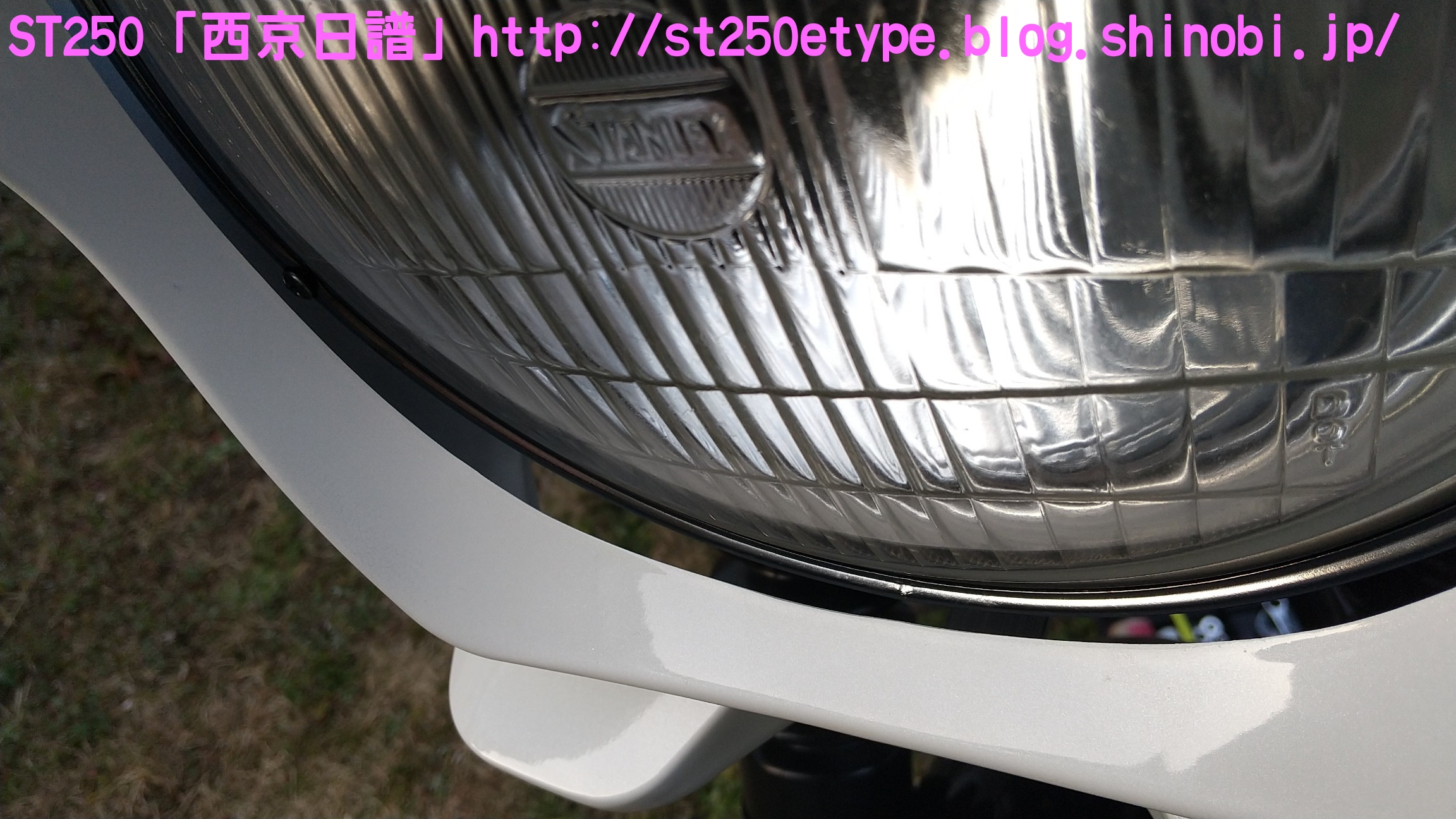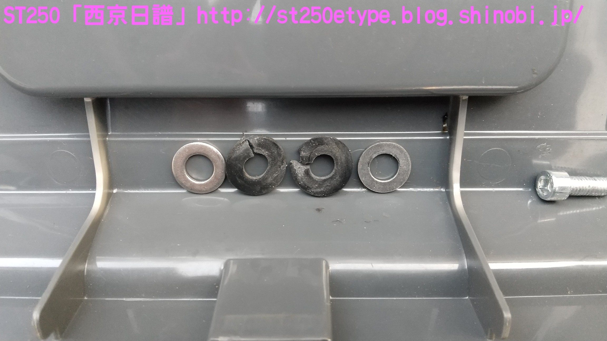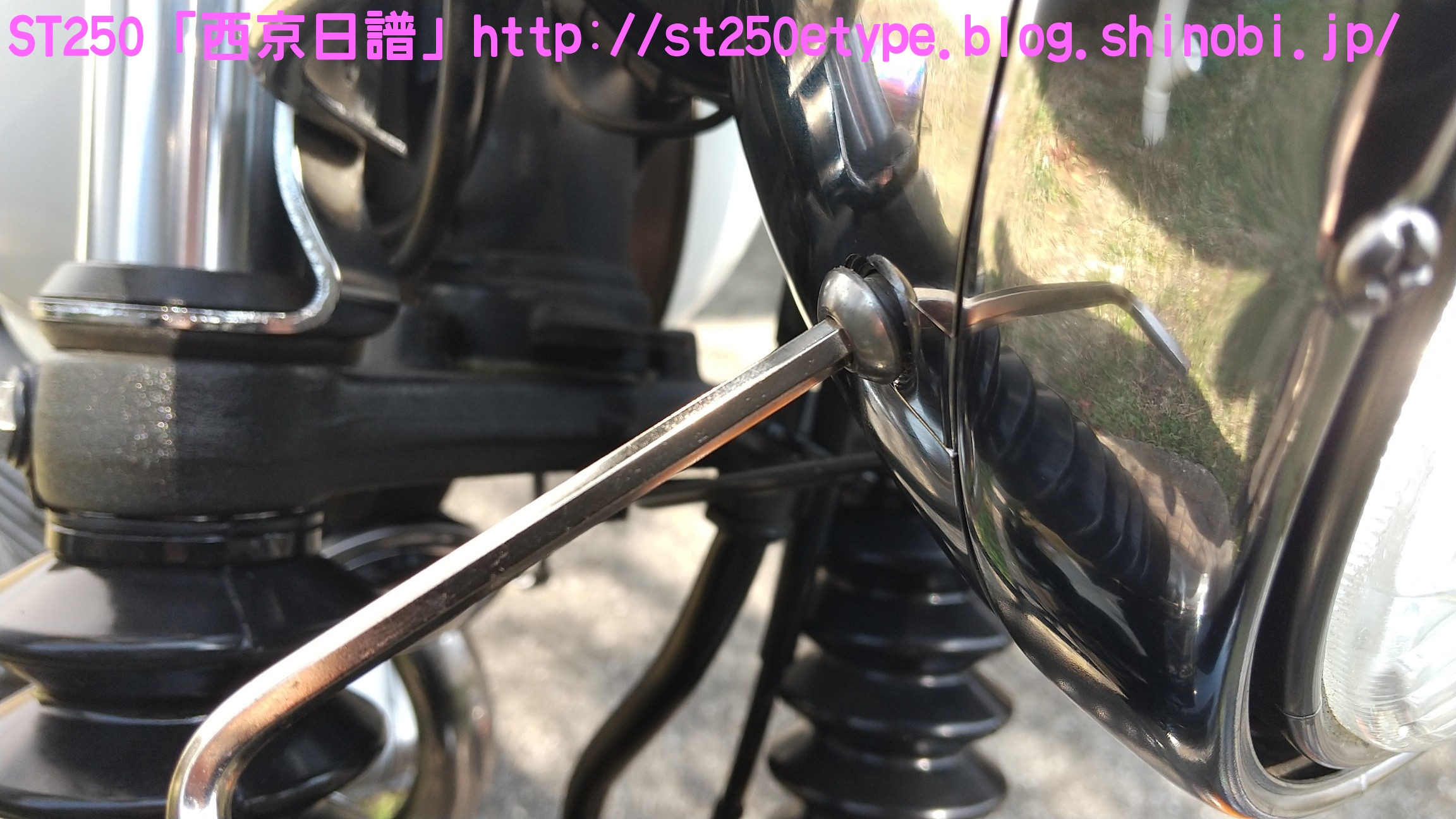 汎用ビキニカウル装着 日記 2021年02月21日 0 先日の記事で、ビキニカウルの構想とカラーの選定について書いていましたが、色が決定したため注文しました。ネットショッピングで取付けネジ付き4,900円ほど。在庫があったのかわずか2日で到着。↑メイドイン台湾早速開封↑白に決めました↑完成イメージ↑パールホワイト塗装購入者レビューに書いてあった通り、パールホワイトの塗装が施されていました。タンクカラーがパールホワイトなので好都合でした。↑一部塗装に難ありとはいえ、特に目立つものではありません。↑台湾製ABS材↑裏面の塗装は無しスクリーン取付けネジが錆びるというレビューがあったので、今後ステン製などに交換する必要があるかもしれません。以後、取付けです。ビキニカウルは180φのものを用意します。↑ライト下部のネジを外す5mmのアーレンキーを使用します。左右を外すとガラスレンズ一式が外れるので落下に注意します。↑ライトケース内砂、埃、虫などを取り除いて綺麗にします。↑向かって左↑向かって右当初の取付け状態です。純正に戻す時のために記録しておきます。黒ナットは紛失しないよう、そのまま使用します。取付け用のビスと交換していきますが、この時は片方ずつ交換します。光軸がズレないようにする必要があります。↑ビスの比較上が純正のビスで、下が取付け用のビス。純正のビスよりも長いですが、取付けには問題ありません。径はM8サイズです。付属のスペーサーなどは使わず、ビスだけを交換。純正のものは戻しやすいようにそのまま利用します。↑向かって左↑向かって右左右とも長さをもて余すので、振動の緩み対策としてスプリングワッシャを追加しました。ガラスレンズ一式を元に戻すと、これでカウルの土台が完成です。この後は、取付け用のビスにカウルとワッシャー類を付属のM6のボルトで留めます。そこで、問題が発生……↑ゴムワッシャーがねじ切れるあっという間にゴムワッシャーが捻じ切れました。こちらも購入者レビュー書いてはありましたが、ここまで早いとは……。ちなみに、カウルは台湾製なのですが、付属のネジ類は中国製です。中華民国と中華人民共和国とでは大きな違いです。↑中国製、ワッシャ径もデタラメこれはM6サイズのボルトに取り付けるものですが、ワッシャ径はM8のもので大きいです。本当に中国製は疲れる……。記録用にネジの説明書などをアップしておきます。予想はしていたので、一旦作業をやめてホームセンターに行きます。必要と思われるものを買い足してきました。※M6サイズ六角ボルトを撮り忘れまず、M6サイズのワッシャとゴムワッシャです。大きさがそれぞれ二種類ありますが、大きいものはカウルの内側、小さいものは外側に使います。固定をよくするためには大きなワッシャで摩擦面を増やす方が有効ですが、外側は物理的に20mm以上は付けられなそうです。そして、三点止めで固定を強化するために……↑200mmステンレス板写真は既に手曲げ加工したものです。このステン板の孔はM6サイズのボルトが通る大きさでなければいけません。ホームセンターのバラ売りコーナーで、実際にM6が入るか確認しました。先にステン板の取付け位置を確認します。ライトケースを下から支えているボルトに共締めします。長さは十分にあります。M6のボルトで、10mmのレンチで外せます。↑写真は既にボルトを外してます↑いい塩梅に手曲げで調整これをカウルの下部にある孔に固定します。孔から孔までは約140~150mmでしたが、余裕をもって200mmをチョイス。やはり少し余りましたが、特に干渉しなかったので余分な箇所もそのままにしました。↑M6サイズの六角ボルトで固定緩み対策にスプリングワッシャを噛ませました。ゴムワッシャ、スプリングワッシャを使うと、ボルトの長さ15mmではギリギリでした。20mm あった方が余裕です。↑向かって右↑向かってサイドの左右はスプリングワッシャは不要です。そもそも、カウルの幅がパツパツなので、弾力(圧力)があるため緩みにくいでしょう。孔の中心で固定。ライト周りのクリアランスを確認します。↑下は余裕あり↑上は余裕なしSTは振動が激しいので、ここであまり余裕がないど干渉してビビり音が発生、実際にエンジンを吹かすとバリバリ言ったため、サイドを緩めて前にずらして調整しました。では、全体の確認です。この車体色でカウルを装着した画像が検索してもなかなか出なかったので、今後の参考としても複数枚アップしておきます。装着後の走行では、期待する風防効果が確かにありました。バイパスでも肩までの走行風がなくなったので、高速道路ではより実感できるでしょう。手頃な金額でドレスアップと風防効果が獲得できたので、とても満足です。ただひとつ、レトロ路線からは遠くなってしまいました。(^_^;)バイク(スズキ)ランキングへ