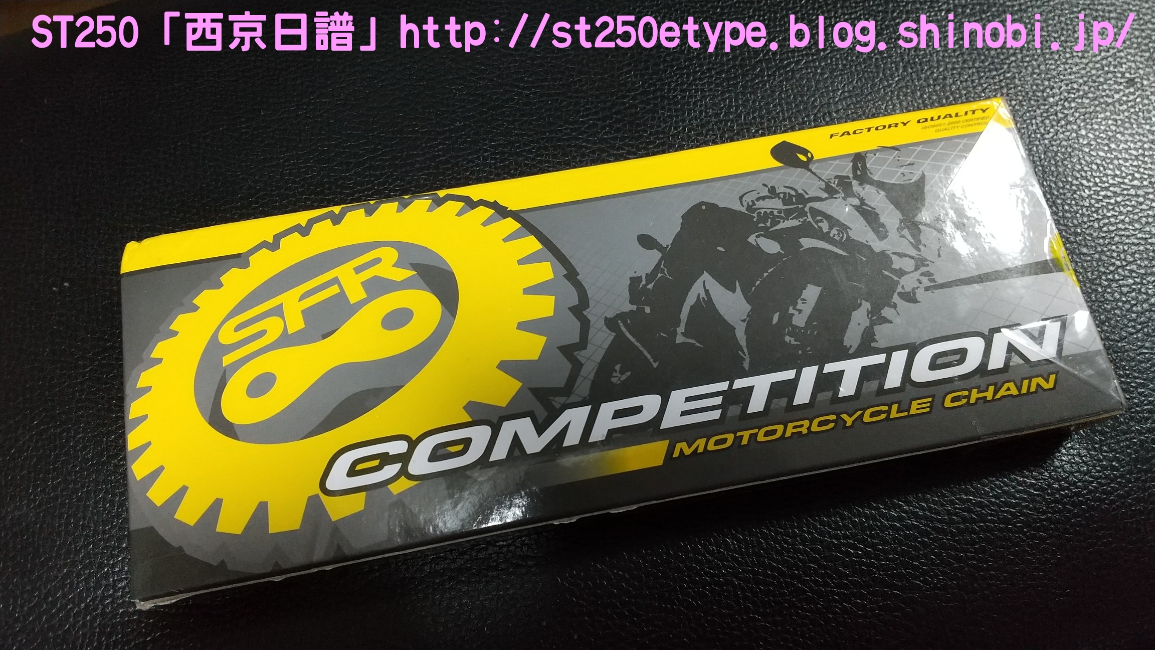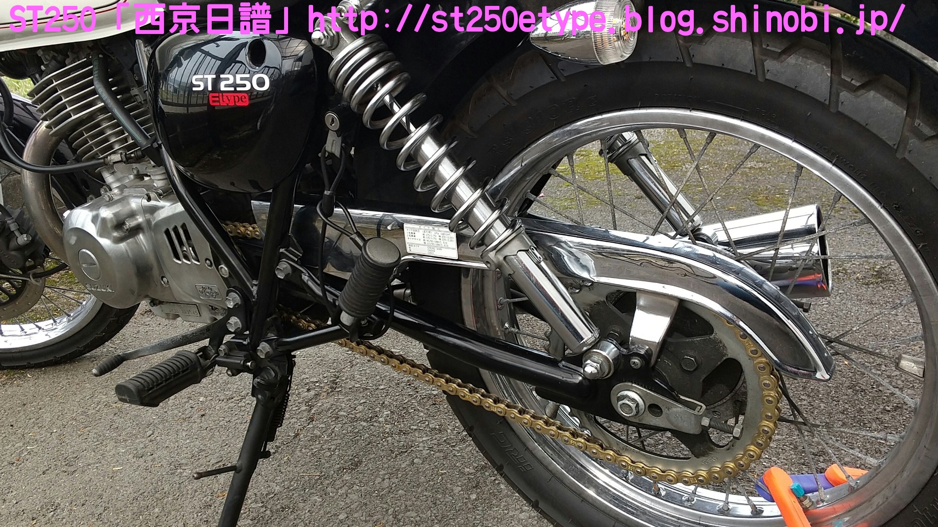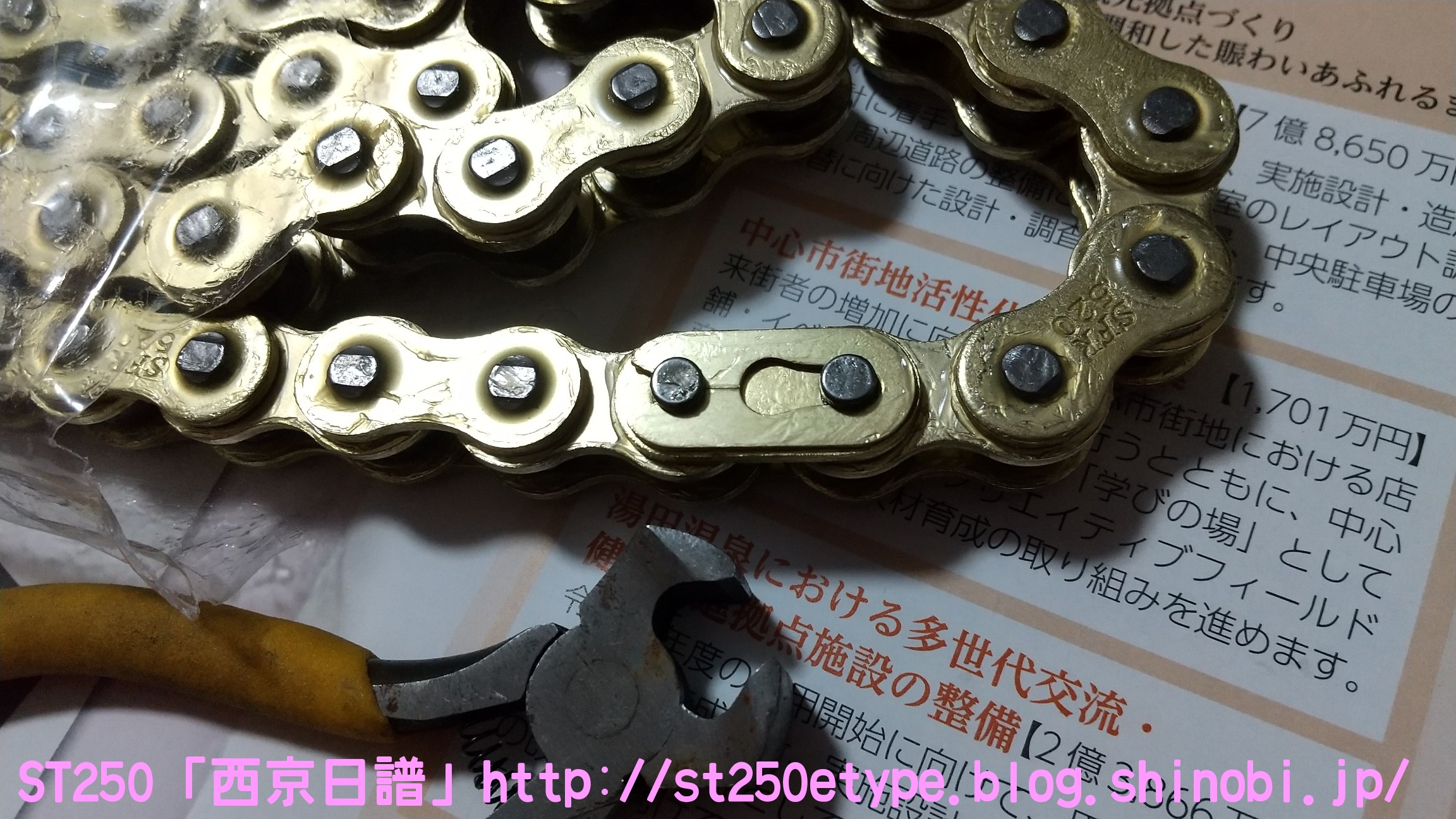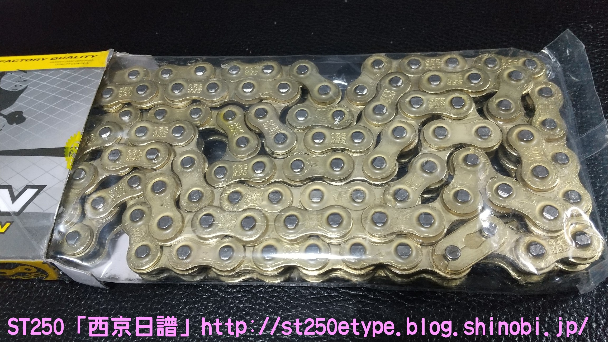 格安ゴールドチェーンに交換 日記 2021年03月31日 0 これまで装着していた、台湾製KMCのノンシールチェーンが雪で錆びてしまったので代わりのチェーンを探していたところ……いつから出始めていたのか、格安のノンシールチェーンを発見。しかもゴールドです。▲謎のメーカー調べてみると残念ながらというか、やはり中国製です。ネットショッピングで約1,300円これが送料込みだから驚きです。これだけ安いと全く使えないかもしれません。(愛用中の台湾製KMCのノンシールチェーンであれば、安く探しても約2,000円を越えてきます。)▲520サイズの110リンク▲包装が安っぽい他のメーカーであればホログラム付きのギラギラした包装ですが、まさかの透明という意外性▲クリップジョイントクリップを外すのは100均のエンドプライヤーが使いやすいです。しかしこのチェーンたど取り付けには別途ラジオペンチが必要でした。▲2コマ分を切断STは108コマなので、110コマから2コマを切断します。※取り付け作業は割愛します。鋼製束を使用した簡易ジャッキアップでの作業です。▲取付け後の様子ゴールドになってドレスアップの効果が得られました。往復40kmの通勤で数日使用した感触としては普通です。これまでと違和感ありません。ST自体、チェーンに左右される車体ではないことの方が大きいと思いますが。バイク(スズキ)ランキングへ PR
