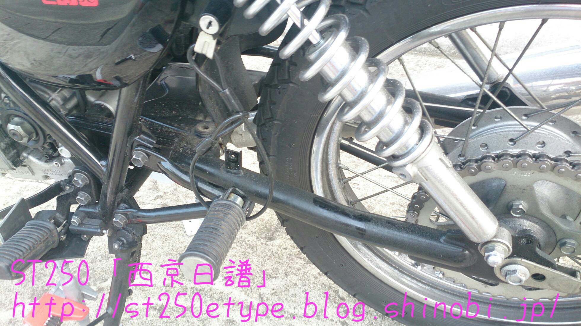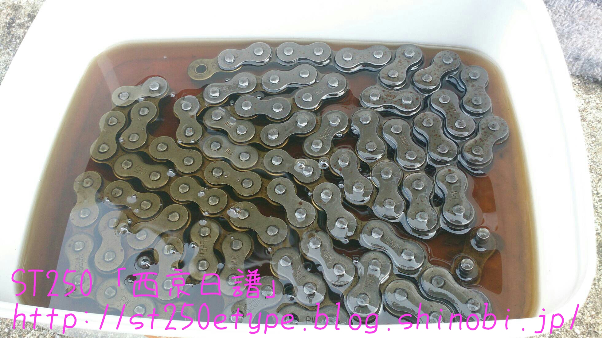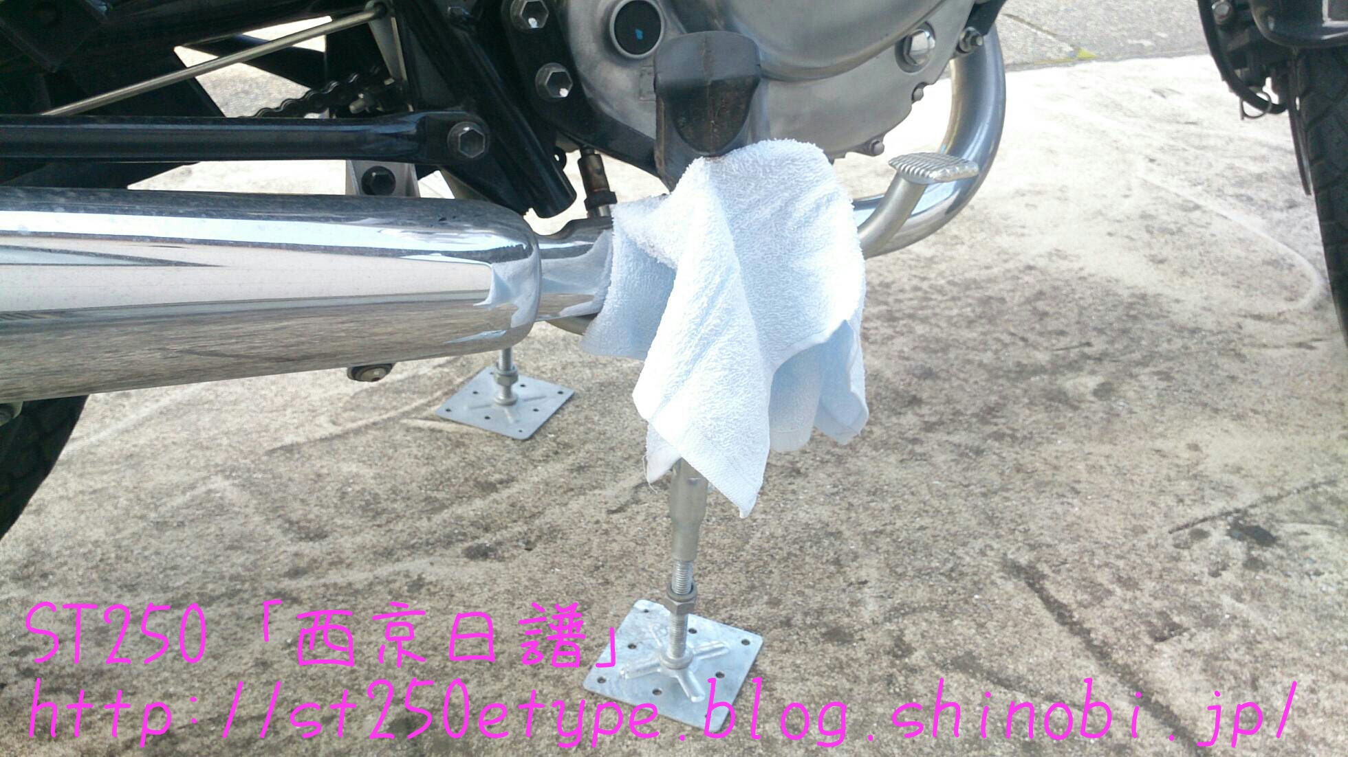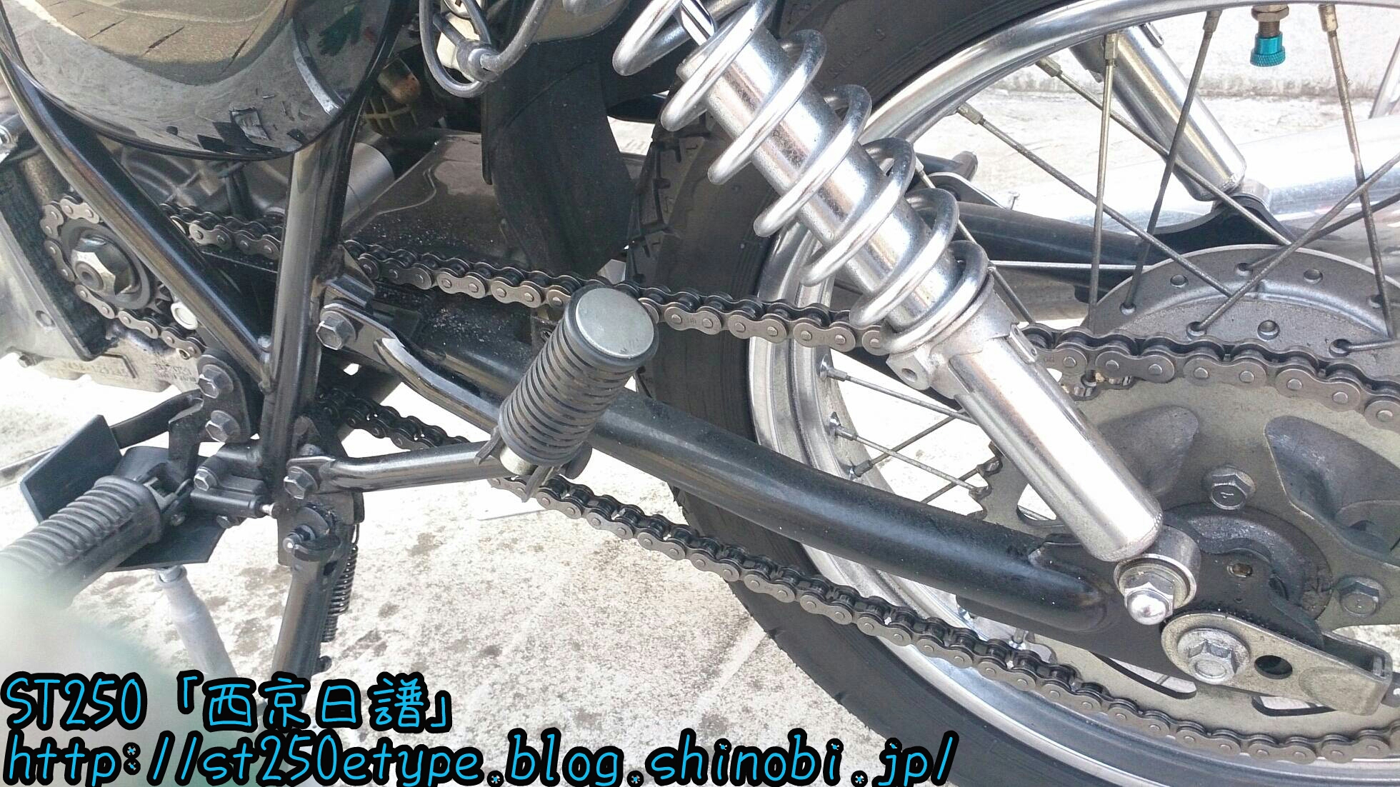 梅雨明けチェーン交換 日記 2016年07月18日 0 梅雨が明けました。梅雨の間はまったく整備をしませんでした。シリコンスプレーに頼って、洗車すらしてません。今後もそうするかもしれません。なるべく手間をかけずに維持したい。今回は、2300kmほど走ったところでレッドバロンにてオイル交換をしてもらいました。(本当は自分でオイル購入して実施する予定でしたが……)そして、オイル交換のタイミング(約3000kmごと)と同時に行おうと設定しているのが「チェーン交換」と「エアクリーナー交換」です。(R2.11.20追記 ※今はチェーンのローテ交換はしていません。捨ててます。)まずはチェーン交換を行いました。鋼製束を利用した簡易ジャッキアップです。第一にフロントブレーキの固定は必須ステップ下(マフラー側)に鋼製束を立てます。一応タオルを当てています。反対(スタンド側)に鋼製束を立て、こちらをレンチで締め上げて高さをつけていきます。これだけ上がれば十分、作業に取りかかります。チェーンの張り調整があるのでアクスルシャフトを緩めます。向かって左は17mm、右は19mmです。タッパーに保管していた、エンジンオイル浸けの予備チェーン。クリップジョイントは100均のエンドカッターで脱着外したチェーン、よく見るとプレートに錆びが浮いています。こちらは内側なので目が行き届かない部分です。今後は給油の際にしっかりとウエスでオイルを塗るようにします。チェーンの取り付けの前に、ここのカバーを外しておかないといけません。もちろんチェーンカバーも。チェーン取り付け。S字フックは意味はありません。チェーンの張りを調整して、それぞれのカバーを取り付けて終了です。チェーンの張りは、メーカー規定より緩めの40mmにしました。交換したチェーンは、再びタッパーにてエンジンオイル浸け。次回の出番まで休憩してもらいます。 ついでに、雨中走行で錆びてしまったマフラーエンドに錆びチェンジャー塗布。全面に塗りました。乾いたら黒染スプレーを吹いておしまいです。黒染めスプレーをしなければ、錆びるのが早いように感じます。(R2.11.20追記※この作業を繰り返していたら、メンテフリーでも赤錆が出にくくなりました。)今回はこれで終了です。「エアクリーナー交換」まで行う元気はありませんでしたので、次回にします。バイク(スズキ)ランキングへ