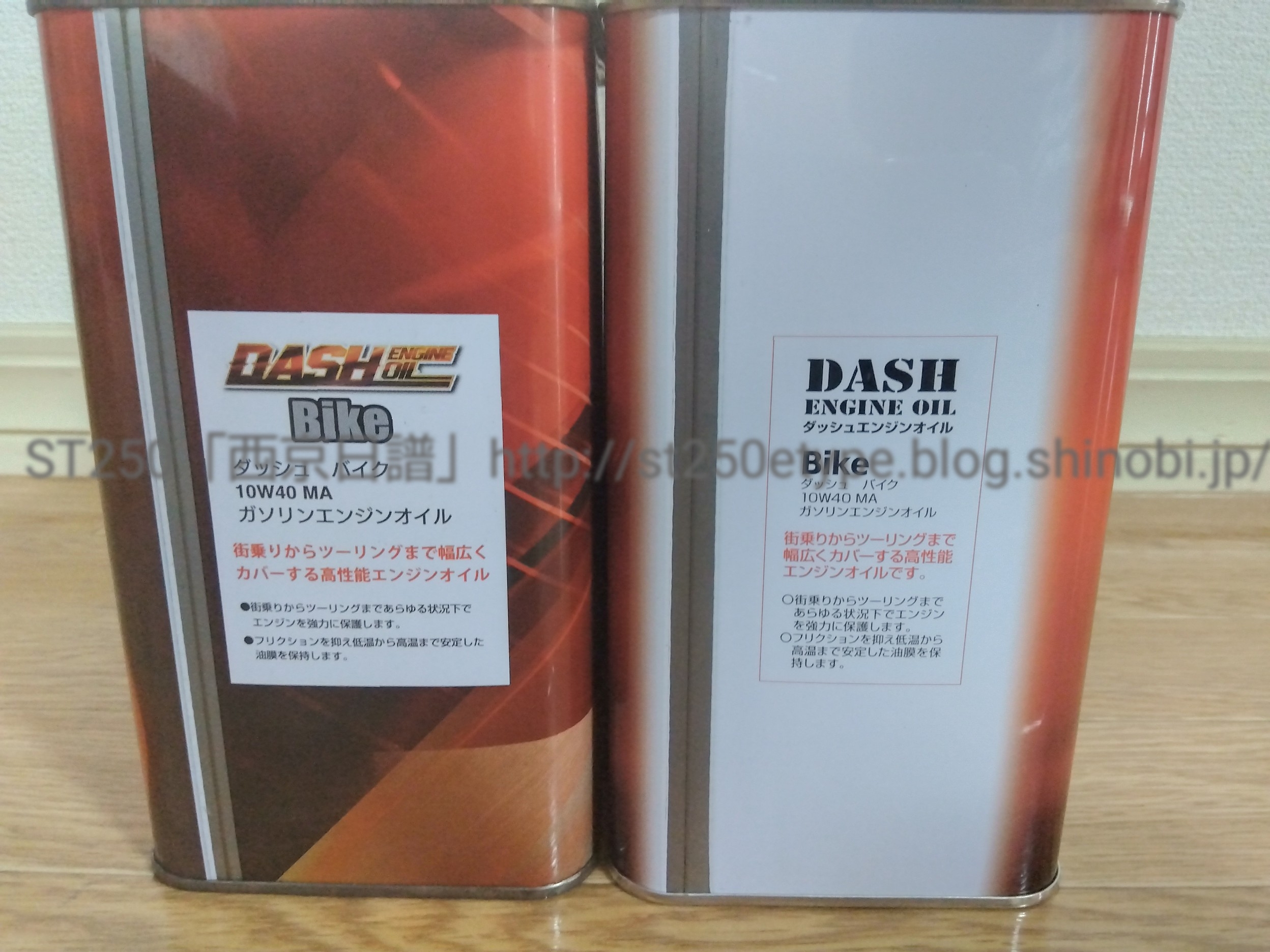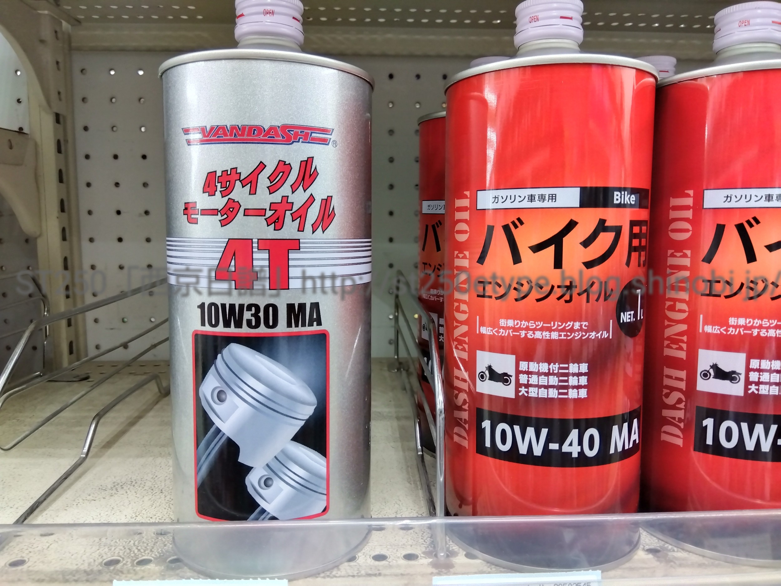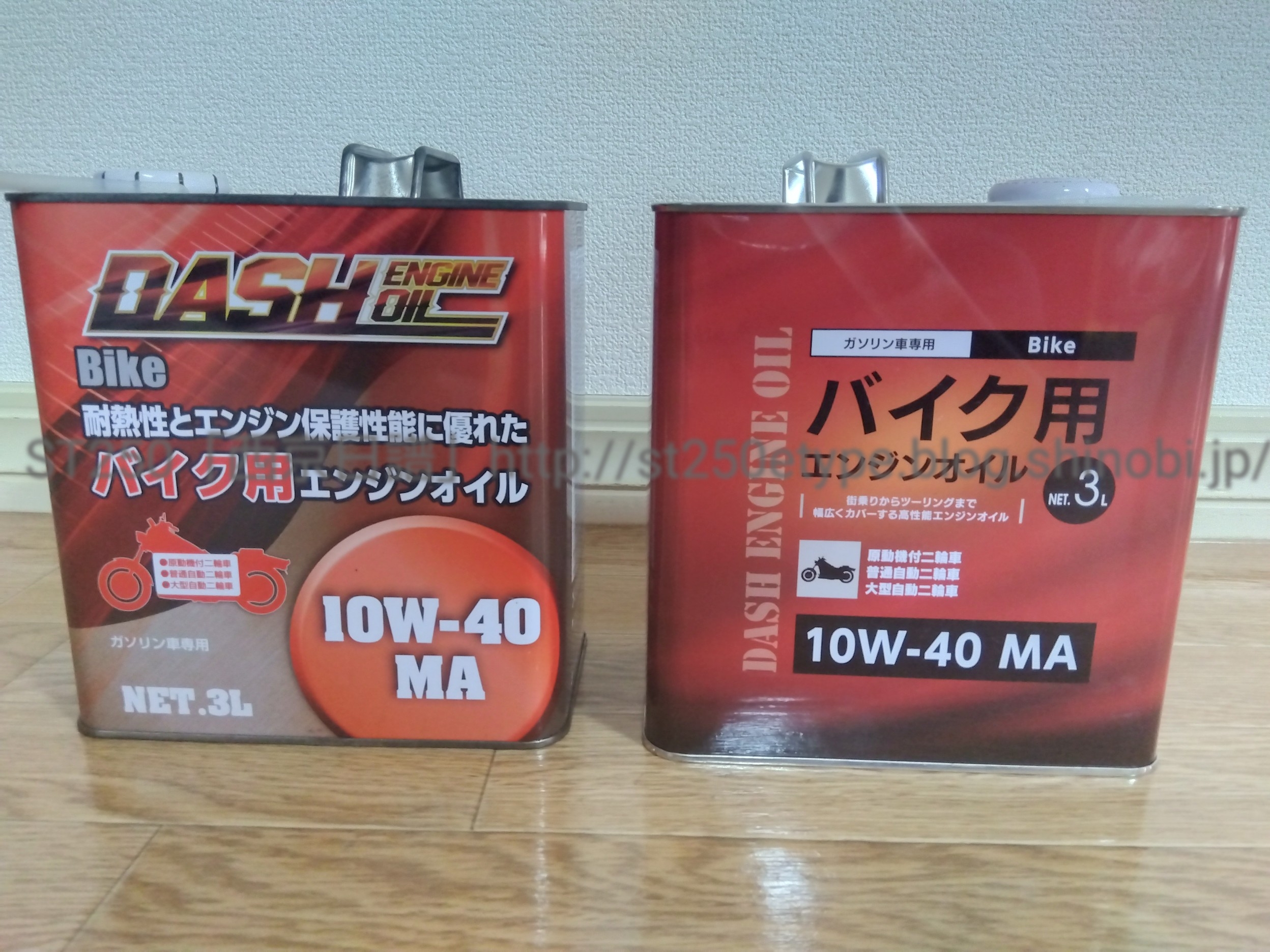 エンジンオイル購入(DASH)(R4.6.17) 日記 2022年06月17日 0 久々にエンジンオイルを購入した件です。ずっとレッドバロンのオイルリザーブを利用していたので、自分で交換するのは約4年ぶり(過去記事)。さて、購入にあたり、一応どういうオイルが今のSTに必要かを考えました。【オイルの選定条件】・近くのホームセンターでいつでも入手できること・安価であること・ST250が指定されている粘度と規格であること 粘度:10W40 規格:MA 又は MA1これはスズキのエクスターオイルのことですが、安さも重視するので今回は銘柄にはこだわりません。オイル粘度と規格を守り、そして価格を考慮してオイルを選定する。と、ある程度の決まりを考えてからホームセンター「ナフコ」へ。 ▲とりあえず目についたこの2種……写真左のVANDASHU(ヴァンダッシュ)は前に購入したことがあります。1L 税込で¥748以前はチェーンとエアクリーナーのメンテナンス用で購入(過去記事1、過去記事2)オイル粘度が指定のものとは異なるので今回は不要写真右のいかにも安価そうなデザインの缶はDAHS(ダッシュ)という銘柄です。初め気付かなかったけど、デザインが変わっている(後述)。ナフコの限定デザインかな。こちらは粘度が希望の10W-40なので採用(他にもヤマハのオイルなどあったけど、価格的に不採用)※余談ですが、「VANDASH(ヴァンダッシュ)」と「DASH(ダッシュ)」を混同しているみんカラやブログの記事を見かけますが、恐らく全くの別物ではないかと思います。別に時間を費やして調べている訳ではないですが。 ▲次に、1L缶と3L缶で迷う……STの交換時オイル量って、フィルター交換なし:1.4Lフィルター交換あり:1.5Lだったはず。ということは、3L缶の方が2回分でわずかに余るくらいで足りなくなる心配がない。ちなみに本日の商品価格3L缶:¥20501L缶:¥7593L缶を1Lに換算すると¥683となり、実用性と価格から3L缶を購入 ▲過去のデザインとの比較……(左:前回、右:今回)偶然、過去に購入していた変更前のパッケージがあったので比較このデザインの差は何だろう?と、側面の表記をみて納得 ▲旧(というか前回購入時) ▲新(というか今回購入分)発売元:株式会社ナフコと書かれてあるので、このパッケージはナフコ専用ということになります。供給元:AERA ENERGY(株)は変わらず、(アエラエナジー:福岡県直方市の卸売業、リンク:公式HP)(コスモ石油ルブリカンツ株式会社OEM潤滑油製品販売代理店)製造元:コスモ石油ルブリカンツ(株)が新たに追記どちらもHPを見ましたが、今回の製品情報はありませんね。とにかく、そういう経路で生産・販売されているオイルのよう。 ▲反対側の表記……特に変わらない街乗りからツーリングまで幅広くカバーする高性能エンジンオイルです。・街乗りからツーリングまであらゆる状況下でエンジンを強力に保護します。・フリクションを抑え低温から高温まで安定した油膜を保持します。この謳い文句が本当だとしたらSTにはジャストな選択だと改めて実感実際のオイル交換は後日併せて、別途購入したEZバルブの取付を予定▲おまけバイク(スズキ)ランキングへ