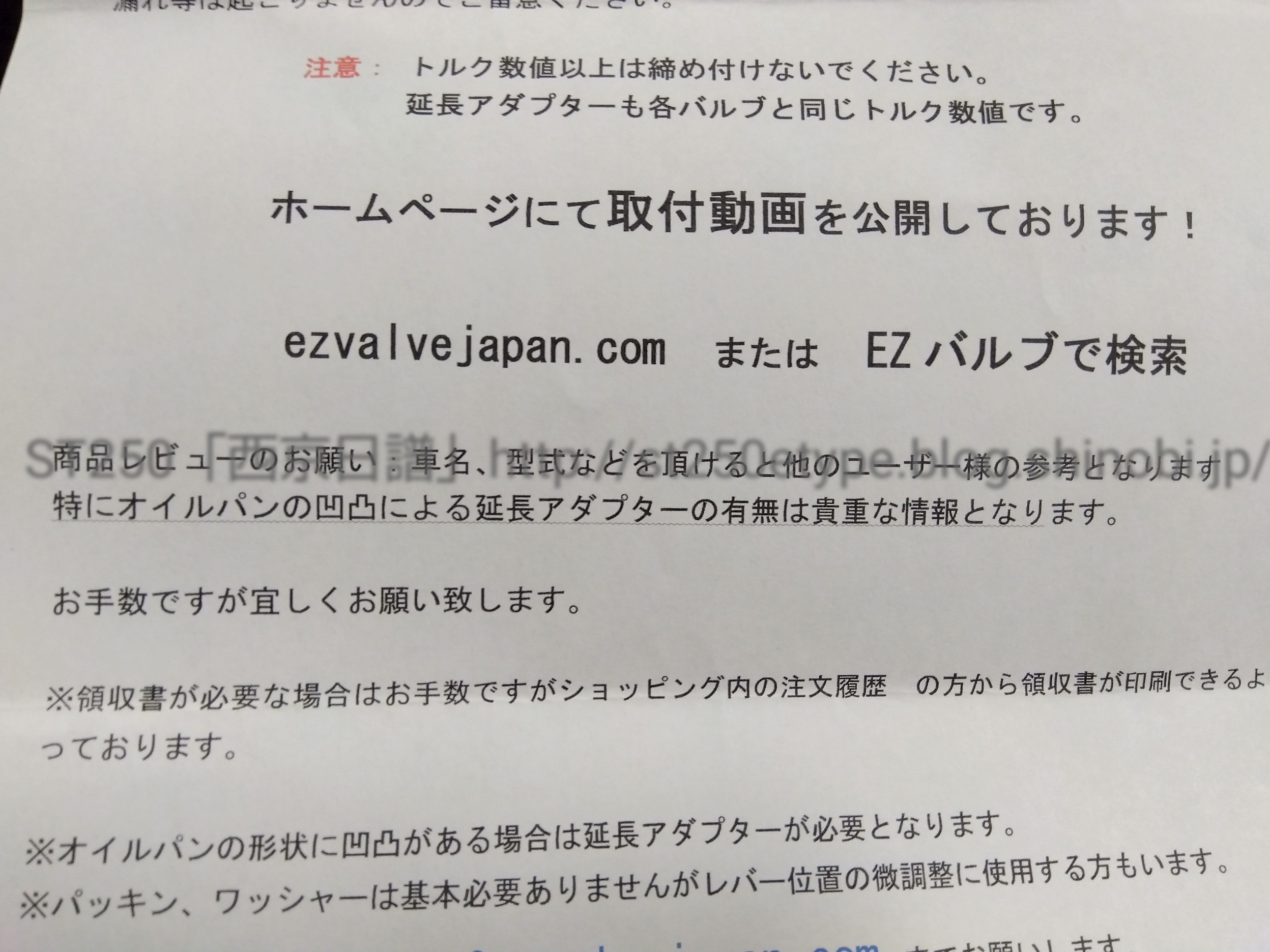 EZバルブを購入(R4.6) 日記 2022年06月17日 0 今回はパーツ購入の件購入したパーツは、オイル交換を容易にするアイテムです。商品名は「EZ OIL DRAIN VALVE」略して「EZバルブ」です。 ▲同封だったEZバルブのパンフオイル交換がワンタッチでできるEZ イージー・バルブ・オイル抜きはレバーを回すだけ・装着は簡単・時間と労力を大幅に削減・手が汚れず、環境にも優しい・ネジ山もつぶれません要は、オイル交換時によく着脱するオイルドレンボルトと交換することで、オイル交換作業が効率よくできるようになるものです。▲内部の仕組みハンドル・レバーを開閉するだけで内部のオイルを排出できるようになっています。このレバーは本体の溝に噛むようにロックされているので、走行中に誤作動することはなさそうです。(ただ、どんなこともそうですがイタズラには耐えられないという危惧はあります。その場合はすぐに110番で通報しましょう) ▲サイズ表ST250は「EZ-111」が適合します。 ▲同封の書面……注意書きが書いてある▲赤線部バルブを締めすぎないことです。とあります。通常、ドレンボルトはトルクレンチを使って規定トルク値で締め付けますが、このEZバルブは最後に1/8回転ほど締め付けるだけでいいそうです。▲延長アダプターの件(透かしと重なっていて見えないですが……)バイクの車種ごとに適合のアドバイスができるよう、購入者にレビューを求める内容です。商品レビューでの情報ですが、ST250はオイルパンが凹んでいますが、延長アダプターは必要ないことが分かっています。 ▲EZ-111(オモテ) ▲別途購入品……キャップ(小)EZ-111(14mm-1.25):¥2,780キャップ(小):¥280送料(一律):¥360合計:¥3,420ドレンボルトの交換の手間を省くために、約¥3,500をかけるべきか悩みましたが……【レッドバロンでの交換費用】 オイルリザーブ加入:¥9,000 又は ¥18,000(初回のみ) フィルター交換なし:¥590(技術料) フィルター交換あり:¥2,020(フィルター代+技術料+税) ※混雑時、待ち時間あり ※定休日あり【今後、自分でやる場合】 フィルター交換なし:約¥700(オイル代) フィルター交換あり:約¥1,800(オイル代+フィルター代+廃油袋等)オイルリザーブって1Lあたり¥600をまとめ買いしてる計算になるから、単純に「技術料」の違いになってくるのか。店の制約が無いだけ自分でやる方がまし?レッドバロンでマフラー凹んだし、バーエンドのロックナット紛失されたり、整備力(というか客への配慮)に一定の不安あり?自分で交換しやすくなるから、バイクにも良い?ま、なんでもやってみないと評価はできないものですね。後日、オイル交換と同時にドレンボルトをEZバルブに交換します。バイク(スズキ)ランキングへ