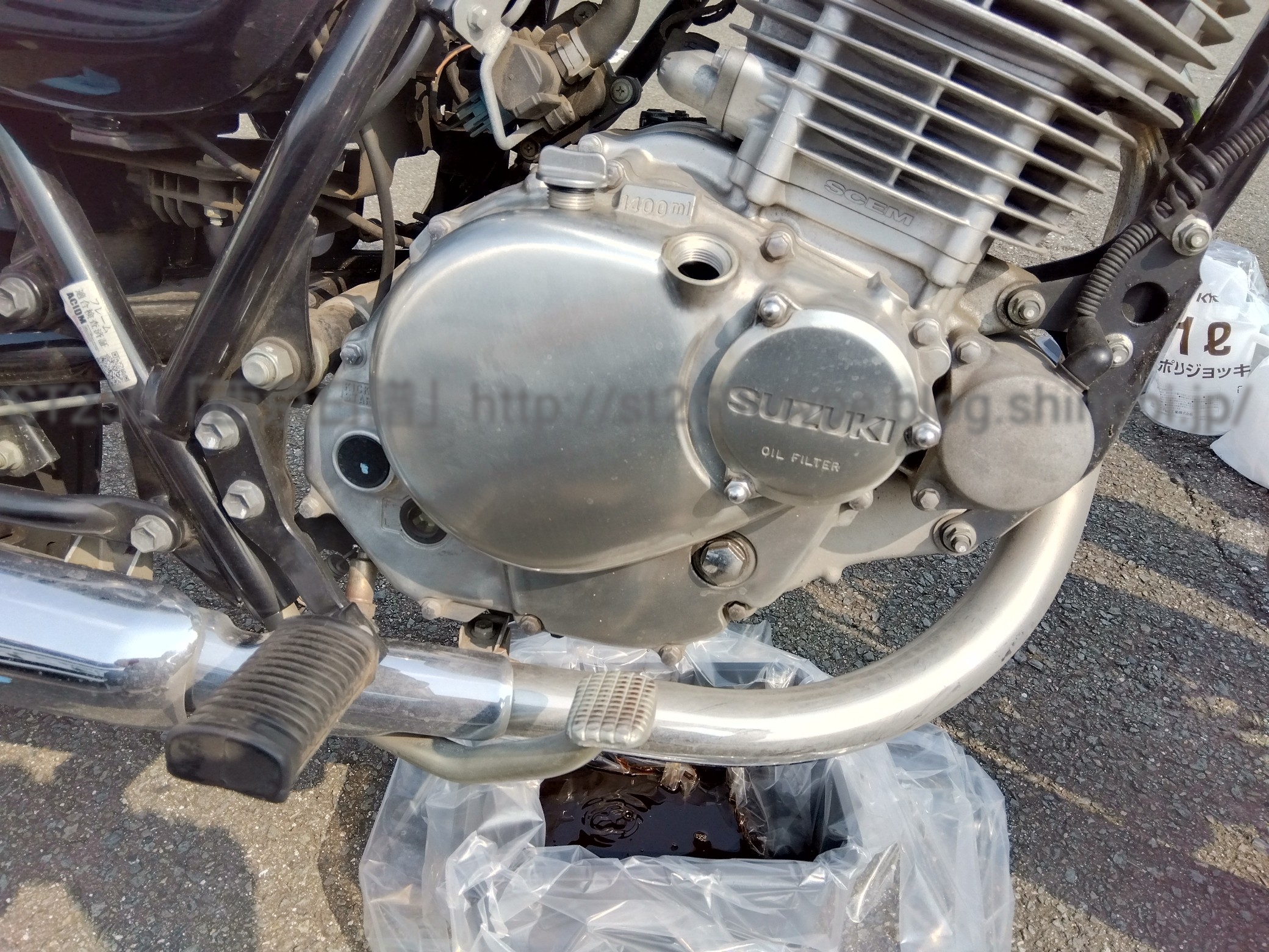 オイル&フィルター交換+EZバルブ(R4.6.18) 日記 2022年06月19日 0 今回はオイル、フィルター交換、併せてEZバルブの取付けの件です。・使用したオイルについて(過去記事)・EZバルブについて(過去記事)レッドバロンでのオイル交換から3,000km超走ったので、このタイミングでセルフで交換します。さらに今後のセルフ交換の面倒さのハードルを下げるため、EZバルブを装着します。この時期は暑いので、朝起きて早速作業に入る。軽く近所を走行して、エンジンを暖めドレンボルトを失くさないよう、あとオイルが熱いので手に掛からないよう、慎重に回して外す。▲確かにドレンボルトを慎重に回すのが面倒……(記事の作成中に気付いたことですが、ドレンボルトが廃油の袋の中に落ちたまま回収していない……) ▲廃油酷使しているのでもっと黒い廃油を期待していましたが、思ったよりまだ茶色でした。使用の状況:一般道を毎日40km、毎月800km超の走行 ▲オイルフィルターも交換 ▲取り外したフィルターレッドバロンで使用しているフィルターでしょうか。検索してもヒットなし。明細を見ると、このフィルター代は¥600になっています。フィルターカバーを開けると、写真のようにオイルが垂れてきますが、廃油のオイルパンを下に置いておけば問題ありません。まだ熱いので、注意しながら取り外します。 ▲使用するフィルター類フィルター:デイトナ スーパーオイルフィルター(品番 67933)グラストラッカー、DR250/R、イントルーダー250、他Oリング①:キタコ Oリング〈OS-04〉※純正品番(09280-15007)に適合Oリング②:キタコ Oリング〈OS-05〉※純正品番(09280-72001)に適合表示価格を合計すると¥1,500位になりますがネットショッピングなのでもっと安く買ったと思います。購入したのが4年前なので覚えていません(^^;) ▲取付けOリングは軽くエンジンオイルを塗って取り付けるようです。フィルター交換は、物さえあれば簡単ですね。(こんなに簡単なら前からやっておけばよかった。)▲EZバルブの取付けドレンボルトの代わりにEZバルブを取り付けます。手で締められるところまで回して、最後にモンキースパナで1/8回転させて終わりです。これも簡単です。▲使用したオイルナフコ ダッシュオイル 10W-40最後に使用するオイルを1500ml投入して、オイルフィラーキャップを着けて終了です。あとは廃油の処理は自治体の決めるところに拠りますが、可燃物になるところがほとんどの気がします。オイル缶は資源ではなく不燃物や金属類になるはず。持ち込み無料の回収業者で捨てている人がいますが、本来は間違いなのでは?この一連の作業でも簡単なんですが、EZバルブがあるとどれだけ手軽さを感じるようになるか、次回以降のオイル交換で確かめたいと思います。バイク(スズキ)ランキングへ