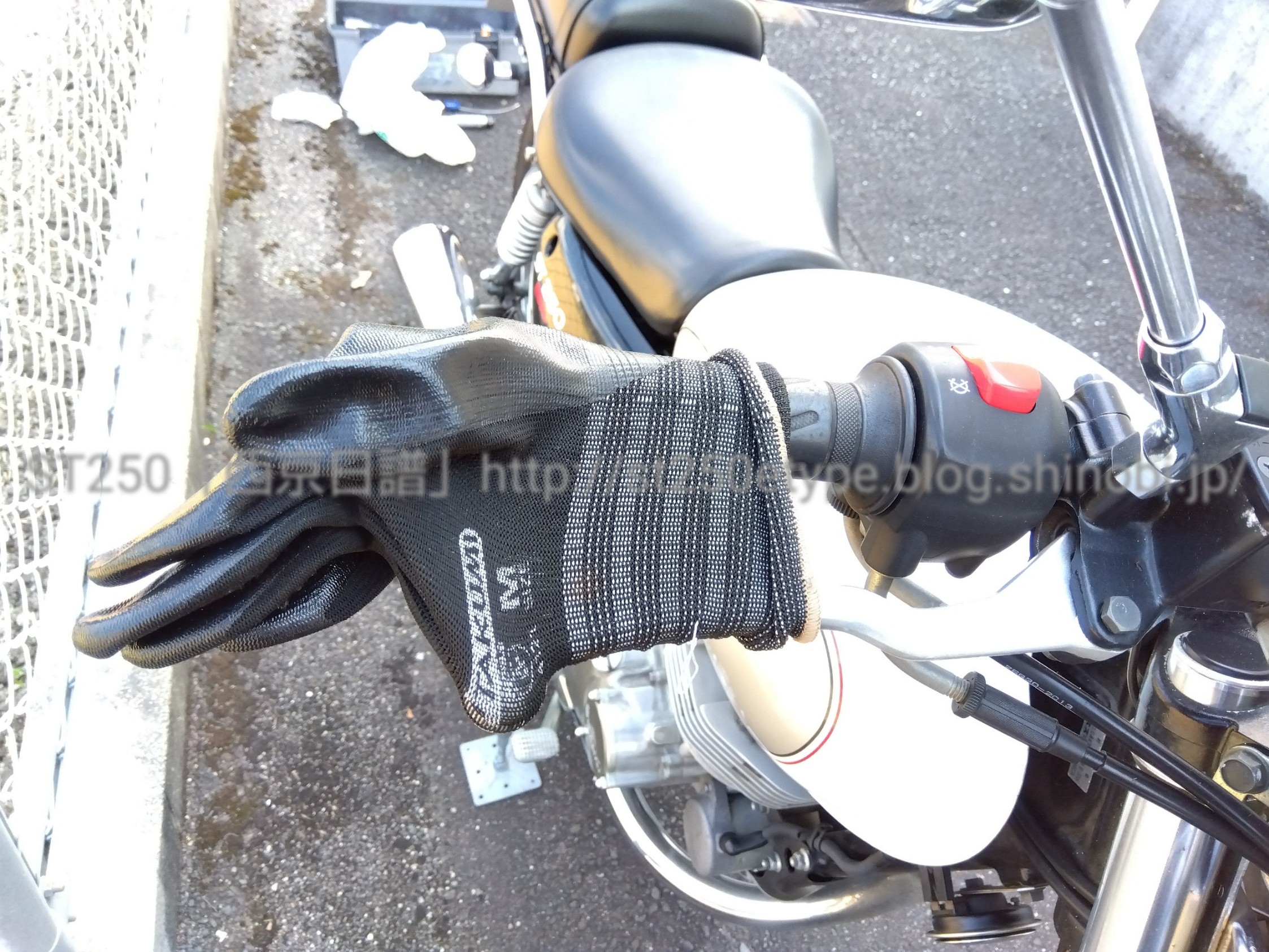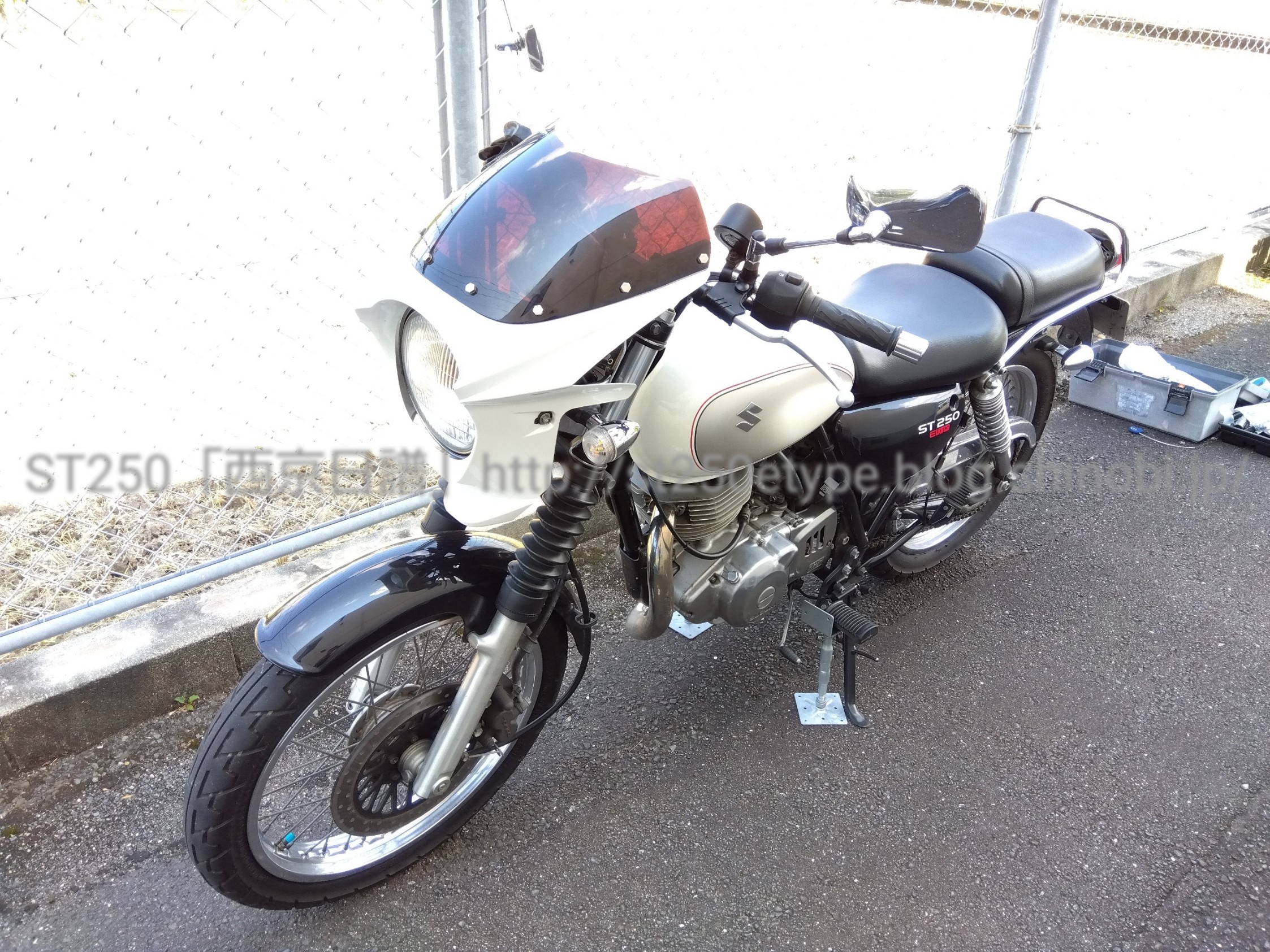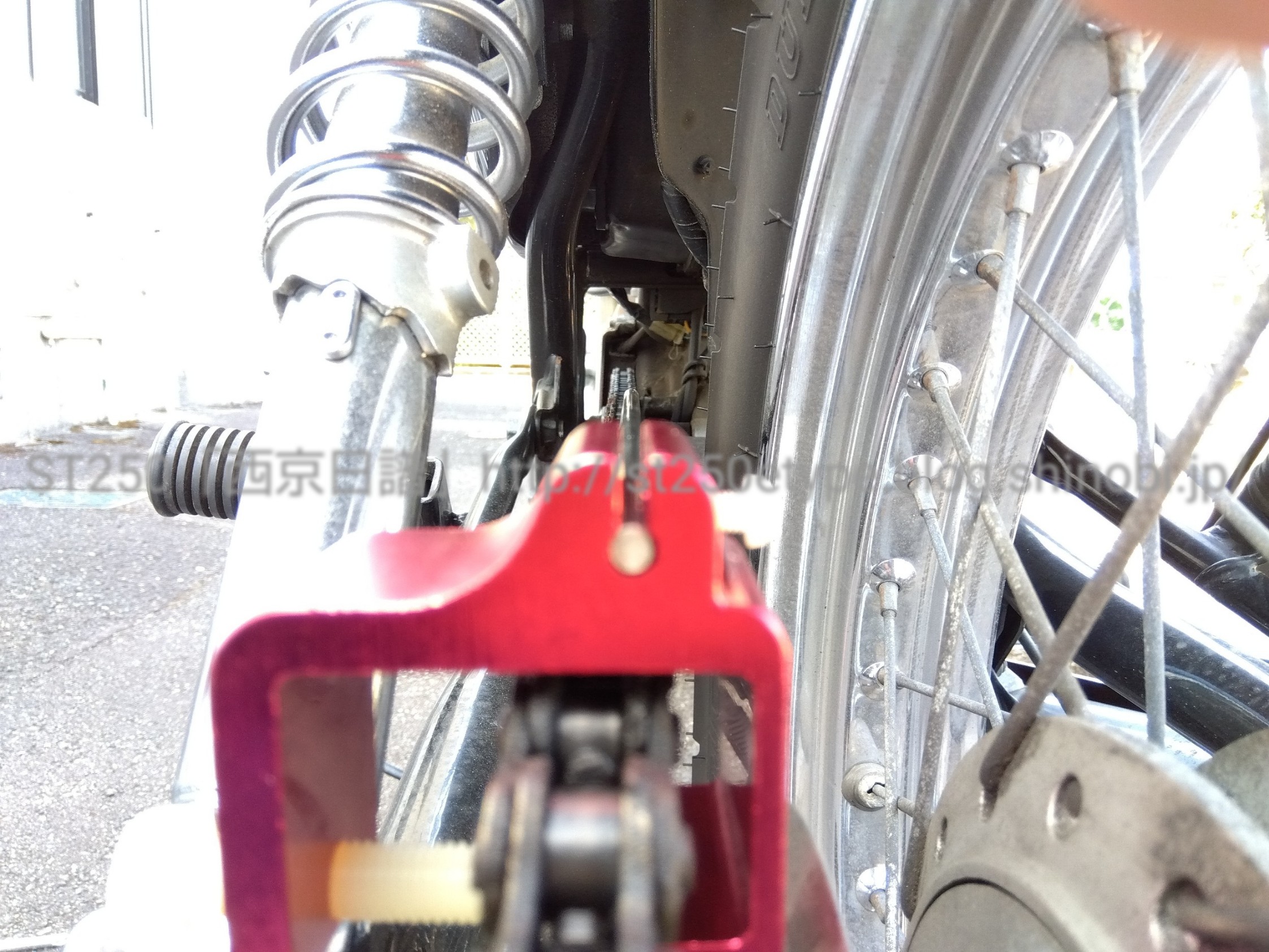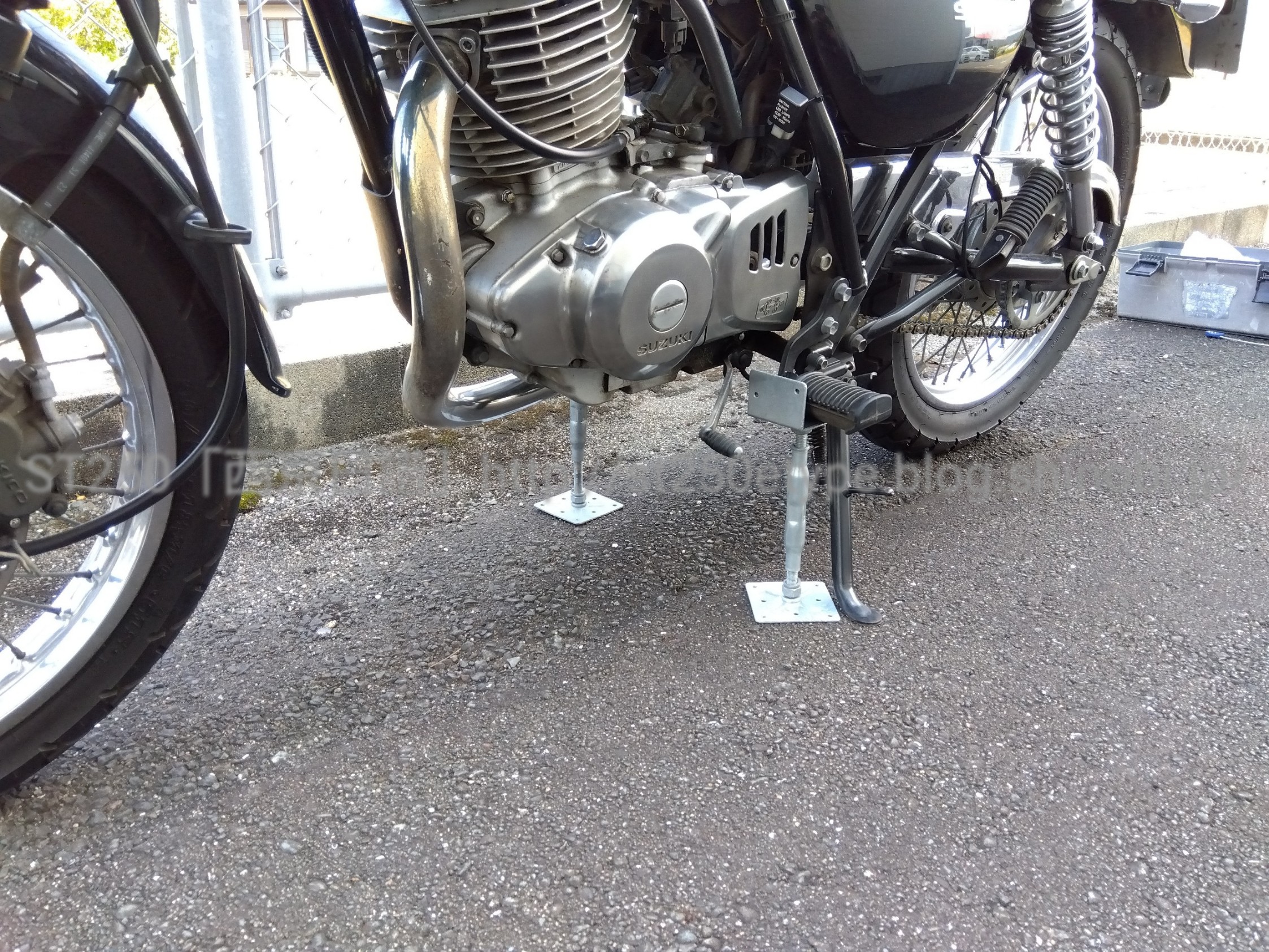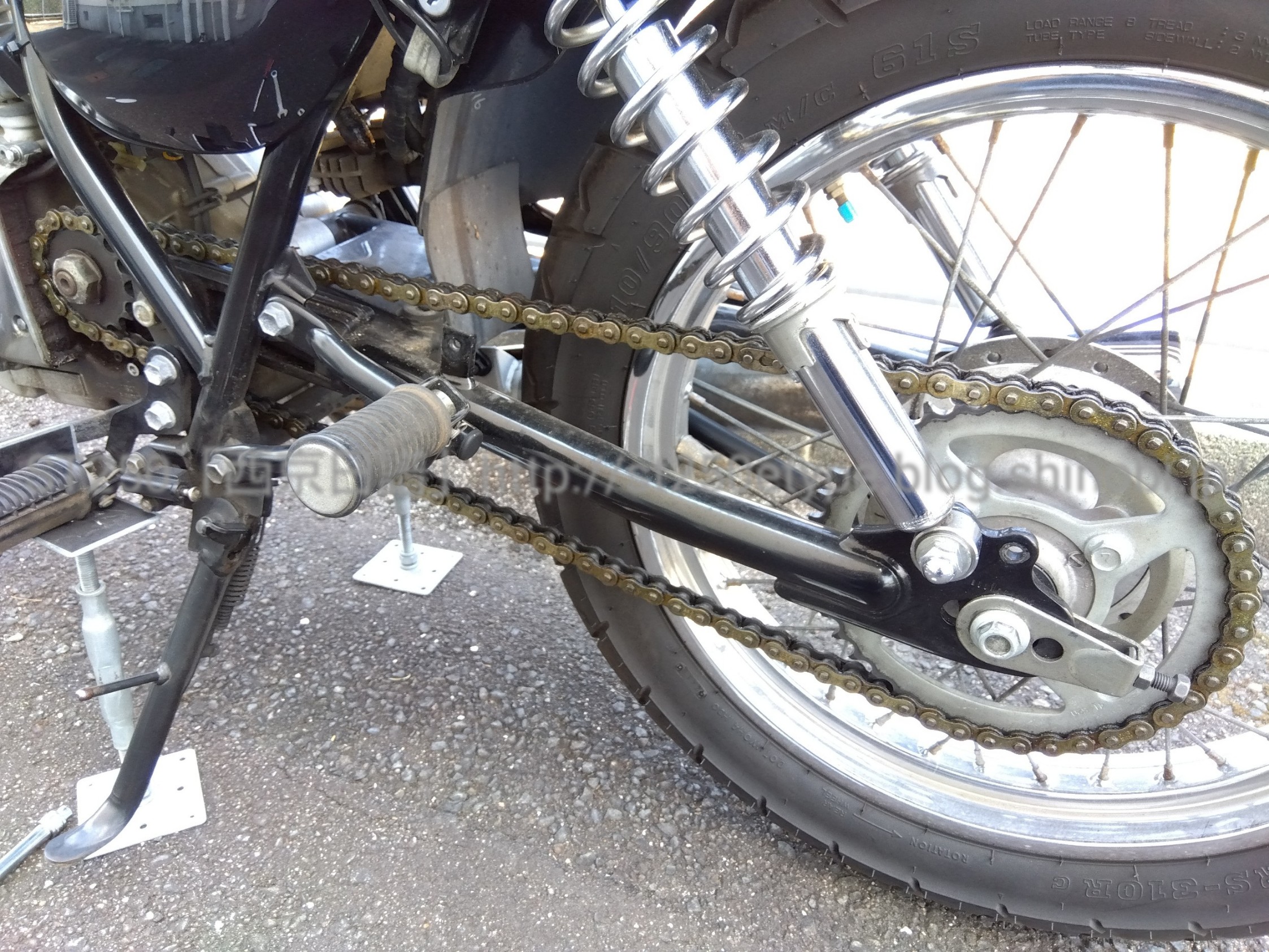 ジャッキアップとチェーンメンテ 日記 2022年09月11日 0 今回は久々にチェーンを調整した件です。 ▲ジャッキアップは鋼製束後輪を浮かせるため、相変わらず野蛮なジャッキアップ法をしています。こんなふざけた記事を公開していると、いつか誰かに叱られそうな気がしますが……(-_-;) 鋼製束を使うことの条件・硬い地面(コンクリート、アスファルト等)・地面が平坦(緩い坂、波打つようなコンクリでは駄目)・広い場所(倒して公共・他人の財産に傷をつけない)・自己責任以上が満たせない場合は使うことはできません。なんせ、横方向の力に非常に脆弱ですから。作業中もフラついて揺れて安定感はありません。 ▲フロントブレーキ固定ハンドルは左に切り、忘れずにブレーキ固定する。 ▲チェーンカバー類は先に外しておくリヤのアクスルシャフトやチェーンカバーなど、力を加えなければならない作業は、タイヤが地面に接地している状態で作業する。(やっぱりユラユラ揺れるから)さて、本題のチェーンです。 ▲アライメントツールチェーンの音がゴリゴリと鳴っていたため調整してみたけど、アライメントはそんなに狂いはなかった。チェーンのテンションが張りすぎていたようなので、少し緩めた。一番の原因は、スプロケットの変更をしてからも変わらず108コマのチェーンを使用していることかなと……少し詰めなければいけないようです(-_-;)現在使用している中華チェーンの交換の時に、キチッと合わせたいと思います。バイク(スズキ)ランキングへ