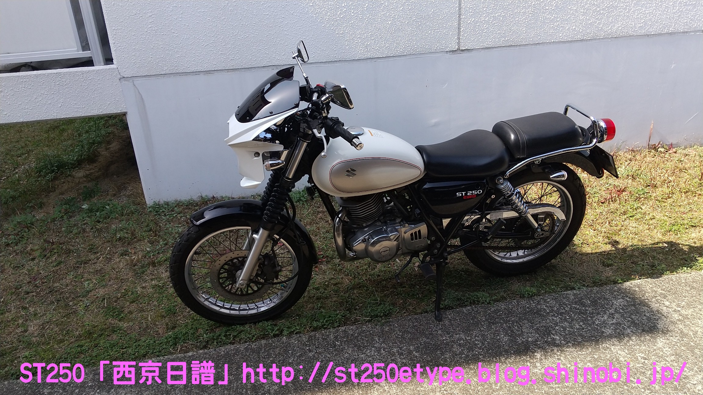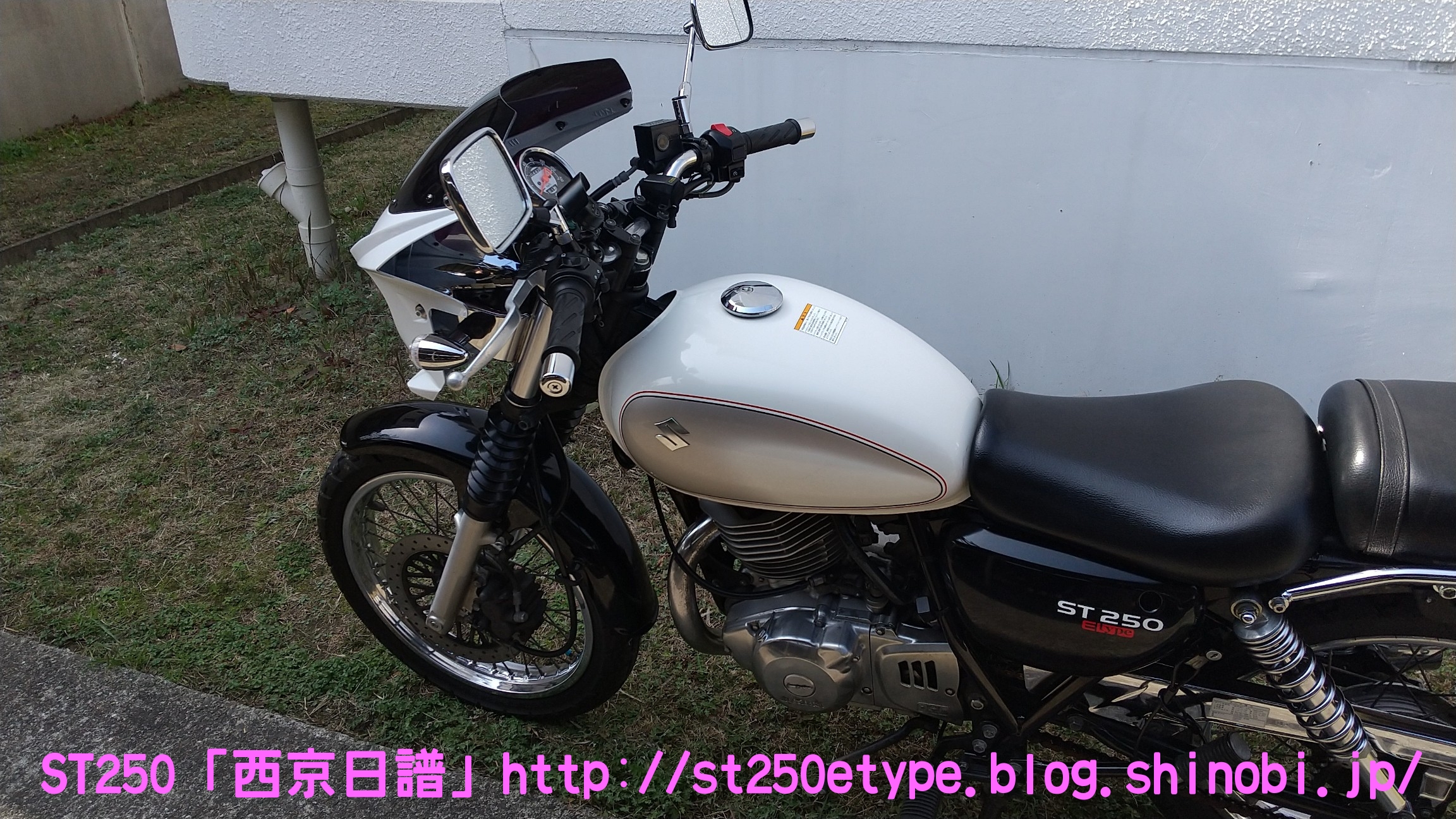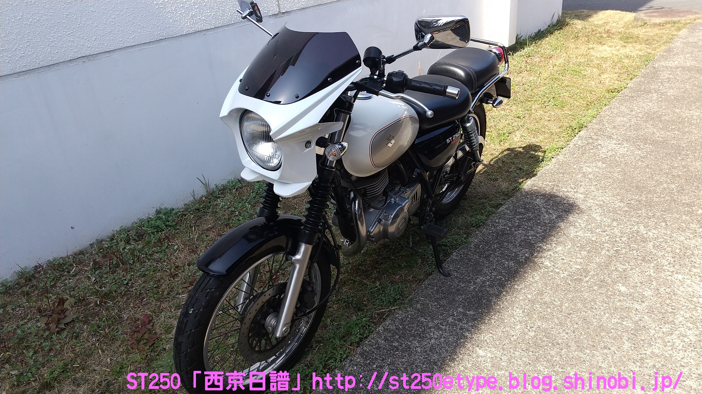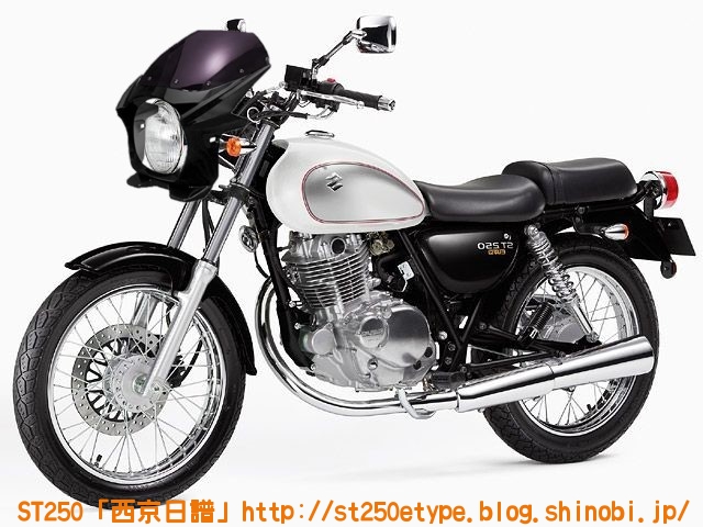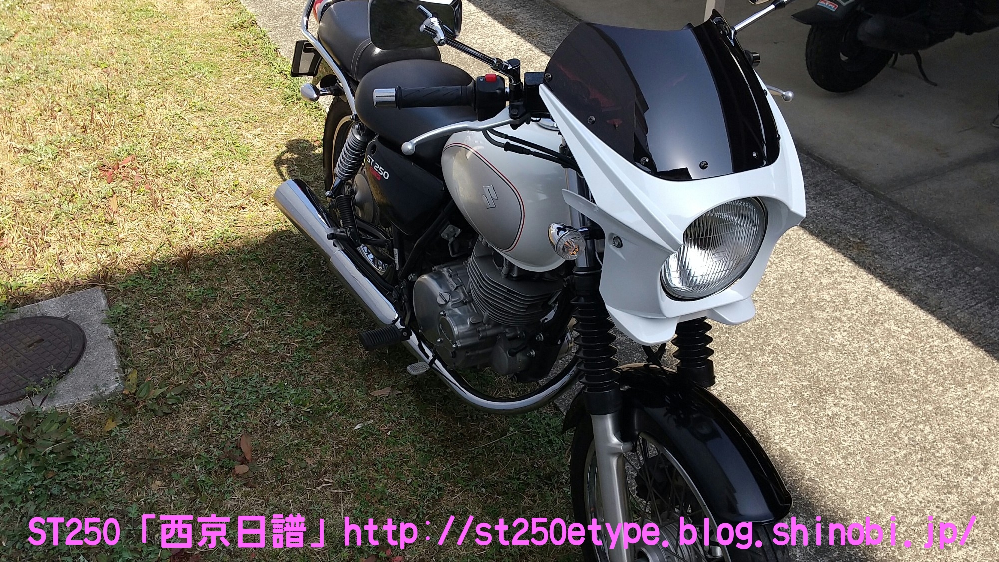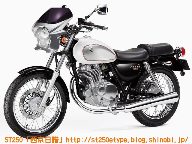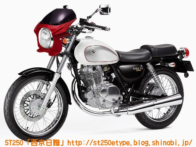 カウル色の選定 日記 2021年02月13日 0 STにカウルを付けようと考えています。以前から、フロントマスクを装着したスタイルもいいな……と思っていましたが、一番の理由は近々高速道路で長距離を移動する予定があるからです。高速道路の走行で絶対の条件は「フロント(ドライブ)スプロケの16丁化」です。幹線道路でも最高速度の維持が楽になりますから高速道路では尚更です。次に走行風をどうするかを考えた時に、やはり風防があると幾らか違うでしょう。可能な限り腹部~胸部への抵抗を抑えられれば、もっと高速道路も移動が楽になると思います。ノーマルの外見を活かすのであれば、透明のバイザーがあります。ライト横の固定部で挟むだけで装着も簡単、価格も2千円~5千円と手頃。フロントマスクは「ビキニカウル」と検索すると商品が出てきます。本当なら、シックデザインのコメットやクラシカルなデザインが良いのですが、それだと価格が5万円ほど。今はまだお試しで着ける程度なので、アマゾンなどで売られている安物を探します。4千円~5千円の安物とはいえ、レビューを見ると台湾製でそこまで悪くない様子。カラーが赤、青、白、黒、シルバーの5色の展開。ここからが本題です。普通ならバイクカラーに合わせてカウル色も選ぶことで統一感や純正感が出るものだと思いますが、厄介なことにうちのSTはタンクカラーがパールホワイト、フェンダーその他のカラーがブラックと全然違います。挙げ句タンクも単なるパールホワイト一色ではなく微妙にシルバーのグラデーションがかかっています。つまり、今の検討段階では白、黒、シルバーの三つ巴状態です。画像で検索してもイメージが湧かなかったので、合成してみました。Windowsのペイント3Dというエディタを使用、今は随分便利になっていますね。比較用のノーマルブラックホワイト(パールではない)シルバー遊びついでに赤現段階での印象ブラック……タンクが浮いてる気がする。ホワイト……パールホワイトなら有りかも。シルバー……後づけ感が強いかも。こういったものは、深く考えては頭を冷やす……を繰り返して納得のいくものを選ぶことができると思います。もうしばらく考えます。バイク(スズキ)ランキングへ
