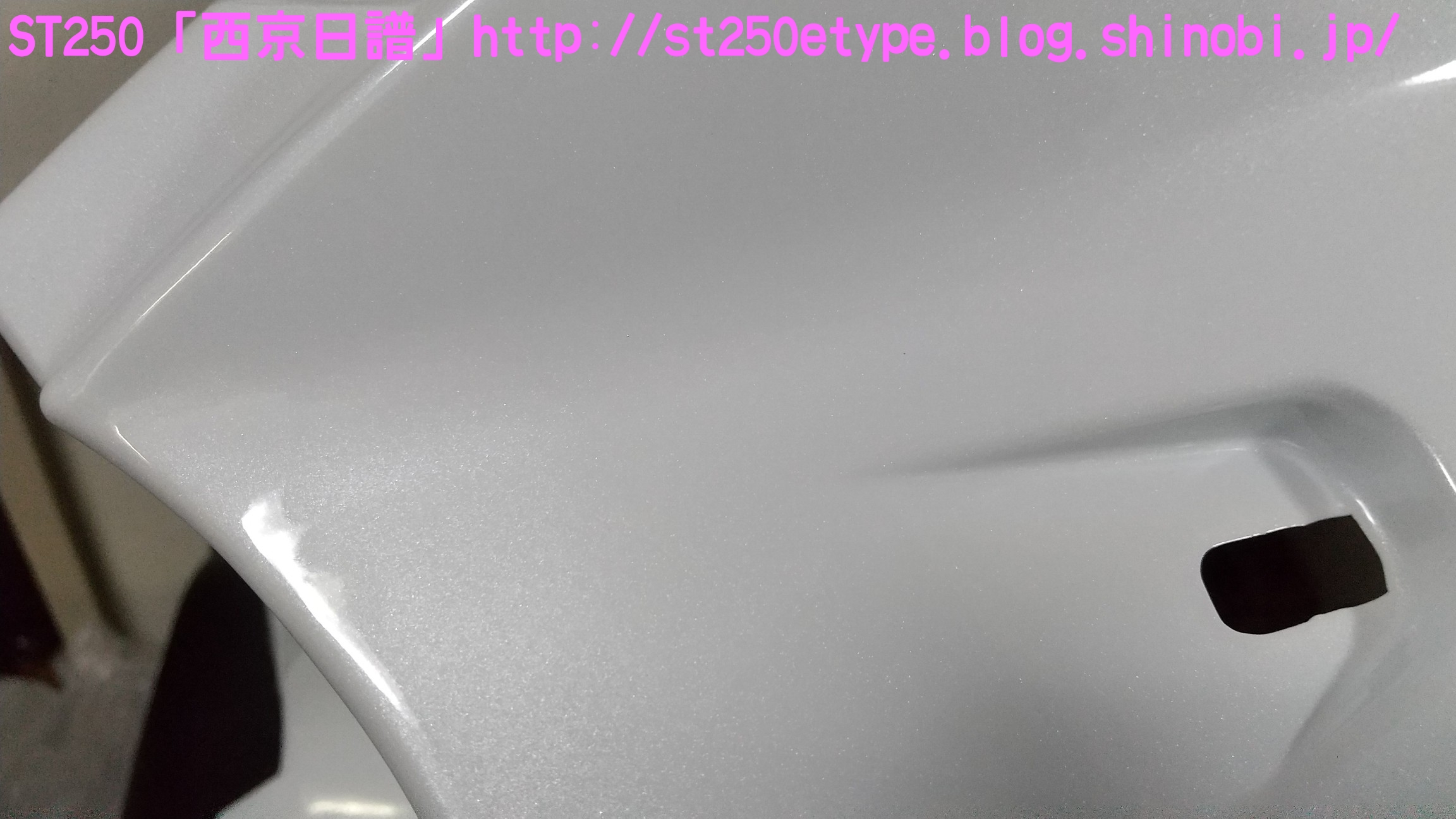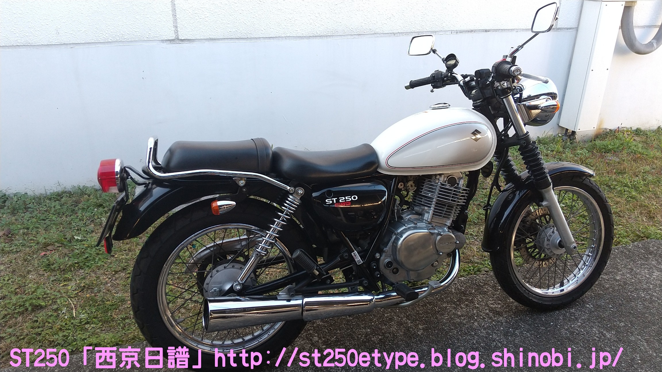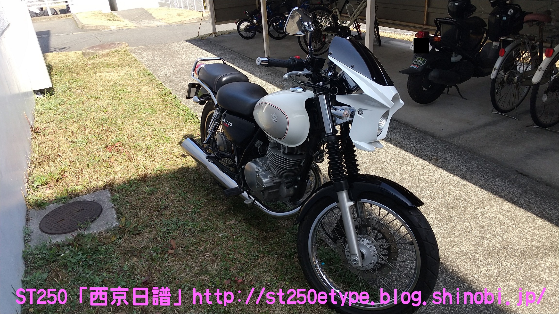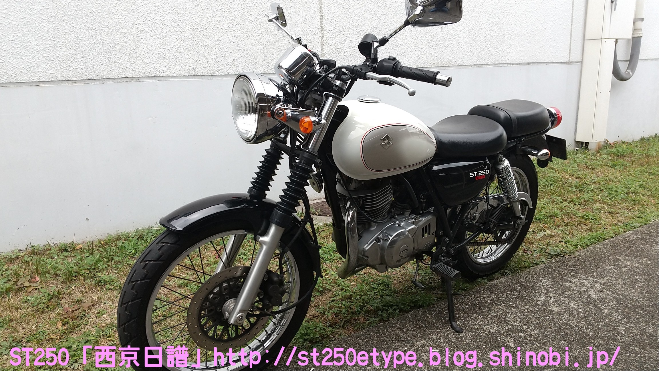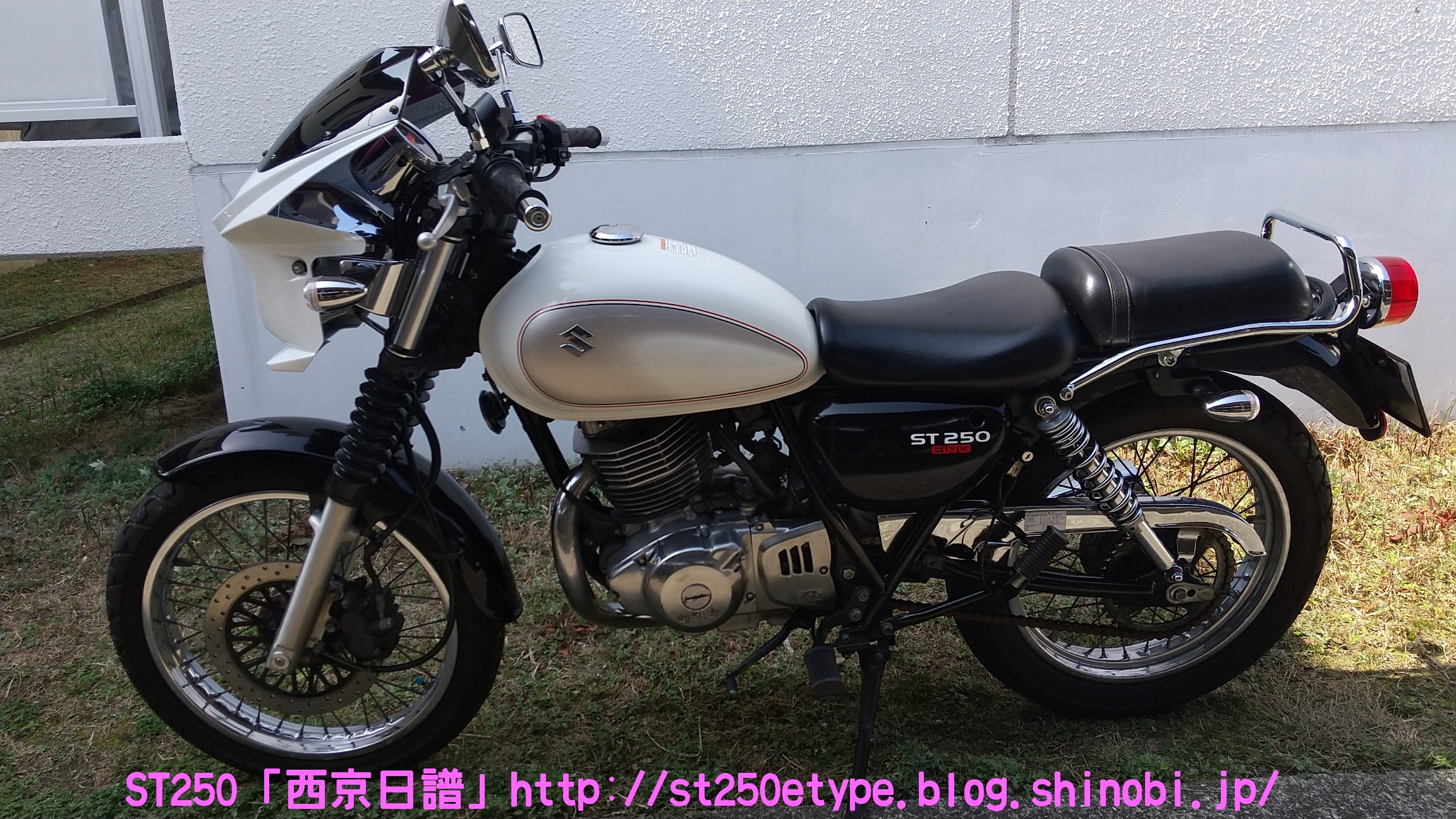 カウル色の選定 日記 2021年02月13日 0 STにカウルを付けようと考えています。以前から、フロントマスクを装着したスタイルもいいな……と思っていましたが、一番の理由は近々高速道路で長距離を移動する予定があるからです。高速道路の走行で絶対の条件は「フロント(ドライブ)スプロケの16丁化」です。幹線道路でも最高速度の維持が楽になりますから高速道路では尚更です。次に走行風をどうするかを考えた時に、やはり風防があると幾らか違うでしょう。可能な限り腹部~胸部への抵抗を抑えられれば、もっと高速道路も移動が楽になると思います。ノーマルの外見を活かすのであれば、透明のバイザーがあります。ライト横の固定部で挟むだけで装着も簡単、価格も2千円~5千円と手頃。フロントマスクは「ビキニカウル」と検索すると商品が出てきます。本当なら、シックデザインのコメットやクラシカルなデザインが良いのですが、それだと価格が5万円ほど。今はまだお試しで着ける程度なので、アマゾンなどで売られている安物を探します。4千円~5千円の安物とはいえ、レビューを見ると台湾製でそこまで悪くない様子。カラーが赤、青、白、黒、シルバーの5色の展開。ここからが本題です。普通ならバイクカラーに合わせてカウル色も選ぶことで統一感や純正感が出るものだと思いますが、厄介なことにうちのSTはタンクカラーがパールホワイト、フェンダーその他のカラーがブラックと全然違います。挙げ句タンクも単なるパールホワイト一色ではなく微妙にシルバーのグラデーションがかかっています。つまり、今の検討段階では白、黒、シルバーの三つ巴状態です。画像で検索してもイメージが湧かなかったので、合成してみました。Windowsのペイント3Dというエディタを使用、今は随分便利になっていますね。比較用のノーマルブラックホワイト(パールではない)シルバー遊びついでに赤現段階での印象ブラック……タンクが浮いてる気がする。ホワイト……パールホワイトなら有りかも。シルバー……後づけ感が強いかも。こういったものは、深く考えては頭を冷やす……を繰り返して納得のいくものを選ぶことができると思います。もうしばらく考えます。バイク(スズキ)ランキングへ