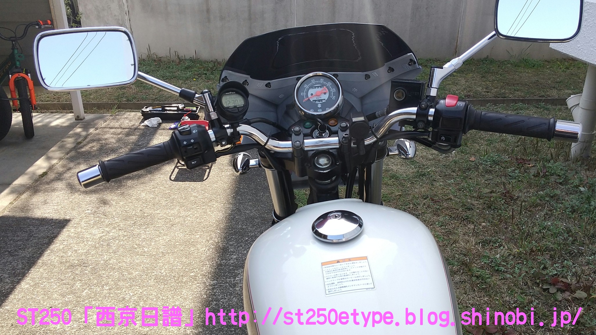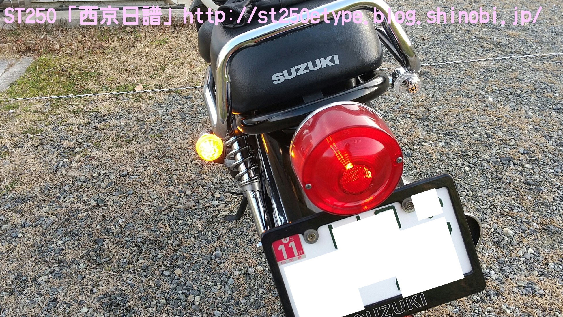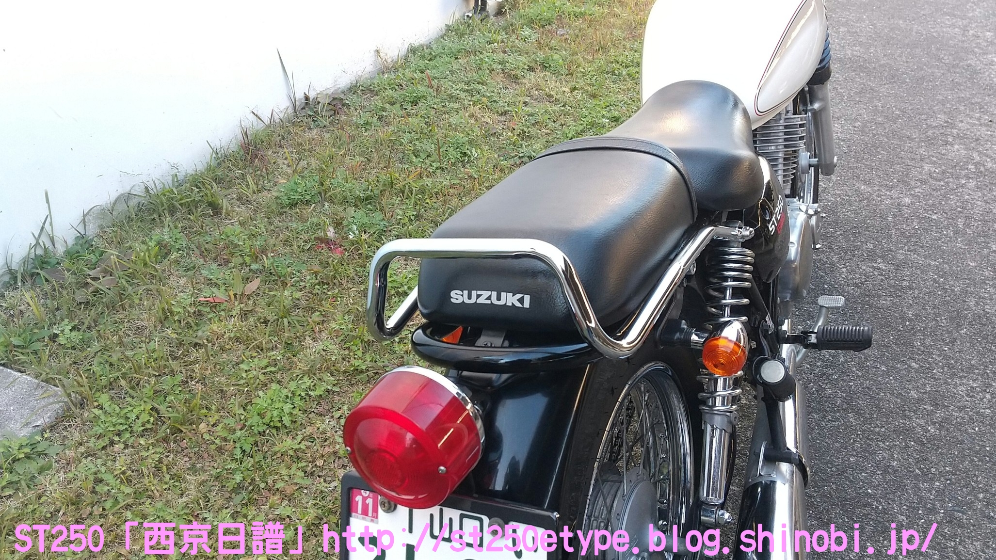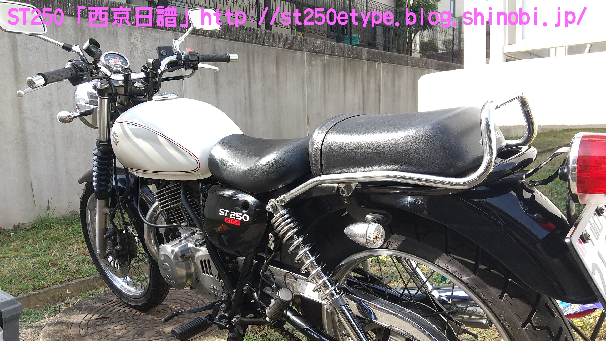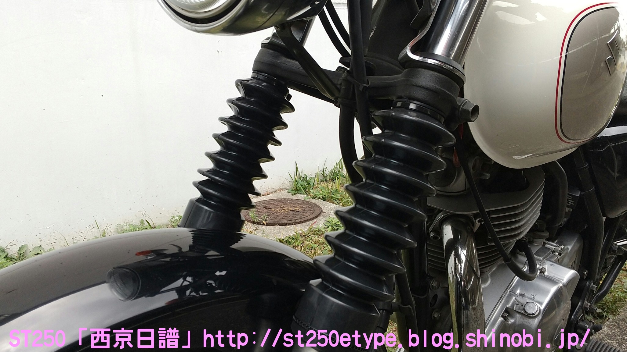 フォークブーツ&タンデムグリップ装着 日記 2020年12月30日 0 タイトルのとおり、フォークブーツとタンデムグリップを装着しました。ですが、本来の目的はフロントフォークのオーバーホールとステムベアリングの交換です。もう何年も前から、というか納車して1年後辺りからフロントフォークからオイル漏れの症状がありました。よく見るとフォークシールにヒビがあり、そこから漏れているようでした。当時はローンの返済で、修理なんかに費用を充てられませんでした。DIYも考えましたが、追加購入しなければならない工具なんかもあり断念。騙しだまし乗り続け、はや7年……さすがにフロントフォークも限界かと。ローンもだいぶ前に完済したし、いつものレッドバロンで見積りを依頼。フロントフォークのオーバーホール……だけでなくステムベアリングの交換も追加され、部品代&工賃込みで総額3万ちょい。ちなみにフォークは再利用します。時間と労力を考えると対価としては妥当……?しぶしぶ了解し、帰ろうとした時にふと思いつきました。ついでにフォークブーツもお願いしよう。確認すると、フォークを分解するのでフォークブーツに関しては技術量が掛からないので、部品代だけで良いとのこと。フォークブーツはキジマの汎用品で適合するものを取り寄せるとのことで、代金は3千円。↑装着されました。下部に太めの結束バンドが目立ちますが、納得の仕上がりです。渋く良くなりました。見た目のクラシックさが増し、レトロ感が上がりました。見た目だけでなく、フォークシールが完全にカバーされるので紫外線による劣化防止になると思います。フォークブーツの耐久性はどれくらいか、様子見です。ステムベアリングは、正直変える必要があるのか……?と思っていましたが、とても効果がありました。ハンドルが軽くなり、運転しやすくなりました。↑DIYで取り付けました。次はハリケーン製のタンデムグリップを取り付けました。部品の購入価格は9千円くらいでした。見た目がSR風で、納得の仕上がりです。ちなみに、取り付けには少々苦労しました。アーレンキーだけでは後方のネジが回らず、コンビネーションレンチを組み合わせ、何とか回しました。バイク(スズキ)ランキングへ
