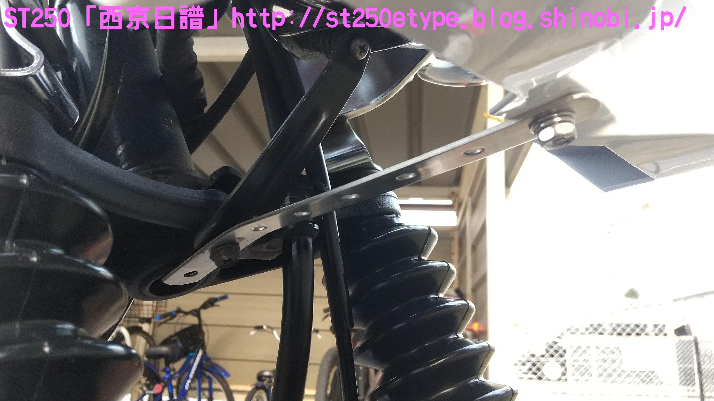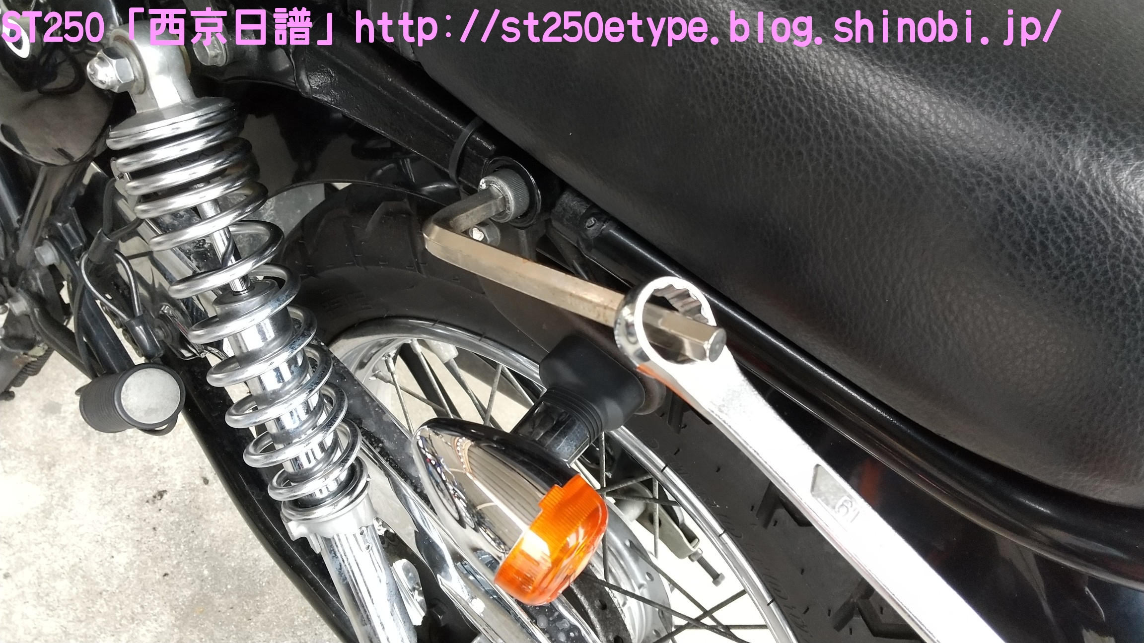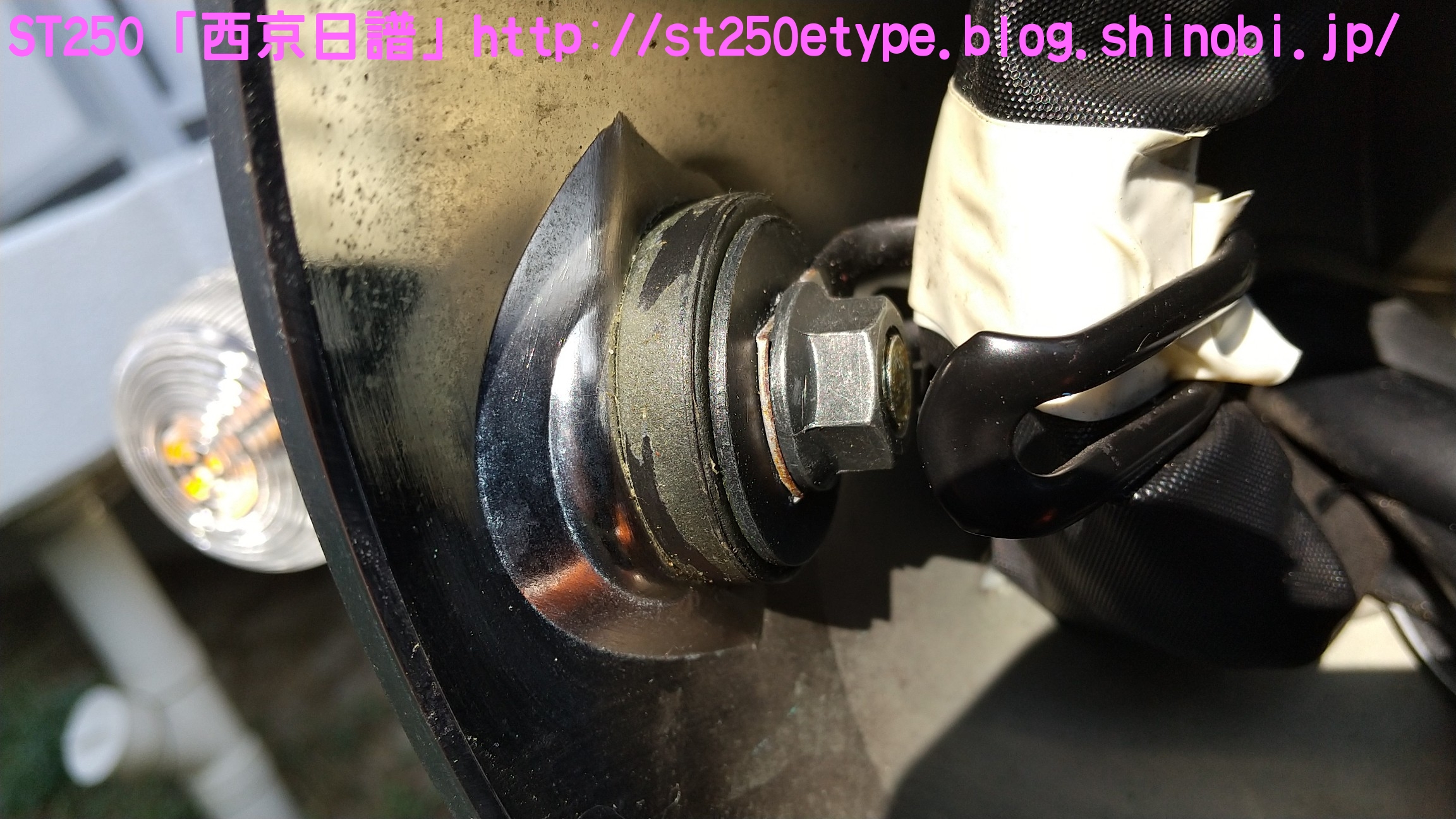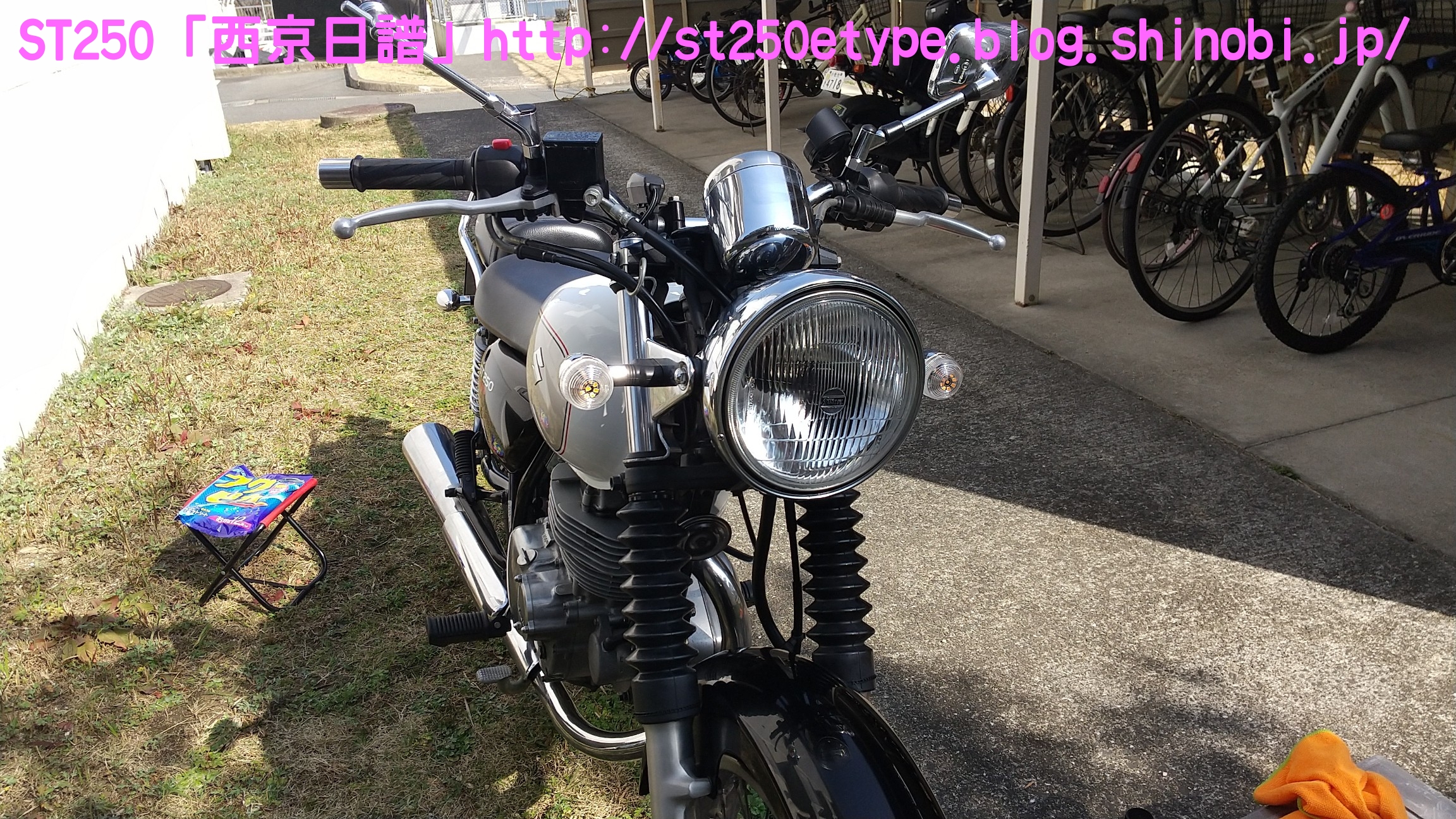 フォークブーツ&タンデムグリップ装着 日記 2020年12月30日 0 タイトルのとおり、フォークブーツとタンデムグリップを装着しました。ですが、本来の目的はフロントフォークのオーバーホールとステムベアリングの交換です。もう何年も前から、というか納車して1年後辺りからフロントフォークからオイル漏れの症状がありました。よく見るとフォークシールにヒビがあり、そこから漏れているようでした。当時はローンの返済で、修理なんかに費用を充てられませんでした。DIYも考えましたが、追加購入しなければならない工具なんかもあり断念。騙しだまし乗り続け、はや7年……さすがにフロントフォークも限界かと。ローンもだいぶ前に完済したし、いつものレッドバロンで見積りを依頼。フロントフォークのオーバーホール……だけでなくステムベアリングの交換も追加され、部品代&工賃込みで総額3万ちょい。ちなみにフォークは再利用します。時間と労力を考えると対価としては妥当……?しぶしぶ了解し、帰ろうとした時にふと思いつきました。ついでにフォークブーツもお願いしよう。確認すると、フォークを分解するのでフォークブーツに関しては技術量が掛からないので、部品代だけで良いとのこと。フォークブーツはキジマの汎用品で適合するものを取り寄せるとのことで、代金は3千円。↑装着されました。下部に太めの結束バンドが目立ちますが、納得の仕上がりです。渋く良くなりました。見た目のクラシックさが増し、レトロ感が上がりました。見た目だけでなく、フォークシールが完全にカバーされるので紫外線による劣化防止になると思います。フォークブーツの耐久性はどれくらいか、様子見です。ステムベアリングは、正直変える必要があるのか……?と思っていましたが、とても効果がありました。ハンドルが軽くなり、運転しやすくなりました。↑DIYで取り付けました。次はハリケーン製のタンデムグリップを取り付けました。部品の購入価格は9千円くらいでした。見た目がSR風で、納得の仕上がりです。ちなみに、取り付けには少々苦労しました。アーレンキーだけでは後方のネジが回らず、コンビネーションレンチを組み合わせ、何とか回しました。バイク(スズキ)ランキングへ