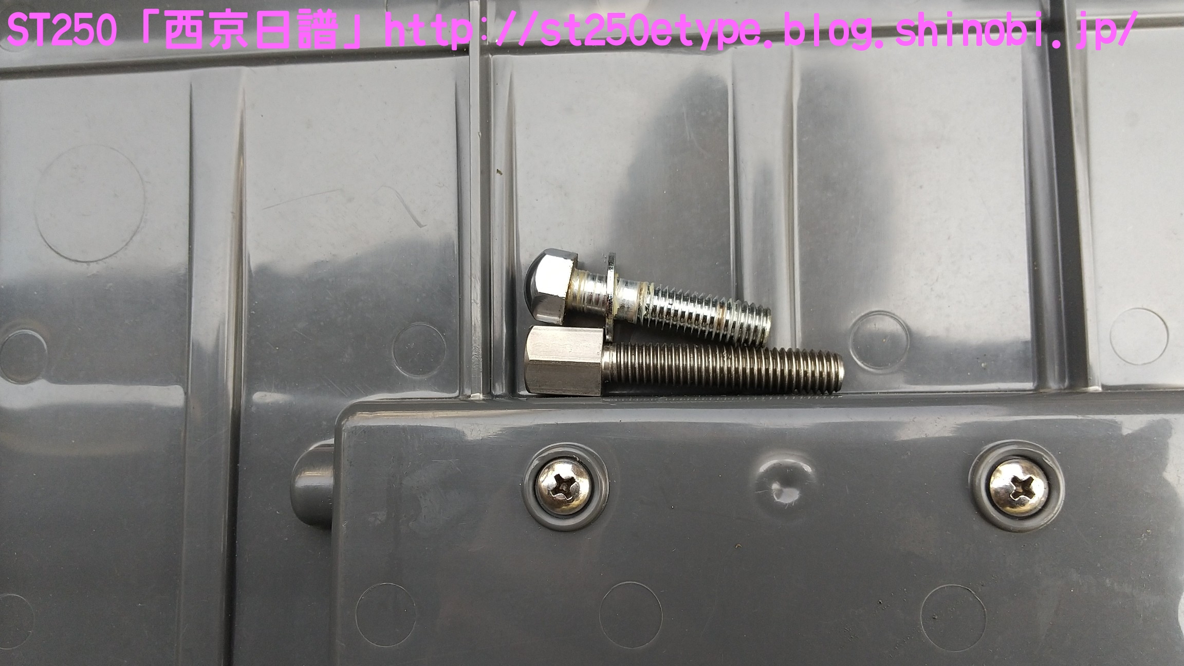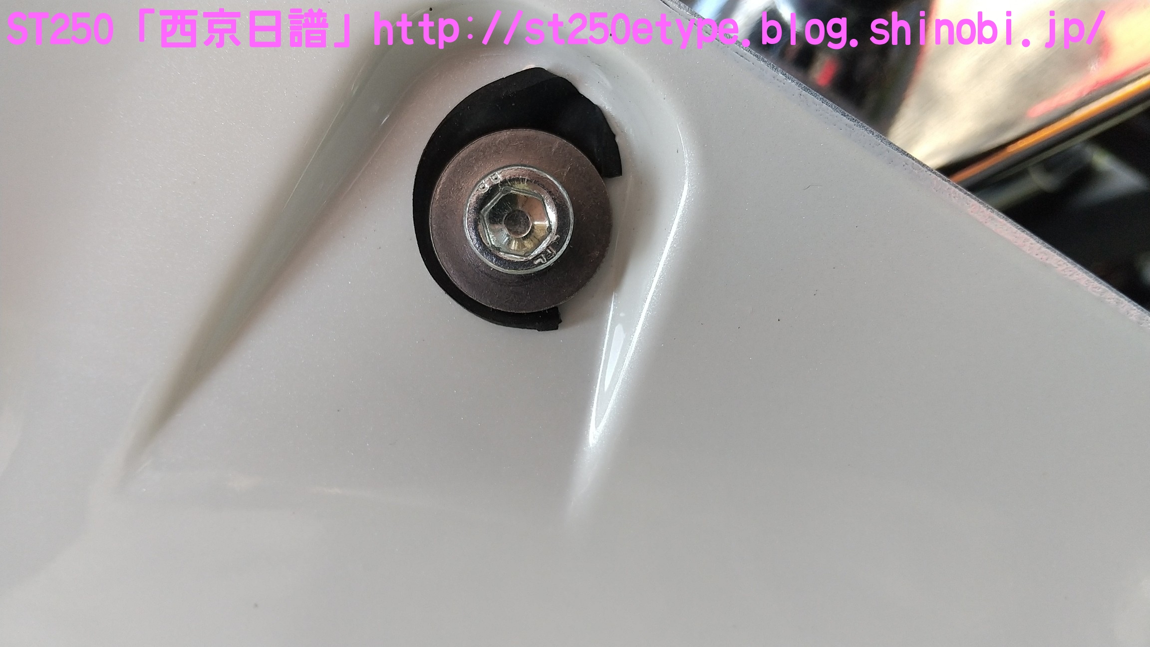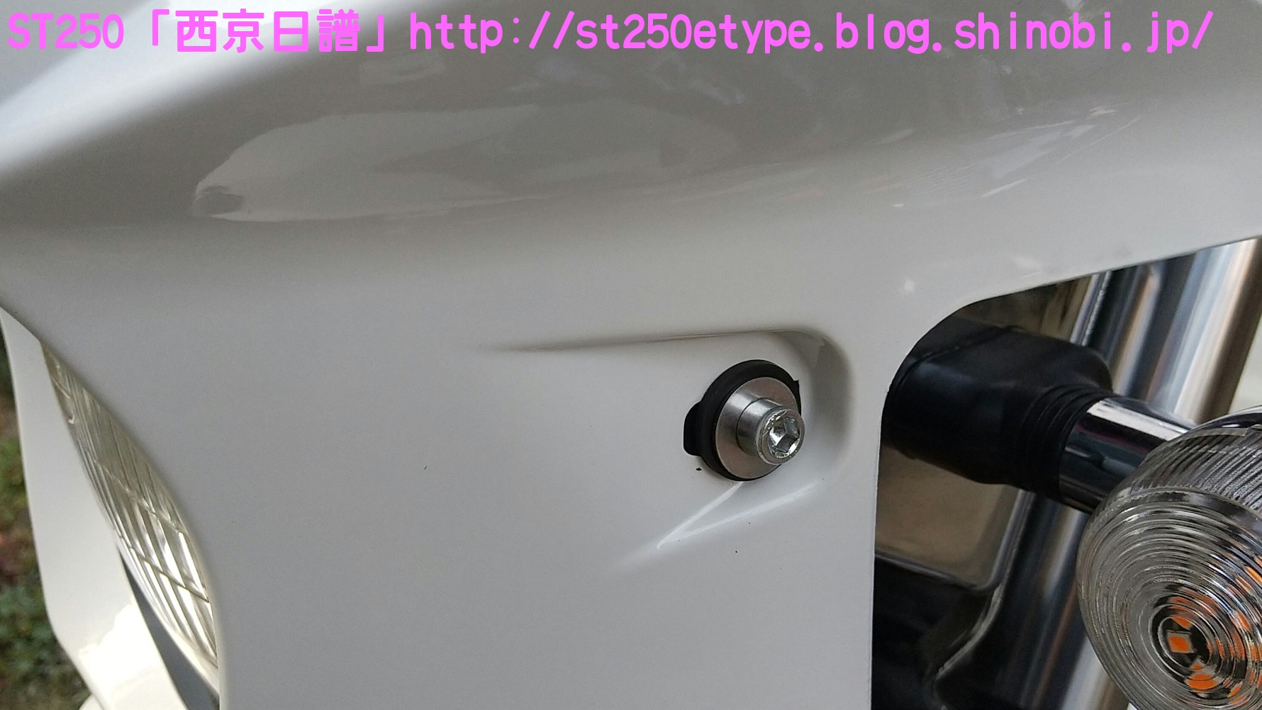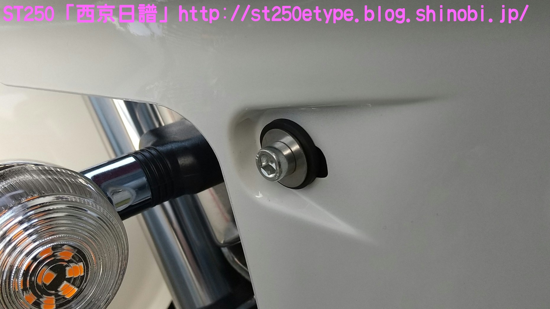汎用ビキニカウル装着 日記 2021年02月21日 0 先日の記事で、ビキニカウルの構想とカラーの選定について書いていましたが、色が決定したため注文しました。ネットショッピングで取付けネジ付き4,900円ほど。在庫があったのかわずか2日で到着。↑メイドイン台湾早速開封↑白に決めました↑完成イメージ↑パールホワイト塗装購入者レビューに書いてあった通り、パールホワイトの塗装が施されていました。タンクカラーがパールホワイトなので好都合でした。↑一部塗装に難ありとはいえ、特に目立つものではありません。↑台湾製ABS材↑裏面の塗装は無しスクリーン取付けネジが錆びるというレビューがあったので、今後ステン製などに交換する必要があるかもしれません。以後、取付けです。ビキニカウルは180φのものを用意します。↑ライト下部のネジを外す5mmのアーレンキーを使用します。左右を外すとガラスレンズ一式が外れるので落下に注意します。↑ライトケース内砂、埃、虫などを取り除いて綺麗にします。↑向かって左↑向かって右当初の取付け状態です。純正に戻す時のために記録しておきます。黒ナットは紛失しないよう、そのまま使用します。取付け用のビスと交換していきますが、この時は片方ずつ交換します。光軸がズレないようにする必要があります。↑ビスの比較上が純正のビスで、下が取付け用のビス。純正のビスよりも長いですが、取付けには問題ありません。径はM8サイズです。付属のスペーサーなどは使わず、ビスだけを交換。純正のものは戻しやすいようにそのまま利用します。↑向かって左↑向かって右左右とも長さをもて余すので、振動の緩み対策としてスプリングワッシャを追加しました。ガラスレンズ一式を元に戻すと、これでカウルの土台が完成です。この後は、取付け用のビスにカウルとワッシャー類を付属のM6のボルトで留めます。そこで、問題が発生……↑ゴムワッシャーがねじ切れるあっという間にゴムワッシャーが捻じ切れました。こちらも購入者レビュー書いてはありましたが、ここまで早いとは……。ちなみに、カウルは台湾製なのですが、付属のネジ類は中国製です。中華民国と中華人民共和国とでは大きな違いです。↑中国製、ワッシャ径もデタラメこれはM6サイズのボルトに取り付けるものですが、ワッシャ径はM8のもので大きいです。本当に中国製は疲れる……。記録用にネジの説明書などをアップしておきます。予想はしていたので、一旦作業をやめてホームセンターに行きます。必要と思われるものを買い足してきました。※M6サイズ六角ボルトを撮り忘れまず、M6サイズのワッシャとゴムワッシャです。大きさがそれぞれ二種類ありますが、大きいものはカウルの内側、小さいものは外側に使います。固定をよくするためには大きなワッシャで摩擦面を増やす方が有効ですが、外側は物理的に20mm以上は付けられなそうです。そして、三点止めで固定を強化するために……↑200mmステンレス板写真は既に手曲げ加工したものです。このステン板の孔はM6サイズのボルトが通る大きさでなければいけません。ホームセンターのバラ売りコーナーで、実際にM6が入るか確認しました。先にステン板の取付け位置を確認します。ライトケースを下から支えているボルトに共締めします。長さは十分にあります。M6のボルトで、10mmのレンチで外せます。↑写真は既にボルトを外してます↑いい塩梅に手曲げで調整これをカウルの下部にある孔に固定します。孔から孔までは約140~150mmでしたが、余裕をもって200mmをチョイス。やはり少し余りましたが、特に干渉しなかったので余分な箇所もそのままにしました。↑M6サイズの六角ボルトで固定緩み対策にスプリングワッシャを噛ませました。ゴムワッシャ、スプリングワッシャを使うと、ボルトの長さ15mmではギリギリでした。20mm あった方が余裕です。↑向かって右↑向かってサイドの左右はスプリングワッシャは不要です。そもそも、カウルの幅がパツパツなので、弾力(圧力)があるため緩みにくいでしょう。孔の中心で固定。ライト周りのクリアランスを確認します。↑下は余裕あり↑上は余裕なしSTは振動が激しいので、ここであまり余裕がないど干渉してビビり音が発生、実際にエンジンを吹かすとバリバリ言ったため、サイドを緩めて前にずらして調整しました。では、全体の確認です。この車体色でカウルを装着した画像が検索してもなかなか出なかったので、今後の参考としても複数枚アップしておきます。装着後の走行では、期待する風防効果が確かにありました。バイパスでも肩までの走行風がなくなったので、高速道路ではより実感できるでしょう。手頃な金額でドレスアップと風防効果が獲得できたので、とても満足です。ただひとつ、レトロ路線からは遠くなってしまいました。(^_^;)バイク(スズキ)ランキングへ
