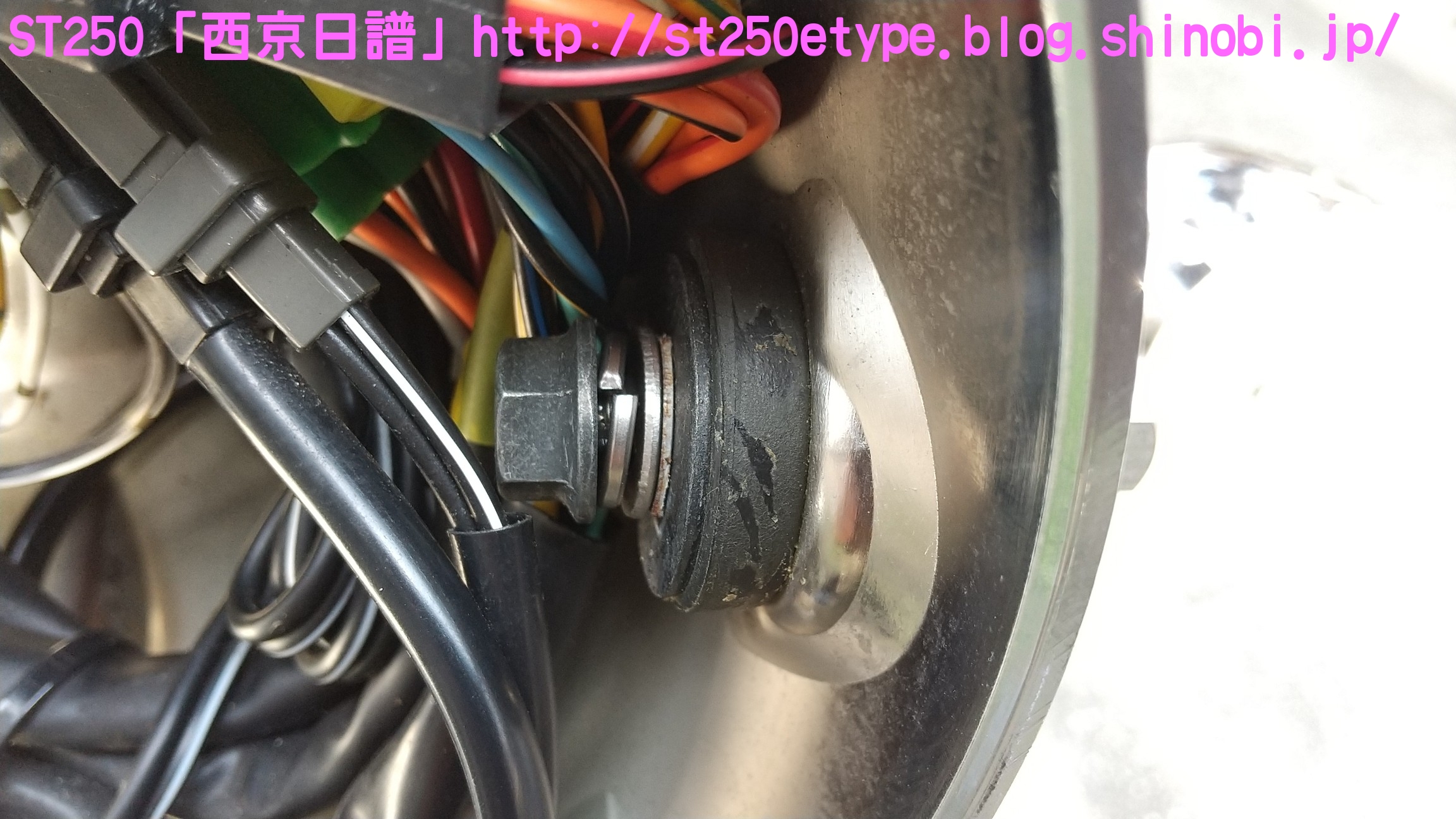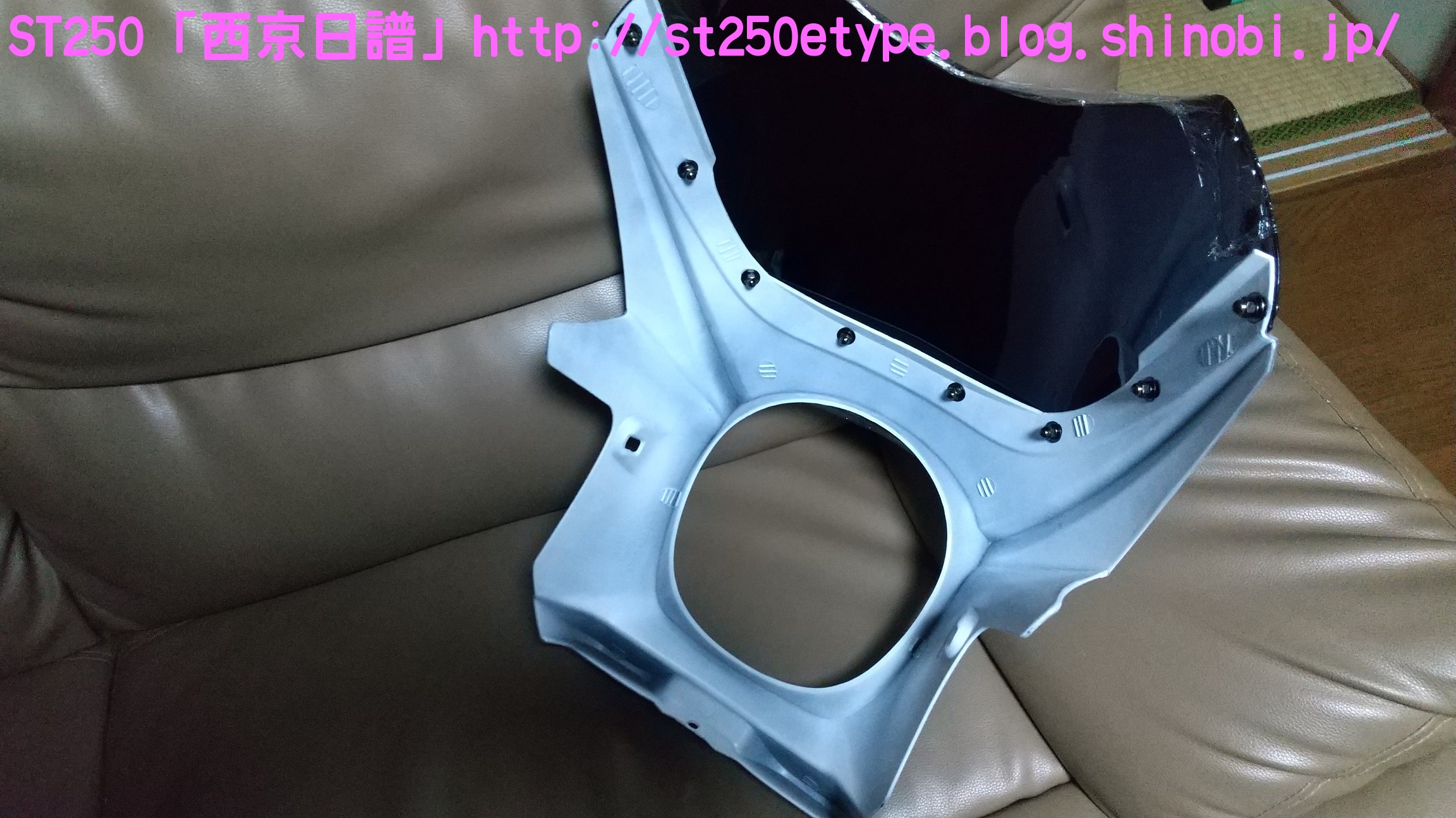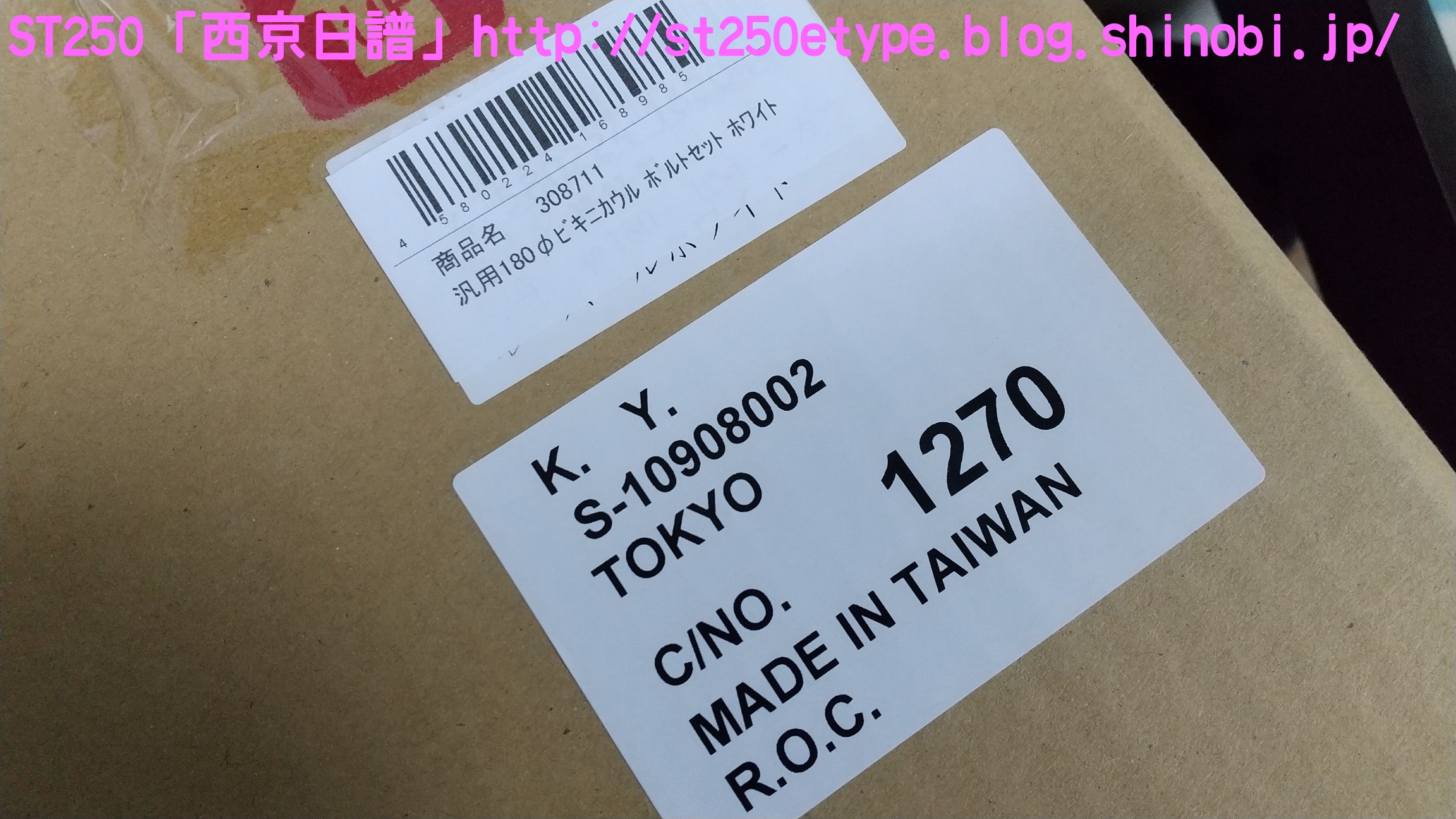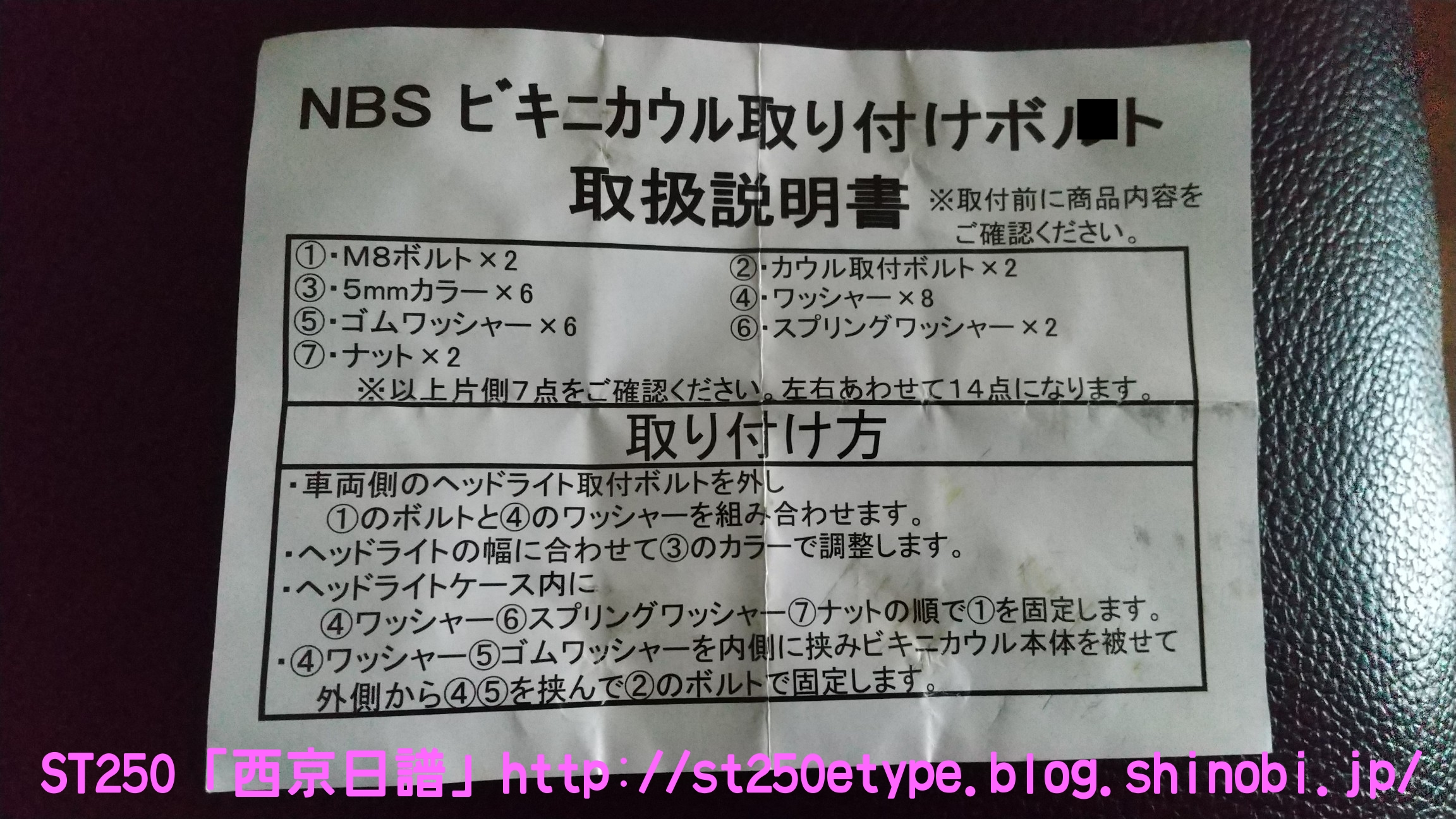 汎用ビキニカウル装着 日記 2021年02月21日 0 先日の記事で、ビキニカウルの構想とカラーの選定について書いていましたが、色が決定したため注文しました。ネットショッピングで取付けネジ付き4,900円ほど。在庫があったのかわずか2日で到着。↑メイドイン台湾早速開封↑白に決めました↑完成イメージ↑パールホワイト塗装購入者レビューに書いてあった通り、パールホワイトの塗装が施されていました。タンクカラーがパールホワイトなので好都合でした。↑一部塗装に難ありとはいえ、特に目立つものではありません。↑台湾製ABS材↑裏面の塗装は無しスクリーン取付けネジが錆びるというレビューがあったので、今後ステン製などに交換する必要があるかもしれません。以後、取付けです。ビキニカウルは180φのものを用意します。↑ライト下部のネジを外す5mmのアーレンキーを使用します。左右を外すとガラスレンズ一式が外れるので落下に注意します。↑ライトケース内砂、埃、虫などを取り除いて綺麗にします。↑向かって左↑向かって右当初の取付け状態です。純正に戻す時のために記録しておきます。黒ナットは紛失しないよう、そのまま使用します。取付け用のビスと交換していきますが、この時は片方ずつ交換します。光軸がズレないようにする必要があります。↑ビスの比較上が純正のビスで、下が取付け用のビス。純正のビスよりも長いですが、取付けには問題ありません。径はM8サイズです。付属のスペーサーなどは使わず、ビスだけを交換。純正のものは戻しやすいようにそのまま利用します。↑向かって左↑向かって右左右とも長さをもて余すので、振動の緩み対策としてスプリングワッシャを追加しました。ガラスレンズ一式を元に戻すと、これでカウルの土台が完成です。この後は、取付け用のビスにカウルとワッシャー類を付属のM6のボルトで留めます。そこで、問題が発生……↑ゴムワッシャーがねじ切れるあっという間にゴムワッシャーが捻じ切れました。こちらも購入者レビュー書いてはありましたが、ここまで早いとは……。ちなみに、カウルは台湾製なのですが、付属のネジ類は中国製です。中華民国と中華人民共和国とでは大きな違いです。↑中国製、ワッシャ径もデタラメこれはM6サイズのボルトに取り付けるものですが、ワッシャ径はM8のもので大きいです。本当に中国製は疲れる……。記録用にネジの説明書などをアップしておきます。予想はしていたので、一旦作業をやめてホームセンターに行きます。必要と思われるものを買い足してきました。※M6サイズ六角ボルトを撮り忘れまず、M6サイズのワッシャとゴムワッシャです。大きさがそれぞれ二種類ありますが、大きいものはカウルの内側、小さいものは外側に使います。固定をよくするためには大きなワッシャで摩擦面を増やす方が有効ですが、外側は物理的に20mm以上は付けられなそうです。そして、三点止めで固定を強化するために……↑200mmステンレス板写真は既に手曲げ加工したものです。このステン板の孔はM6サイズのボルトが通る大きさでなければいけません。ホームセンターのバラ売りコーナーで、実際にM6が入るか確認しました。先にステン板の取付け位置を確認します。ライトケースを下から支えているボルトに共締めします。長さは十分にあります。M6のボルトで、10mmのレンチで外せます。↑写真は既にボルトを外してます↑いい塩梅に手曲げで調整これをカウルの下部にある孔に固定します。孔から孔までは約140~150mmでしたが、余裕をもって200mmをチョイス。やはり少し余りましたが、特に干渉しなかったので余分な箇所もそのままにしました。↑M6サイズの六角ボルトで固定緩み対策にスプリングワッシャを噛ませました。ゴムワッシャ、スプリングワッシャを使うと、ボルトの長さ15mmではギリギリでした。20mm あった方が余裕です。↑向かって右↑向かってサイドの左右はスプリングワッシャは不要です。そもそも、カウルの幅がパツパツなので、弾力(圧力)があるため緩みにくいでしょう。孔の中心で固定。ライト周りのクリアランスを確認します。↑下は余裕あり↑上は余裕なしSTは振動が激しいので、ここであまり余裕がないど干渉してビビり音が発生、実際にエンジンを吹かすとバリバリ言ったため、サイドを緩めて前にずらして調整しました。では、全体の確認です。この車体色でカウルを装着した画像が検索してもなかなか出なかったので、今後の参考としても複数枚アップしておきます。装着後の走行では、期待する風防効果が確かにありました。バイパスでも肩までの走行風がなくなったので、高速道路ではより実感できるでしょう。手頃な金額でドレスアップと風防効果が獲得できたので、とても満足です。ただひとつ、レトロ路線からは遠くなってしまいました。(^_^;)バイク(スズキ)ランキングへ