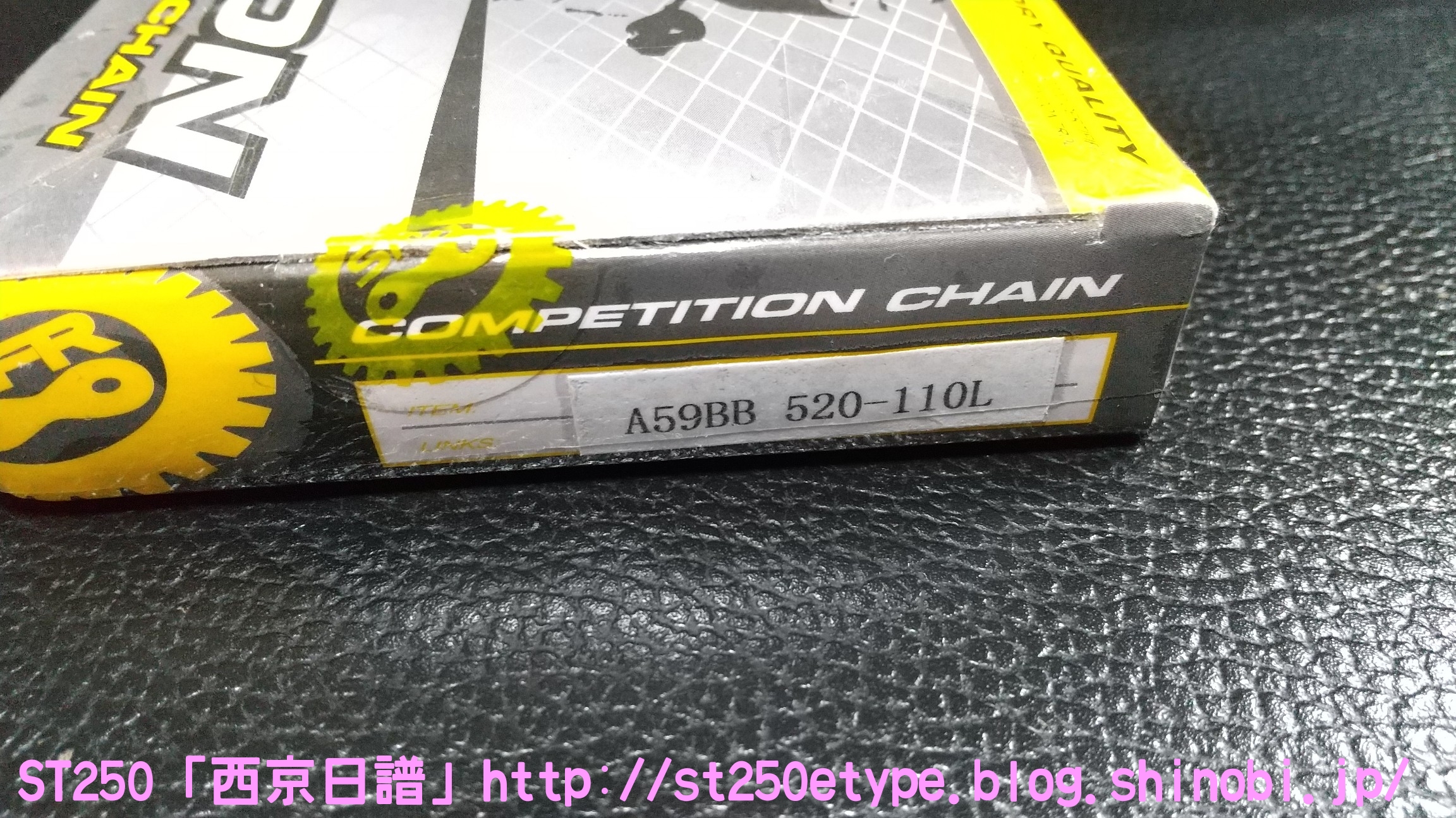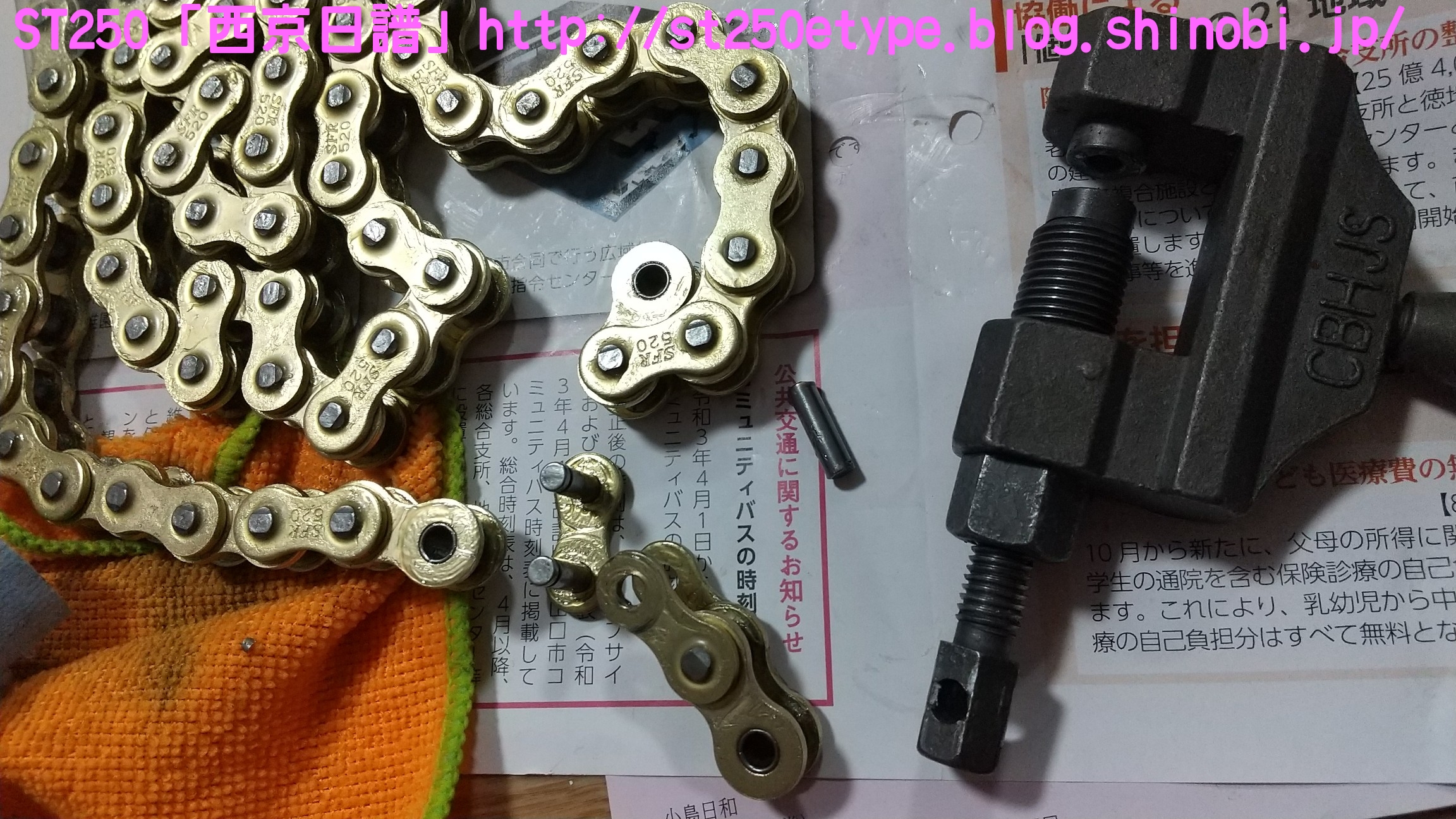 格安ゴールドチェーンに交換 日記 2021年03月31日 0 これまで装着していた、台湾製KMCのノンシールチェーンが雪で錆びてしまったので代わりのチェーンを探していたところ……いつから出始めていたのか、格安のノンシールチェーンを発見。しかもゴールドです。▲謎のメーカー調べてみると残念ながらというか、やはり中国製です。ネットショッピングで約1,300円これが送料込みだから驚きです。これだけ安いと全く使えないかもしれません。(愛用中の台湾製KMCのノンシールチェーンであれば、安く探しても約2,000円を越えてきます。)▲520サイズの110リンク▲包装が安っぽい他のメーカーであればホログラム付きのギラギラした包装ですが、まさかの透明という意外性▲クリップジョイントクリップを外すのは100均のエンドプライヤーが使いやすいです。しかしこのチェーンたど取り付けには別途ラジオペンチが必要でした。▲2コマ分を切断STは108コマなので、110コマから2コマを切断します。※取り付け作業は割愛します。鋼製束を使用した簡易ジャッキアップでの作業です。▲取付け後の様子ゴールドになってドレスアップの効果が得られました。往復40kmの通勤で数日使用した感触としては普通です。これまでと違和感ありません。ST自体、チェーンに左右される車体ではないことの方が大きいと思いますが。バイク(スズキ)ランキングへ PR