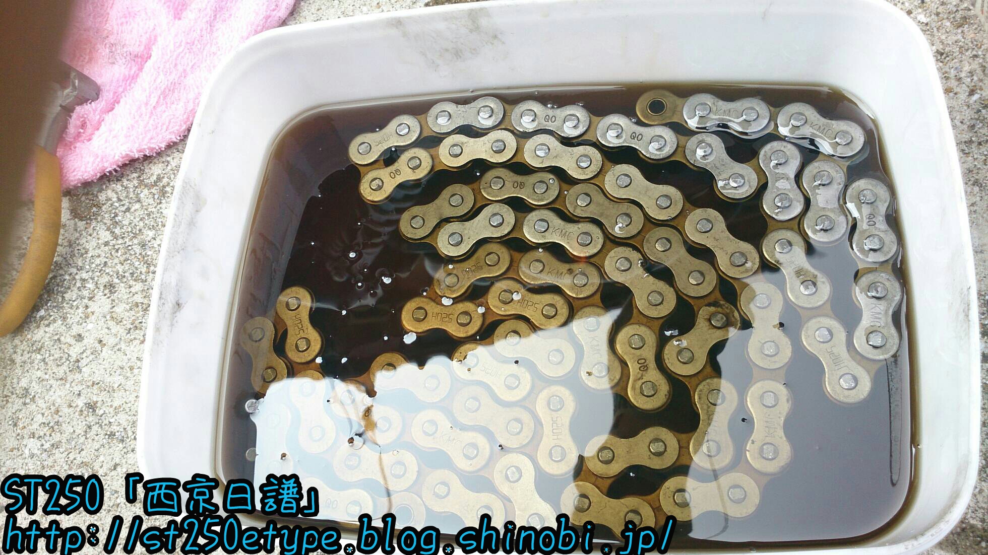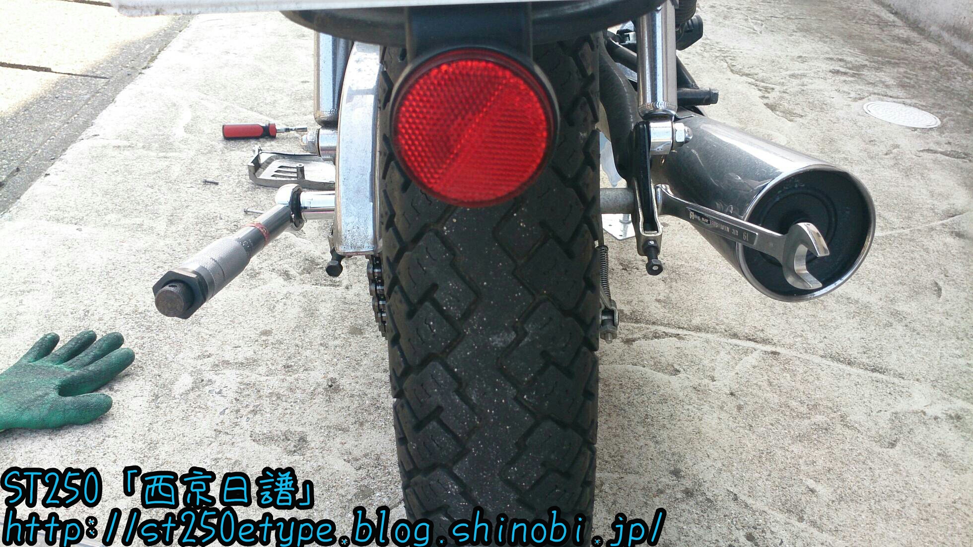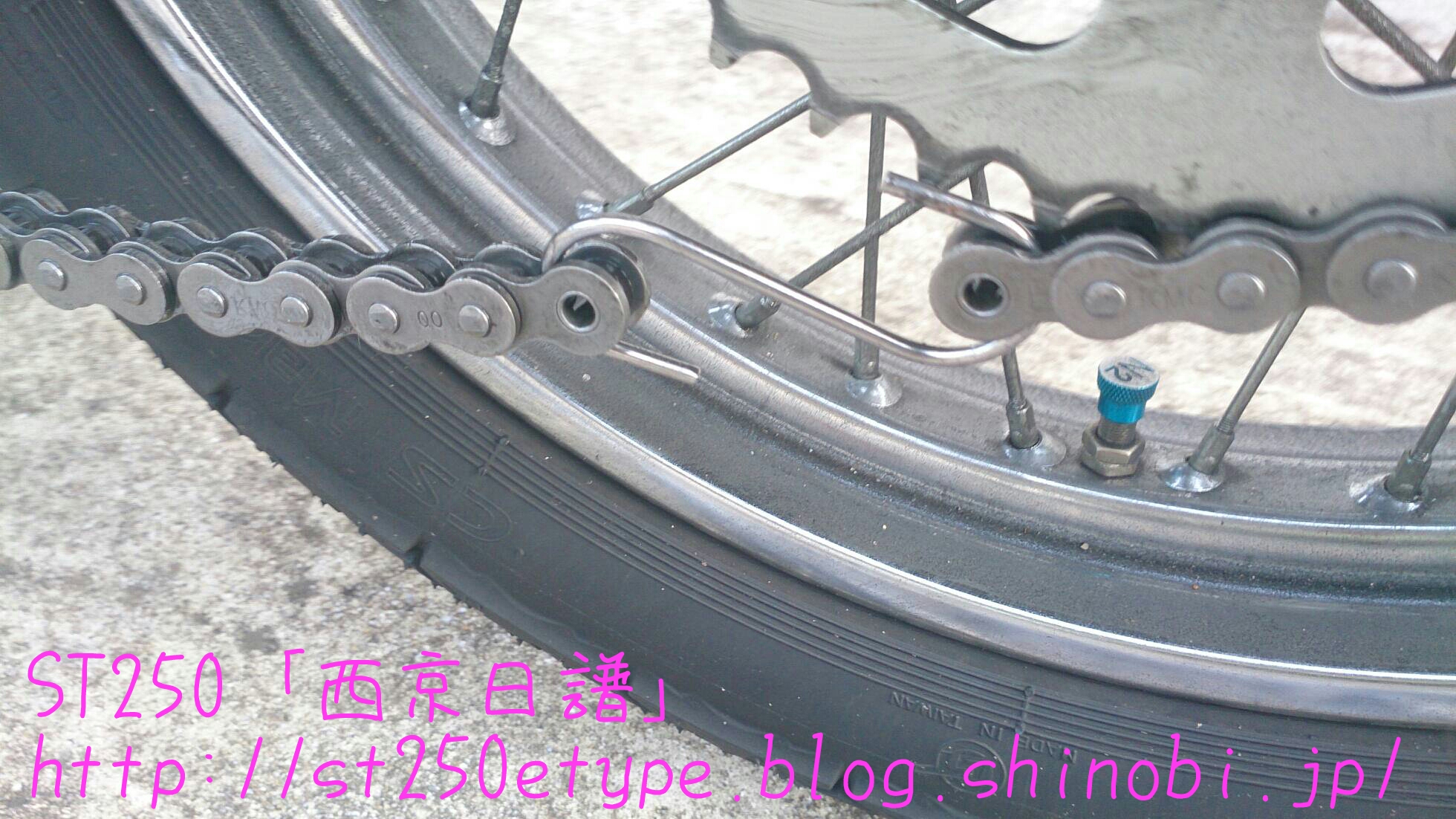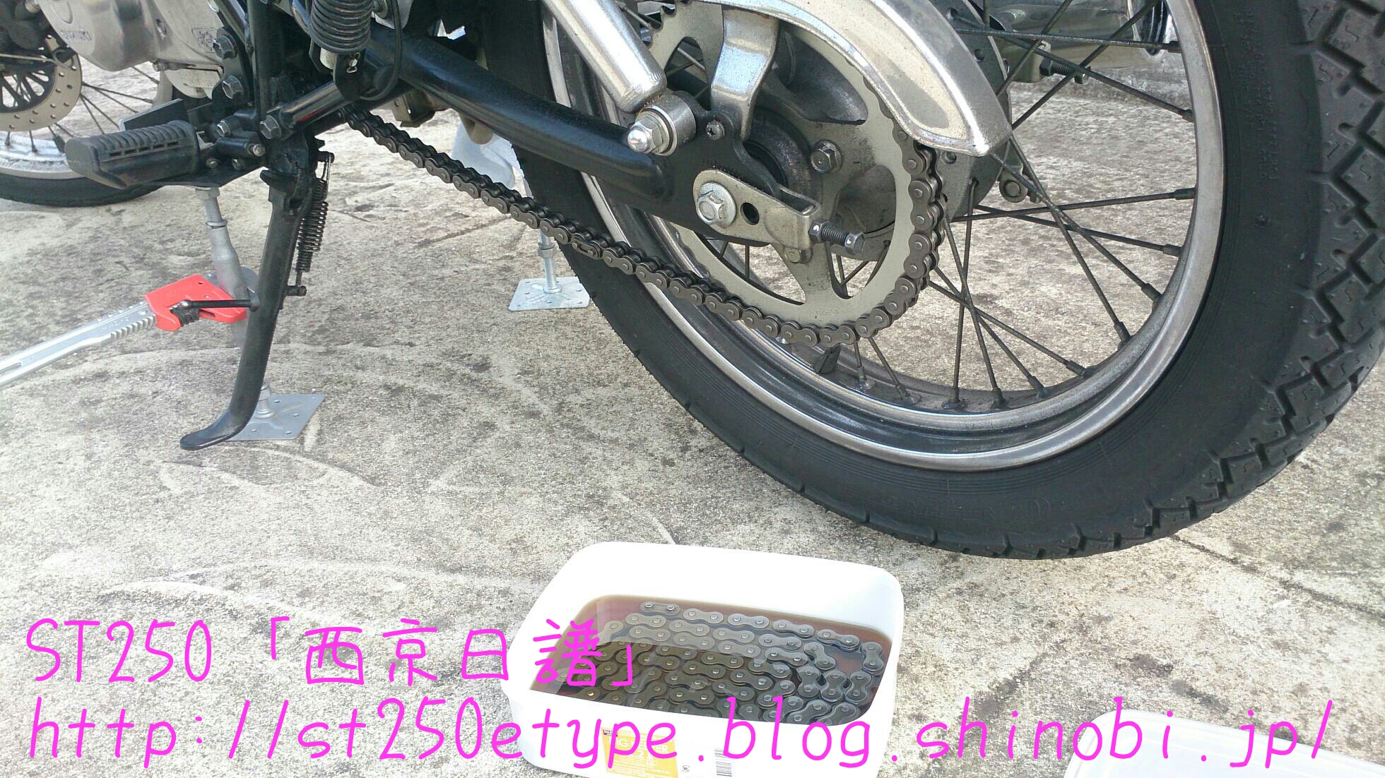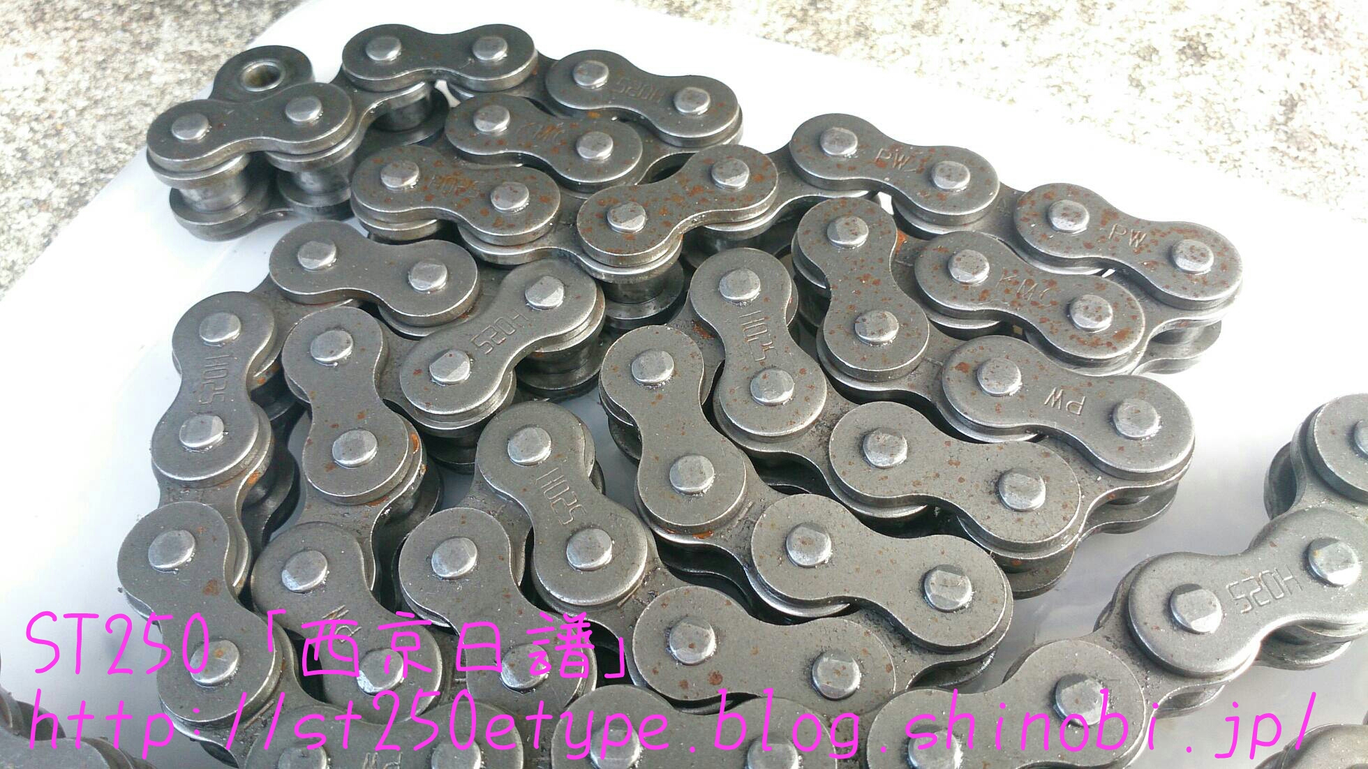 梅雨明けチェーン交換 日記 2016年07月18日 0 梅雨が明けました。梅雨の間はまったく整備をしませんでした。シリコンスプレーに頼って、洗車すらしてません。今後もそうするかもしれません。なるべく手間をかけずに維持したい。今回は、2300kmほど走ったところでレッドバロンにてオイル交換をしてもらいました。(本当は自分でオイル購入して実施する予定でしたが……)そして、オイル交換のタイミング(約3000kmごと)と同時に行おうと設定しているのが「チェーン交換」と「エアクリーナー交換」です。(R2.11.20追記 ※今はチェーンのローテ交換はしていません。捨ててます。)まずはチェーン交換を行いました。鋼製束を利用した簡易ジャッキアップです。第一にフロントブレーキの固定は必須ステップ下(マフラー側)に鋼製束を立てます。一応タオルを当てています。反対(スタンド側)に鋼製束を立て、こちらをレンチで締め上げて高さをつけていきます。これだけ上がれば十分、作業に取りかかります。チェーンの張り調整があるのでアクスルシャフトを緩めます。向かって左は17mm、右は19mmです。タッパーに保管していた、エンジンオイル浸けの予備チェーン。クリップジョイントは100均のエンドカッターで脱着外したチェーン、よく見るとプレートに錆びが浮いています。こちらは内側なので目が行き届かない部分です。今後は給油の際にしっかりとウエスでオイルを塗るようにします。チェーンの取り付けの前に、ここのカバーを外しておかないといけません。もちろんチェーンカバーも。チェーン取り付け。S字フックは意味はありません。チェーンの張りを調整して、それぞれのカバーを取り付けて終了です。チェーンの張りは、メーカー規定より緩めの40mmにしました。交換したチェーンは、再びタッパーにてエンジンオイル浸け。次回の出番まで休憩してもらいます。 ついでに、雨中走行で錆びてしまったマフラーエンドに錆びチェンジャー塗布。全面に塗りました。乾いたら黒染スプレーを吹いておしまいです。黒染めスプレーをしなければ、錆びるのが早いように感じます。(R2.11.20追記※この作業を繰り返していたら、メンテフリーでも赤錆が出にくくなりました。)今回はこれで終了です。「エアクリーナー交換」まで行う元気はありませんでしたので、次回にします。バイク(スズキ)ランキングへ