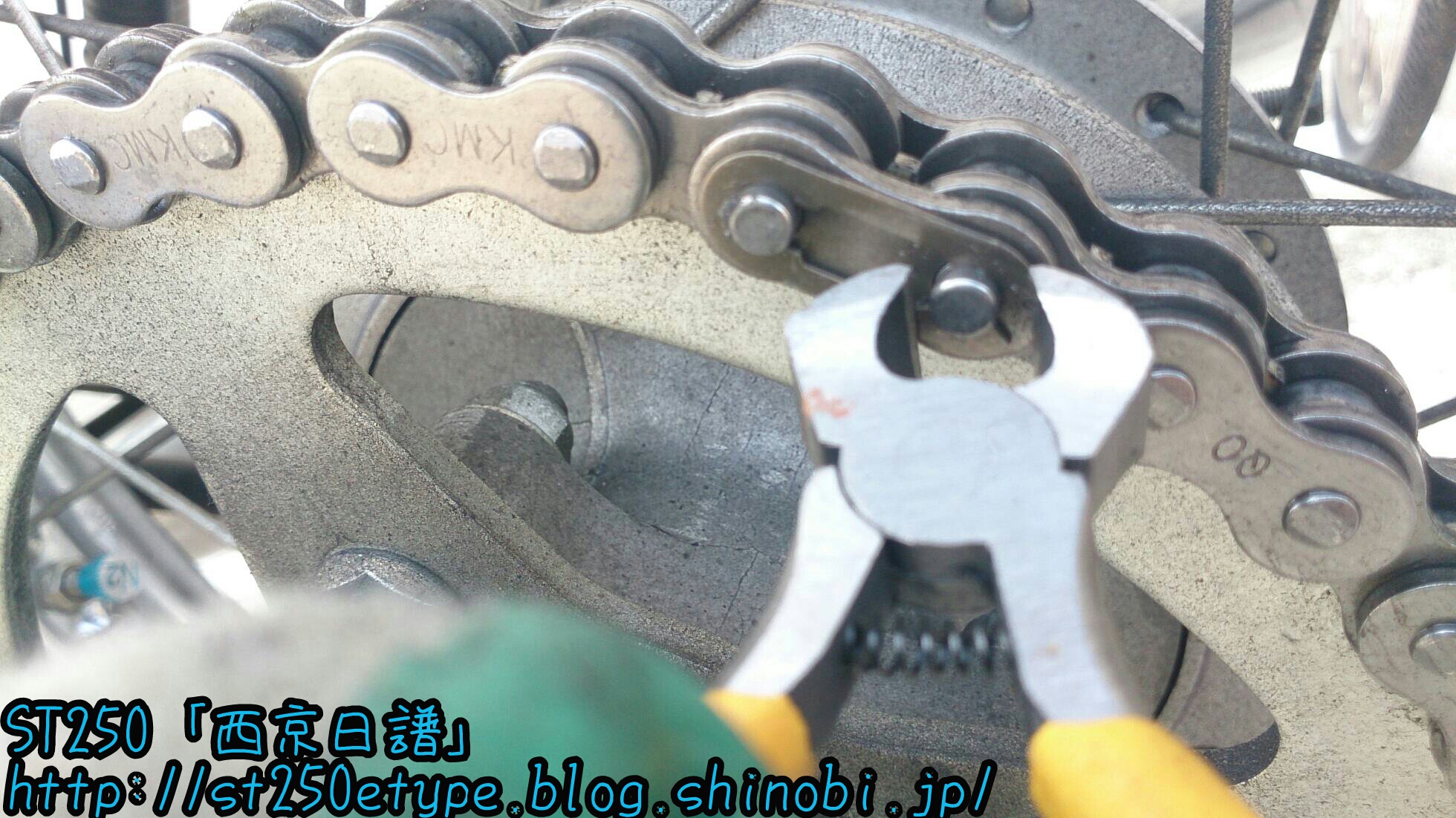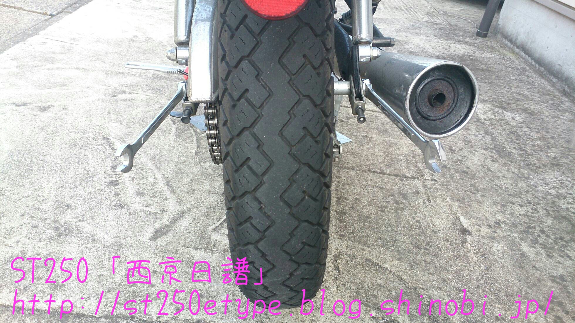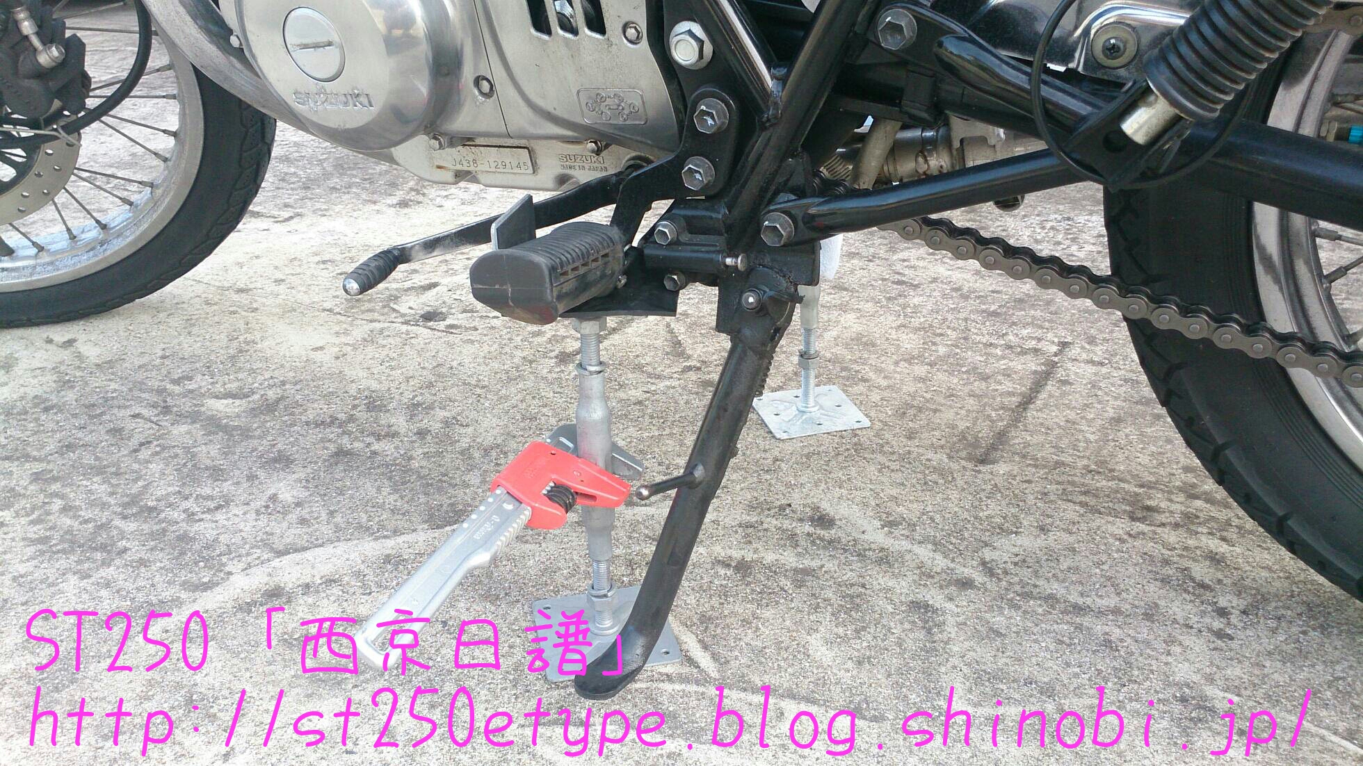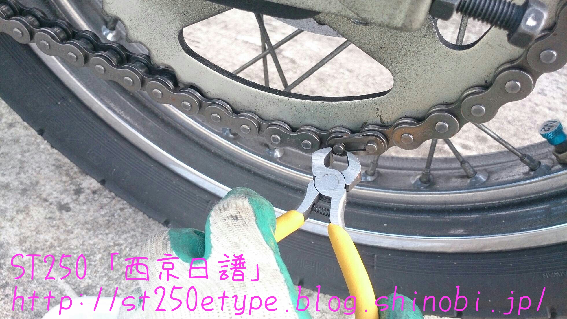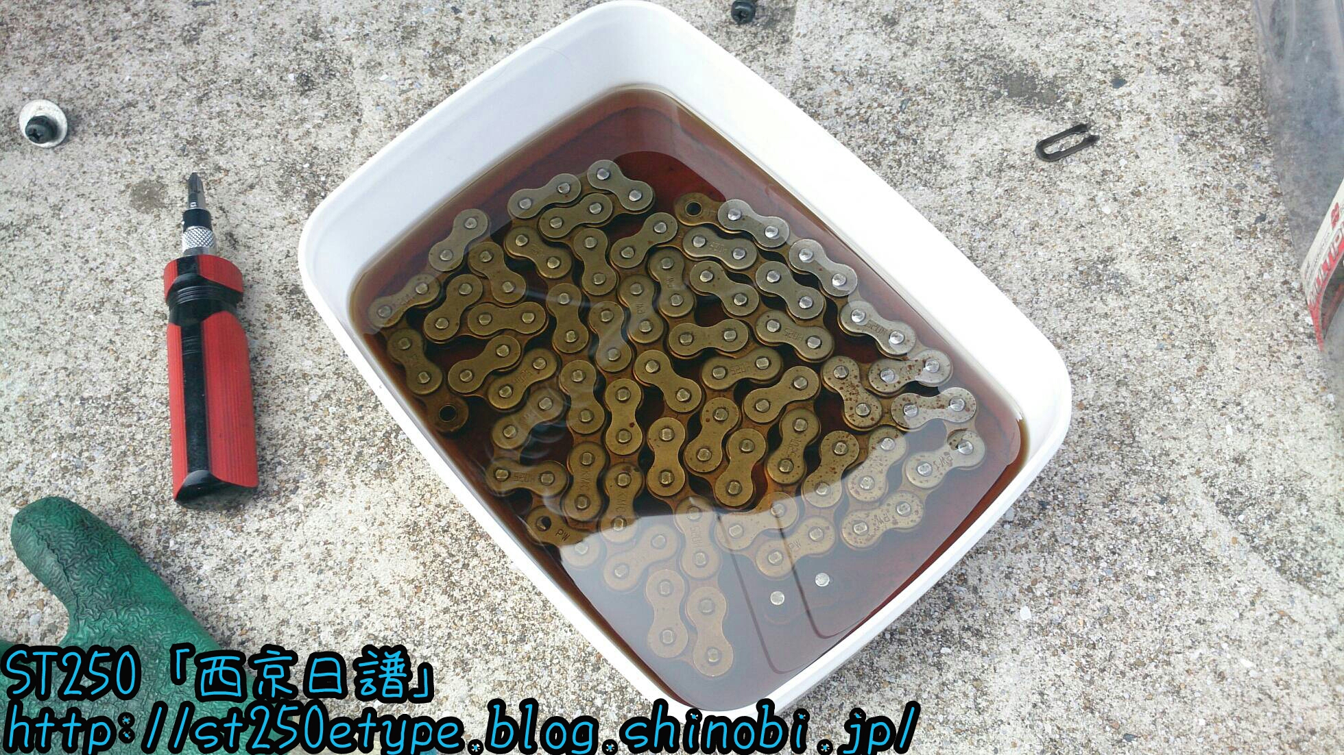 梅雨明けチェーン交換 日記 2016年07月18日 0 梅雨が明けました。梅雨の間はまったく整備をしませんでした。シリコンスプレーに頼って、洗車すらしてません。今後もそうするかもしれません。なるべく手間をかけずに維持したい。今回は、2300kmほど走ったところでレッドバロンにてオイル交換をしてもらいました。(本当は自分でオイル購入して実施する予定でしたが……)そして、オイル交換のタイミング(約3000kmごと)と同時に行おうと設定しているのが「チェーン交換」と「エアクリーナー交換」です。(R2.11.20追記 ※今はチェーンのローテ交換はしていません。捨ててます。)まずはチェーン交換を行いました。鋼製束を利用した簡易ジャッキアップです。第一にフロントブレーキの固定は必須ステップ下(マフラー側)に鋼製束を立てます。一応タオルを当てています。反対(スタンド側)に鋼製束を立て、こちらをレンチで締め上げて高さをつけていきます。これだけ上がれば十分、作業に取りかかります。チェーンの張り調整があるのでアクスルシャフトを緩めます。向かって左は17mm、右は19mmです。タッパーに保管していた、エンジンオイル浸けの予備チェーン。クリップジョイントは100均のエンドカッターで脱着外したチェーン、よく見るとプレートに錆びが浮いています。こちらは内側なので目が行き届かない部分です。今後は給油の際にしっかりとウエスでオイルを塗るようにします。チェーンの取り付けの前に、ここのカバーを外しておかないといけません。もちろんチェーンカバーも。チェーン取り付け。S字フックは意味はありません。チェーンの張りを調整して、それぞれのカバーを取り付けて終了です。チェーンの張りは、メーカー規定より緩めの40mmにしました。交換したチェーンは、再びタッパーにてエンジンオイル浸け。次回の出番まで休憩してもらいます。 ついでに、雨中走行で錆びてしまったマフラーエンドに錆びチェンジャー塗布。全面に塗りました。乾いたら黒染スプレーを吹いておしまいです。黒染めスプレーをしなければ、錆びるのが早いように感じます。(R2.11.20追記※この作業を繰り返していたら、メンテフリーでも赤錆が出にくくなりました。)今回はこれで終了です。「エアクリーナー交換」まで行う元気はありませんでしたので、次回にします。バイク(スズキ)ランキングへ