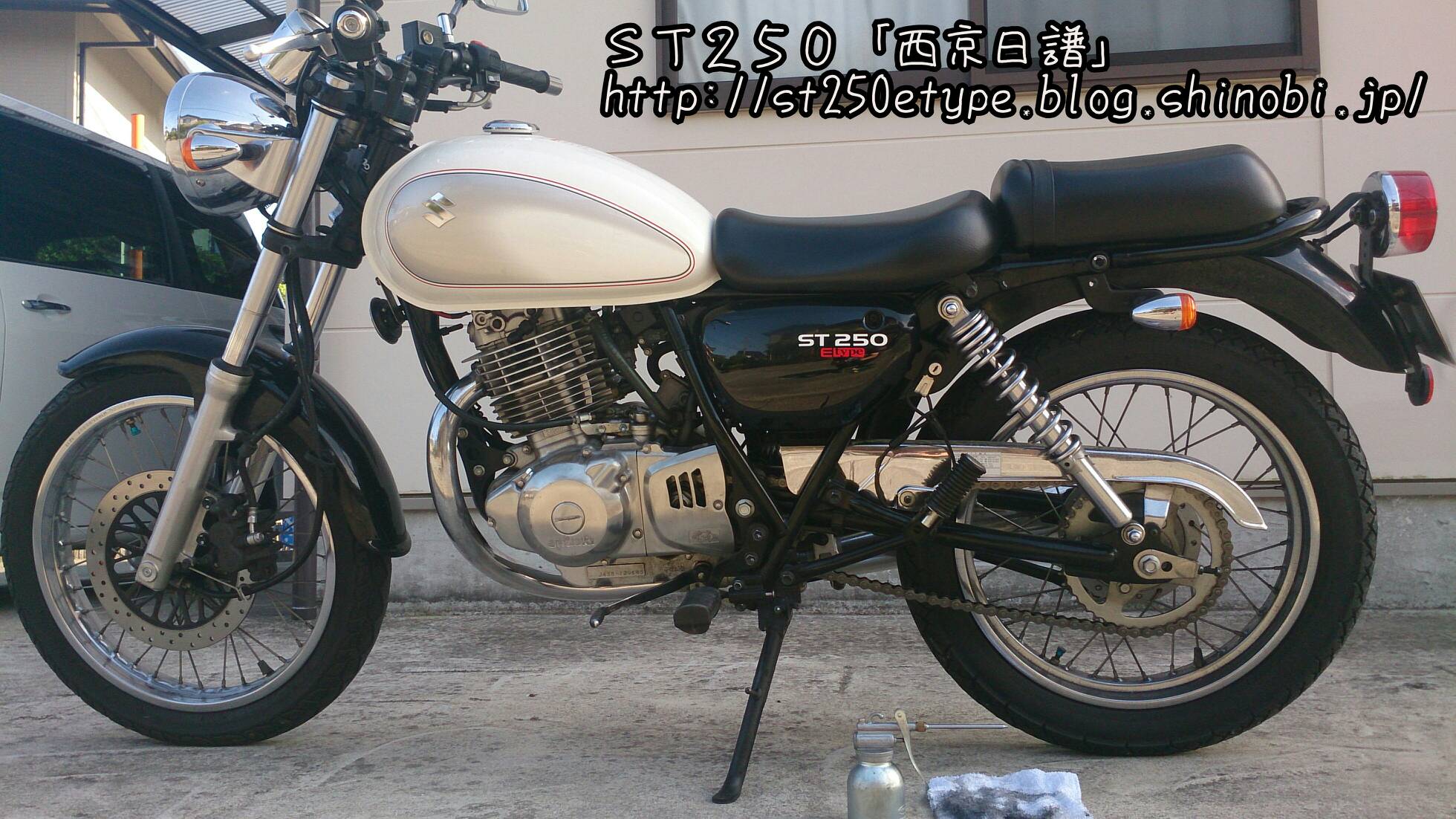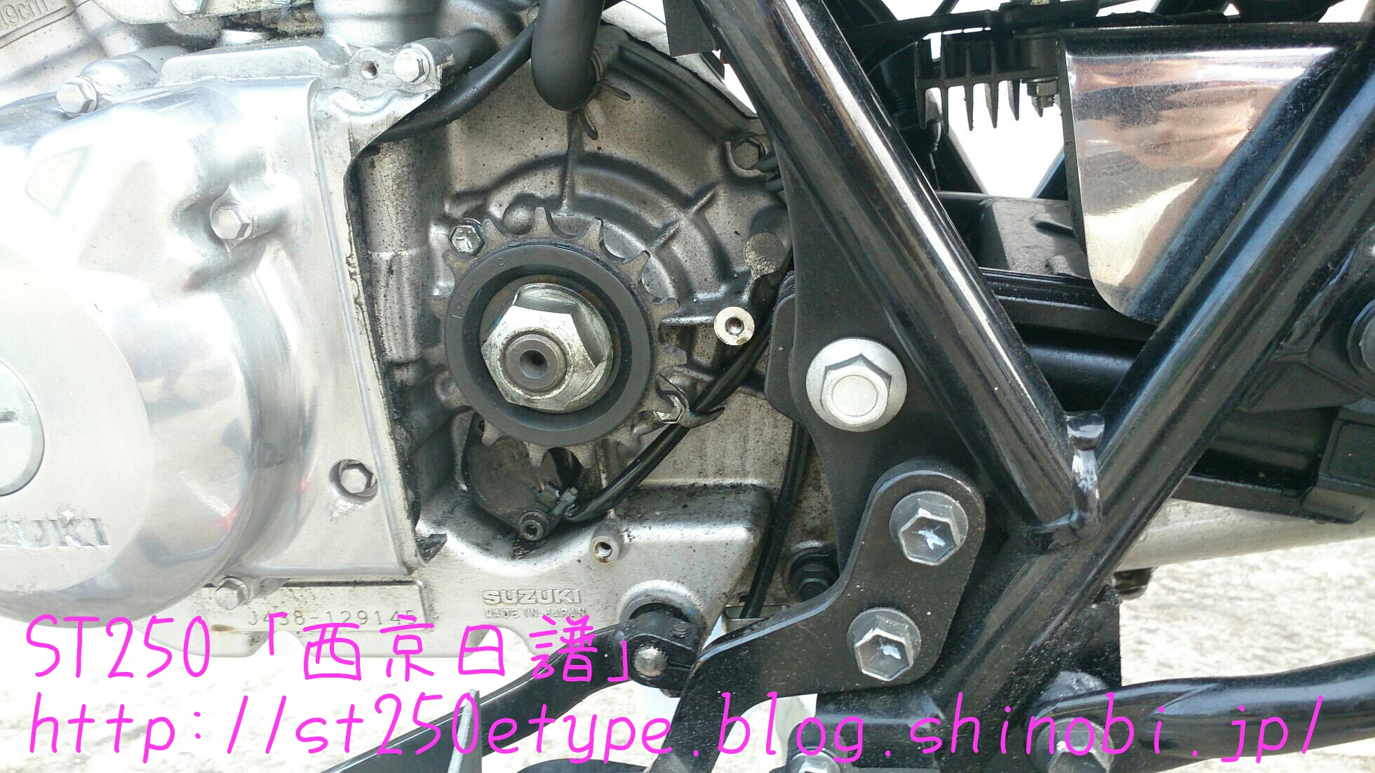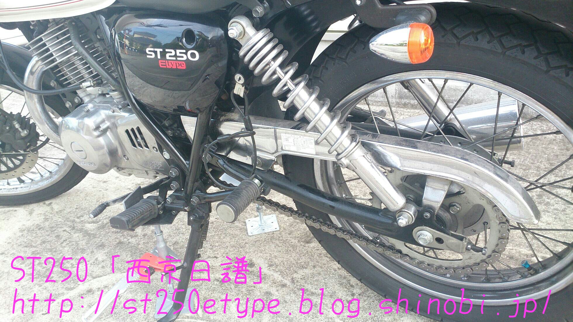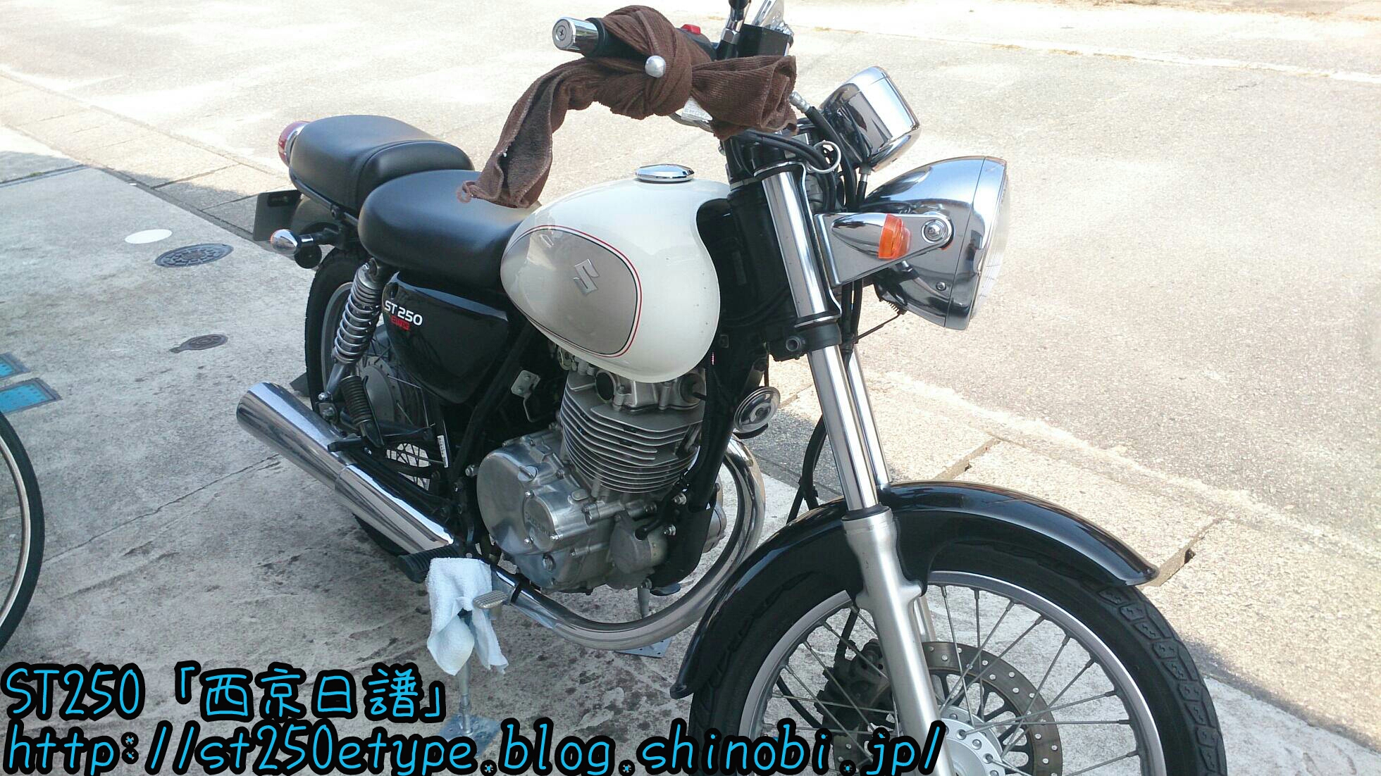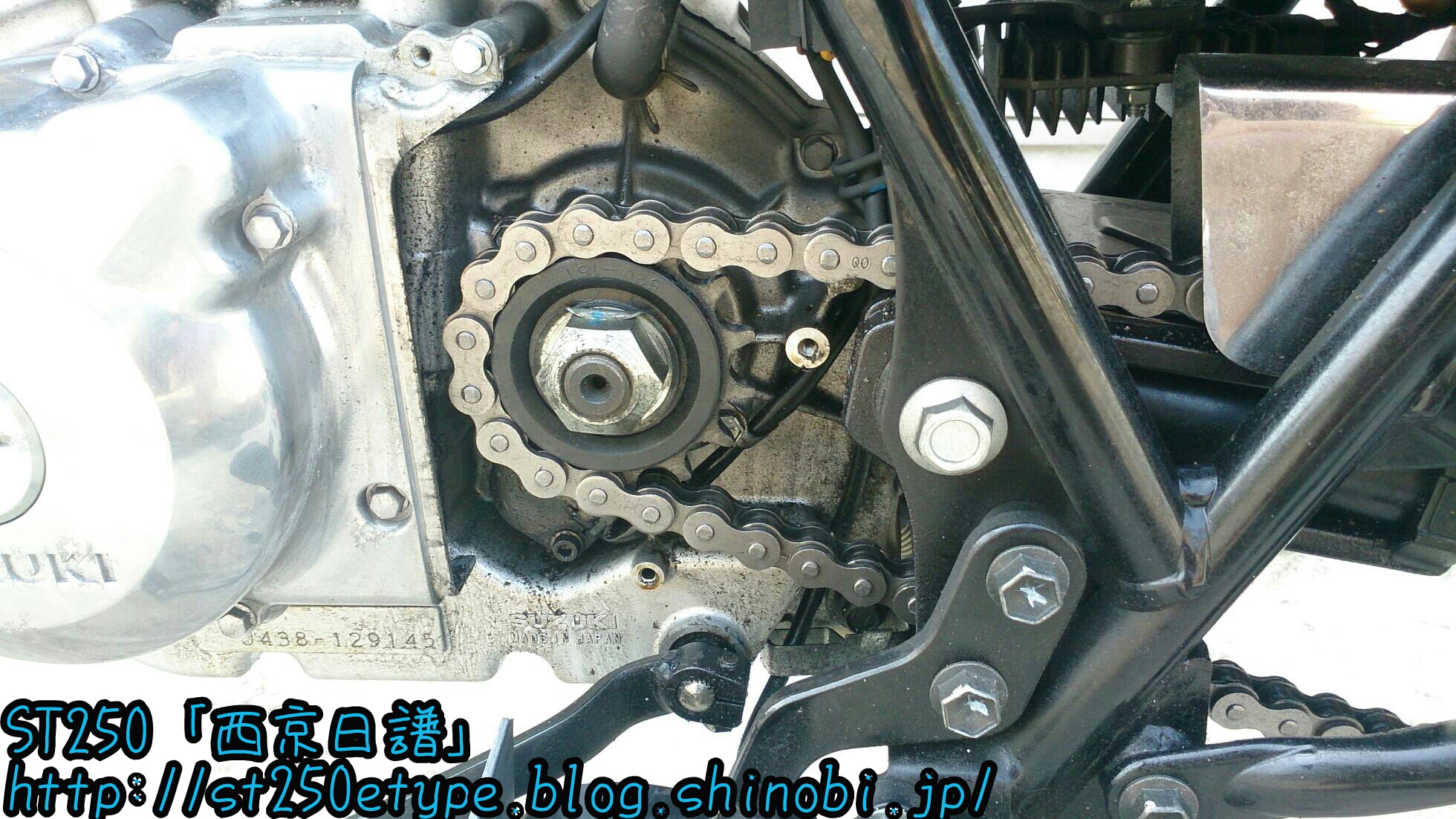 梅雨明けチェーン交換 日記 2016年07月18日 0 梅雨が明けました。梅雨の間はまったく整備をしませんでした。シリコンスプレーに頼って、洗車すらしてません。今後もそうするかもしれません。なるべく手間をかけずに維持したい。今回は、2300kmほど走ったところでレッドバロンにてオイル交換をしてもらいました。(本当は自分でオイル購入して実施する予定でしたが……)そして、オイル交換のタイミング(約3000kmごと)と同時に行おうと設定しているのが「チェーン交換」と「エアクリーナー交換」です。(R2.11.20追記 ※今はチェーンのローテ交換はしていません。捨ててます。)まずはチェーン交換を行いました。鋼製束を利用した簡易ジャッキアップです。第一にフロントブレーキの固定は必須ステップ下(マフラー側)に鋼製束を立てます。一応タオルを当てています。反対(スタンド側)に鋼製束を立て、こちらをレンチで締め上げて高さをつけていきます。これだけ上がれば十分、作業に取りかかります。チェーンの張り調整があるのでアクスルシャフトを緩めます。向かって左は17mm、右は19mmです。タッパーに保管していた、エンジンオイル浸けの予備チェーン。クリップジョイントは100均のエンドカッターで脱着外したチェーン、よく見るとプレートに錆びが浮いています。こちらは内側なので目が行き届かない部分です。今後は給油の際にしっかりとウエスでオイルを塗るようにします。チェーンの取り付けの前に、ここのカバーを外しておかないといけません。もちろんチェーンカバーも。チェーン取り付け。S字フックは意味はありません。チェーンの張りを調整して、それぞれのカバーを取り付けて終了です。チェーンの張りは、メーカー規定より緩めの40mmにしました。交換したチェーンは、再びタッパーにてエンジンオイル浸け。次回の出番まで休憩してもらいます。 ついでに、雨中走行で錆びてしまったマフラーエンドに錆びチェンジャー塗布。全面に塗りました。乾いたら黒染スプレーを吹いておしまいです。黒染めスプレーをしなければ、錆びるのが早いように感じます。(R2.11.20追記※この作業を繰り返していたら、メンテフリーでも赤錆が出にくくなりました。)今回はこれで終了です。「エアクリーナー交換」まで行う元気はありませんでしたので、次回にします。バイク(スズキ)ランキングへ