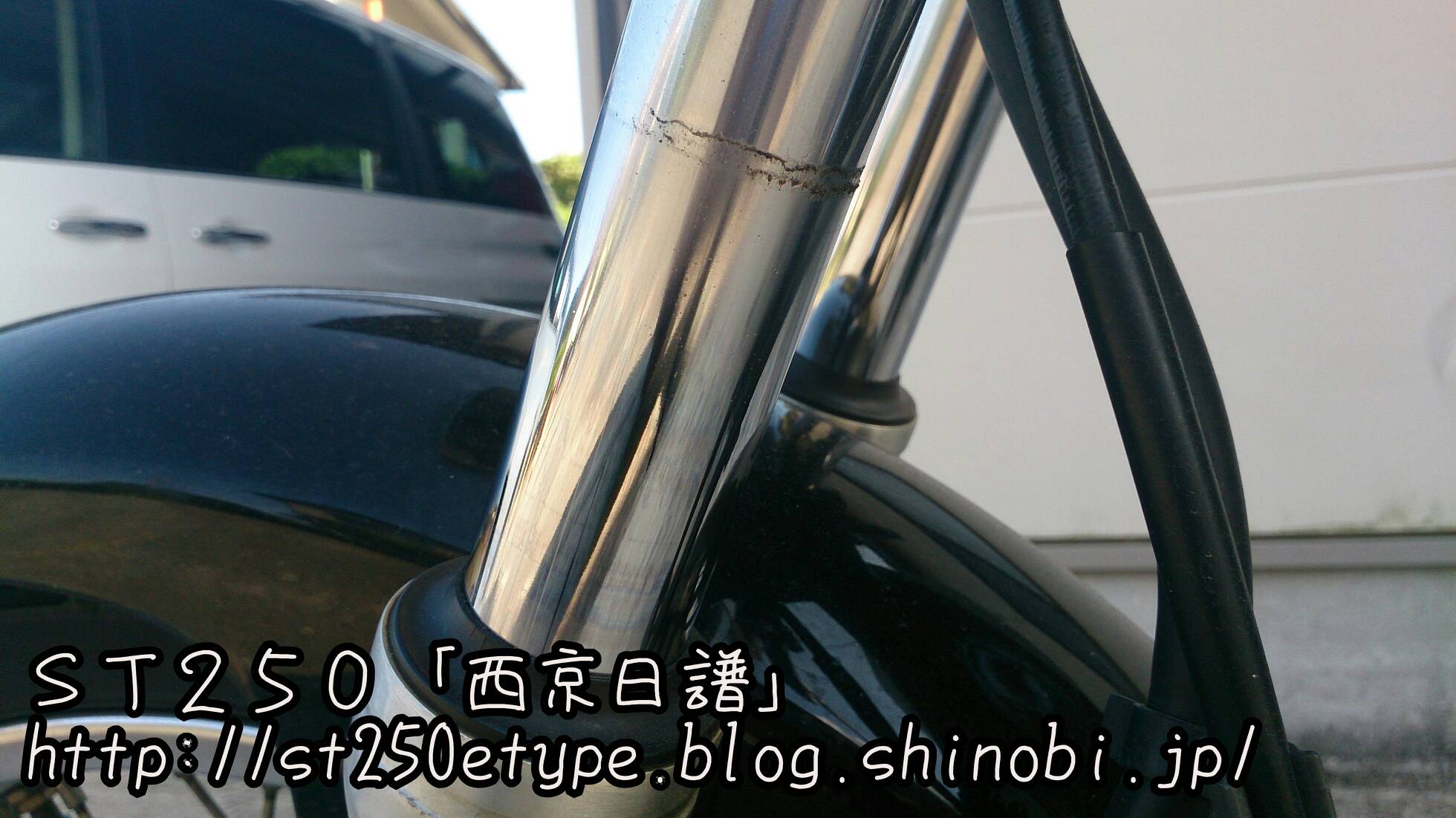 フォークシールの劣化 日記 2016年06月02日 0 一週間ごとのチェーン給油を行いました。センタースタンドはありませんが、全然問題はありません。少しずつ後ろに下げていくだけです。センタースタンドがあれば、それは簡単ですが。このKMCのチェーンはクリップジョイントなので、クリップが目印になって分かりやすいですいつも通り、チェーンに給油して何気なくサスペンションを見ると。お分かりでしょうか?前日に未舗装路を走ったため、沈み込んだ量(汚れの所まで)が見えます「底突き」はしていません。底突きを防ぐには、地面の凹凸部分でわずかに腰を浮かせます。膝で柔らかくステップに立ち、ハンドルも柔らかく握る。こちらはリヤサスです。普段はシリコンスプレーで拭き掃除。さて、フロントフォークをよく見ると……フォークシールに「ヒビ」がたくさん入ってます中古(走行3000km)で購入して3年ほど経過、劣化ですね。しかし、フォークシールの交換はDIYでは難しそう……走行距離が1万kmになったので、フォークオイルの交換をしないといけないと考えていた頃ですなんとか自力でできる方向性を追求したいところですが。バイク(スズキ)ランキングへ