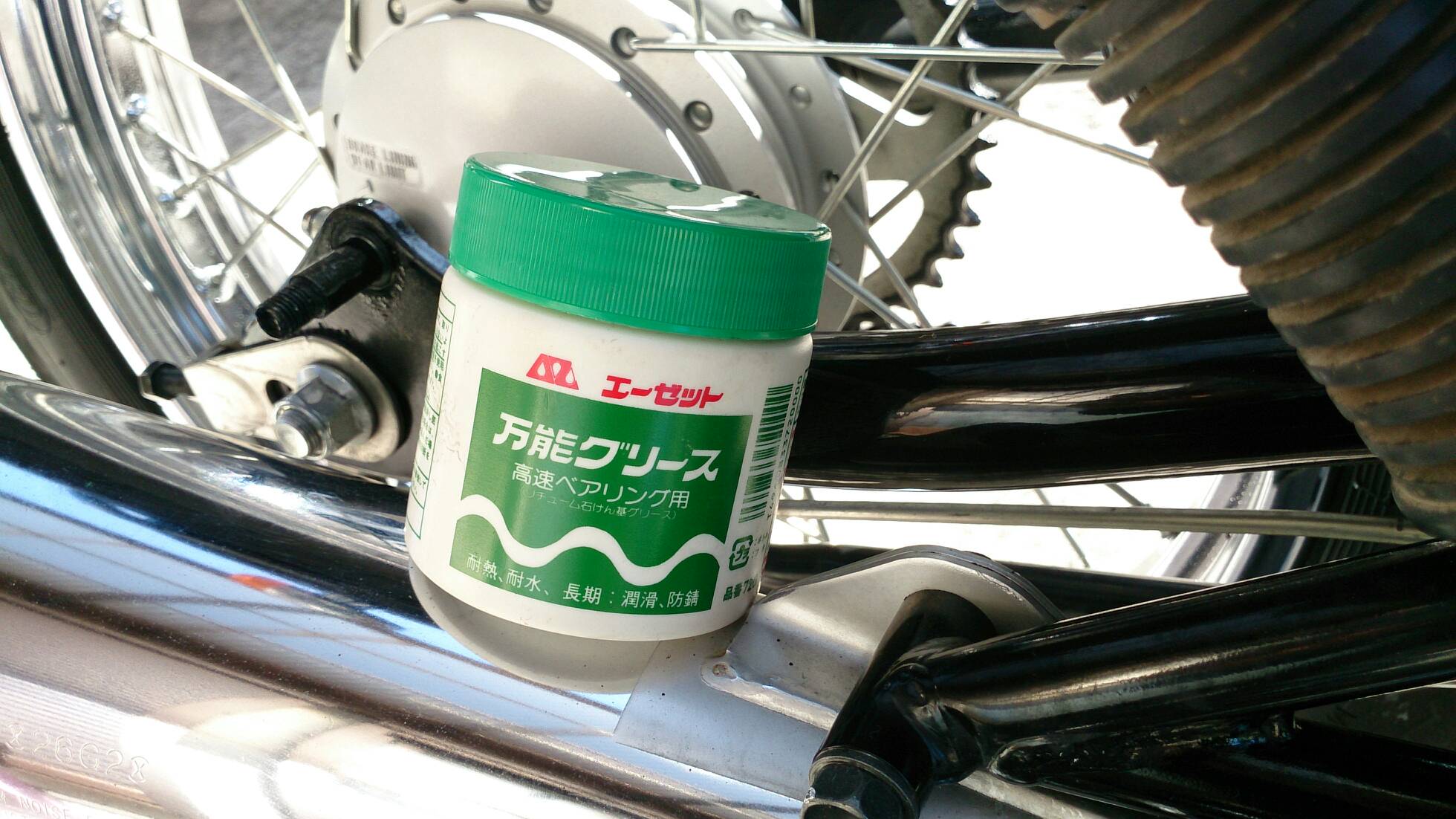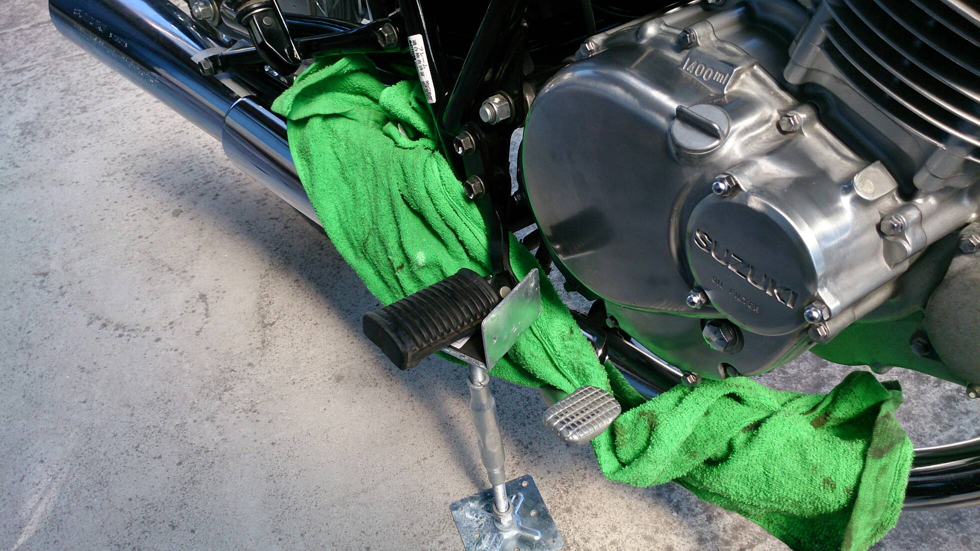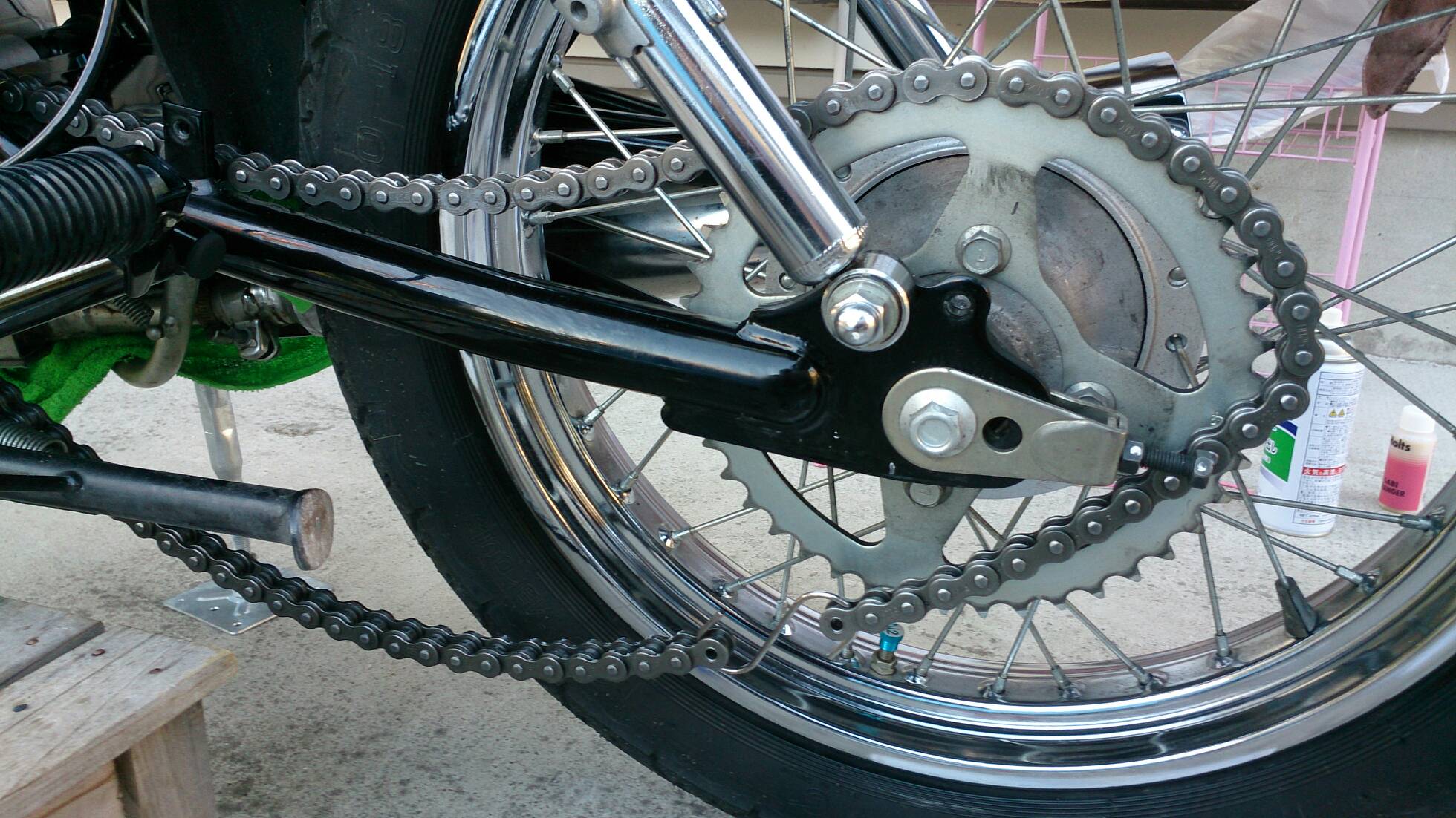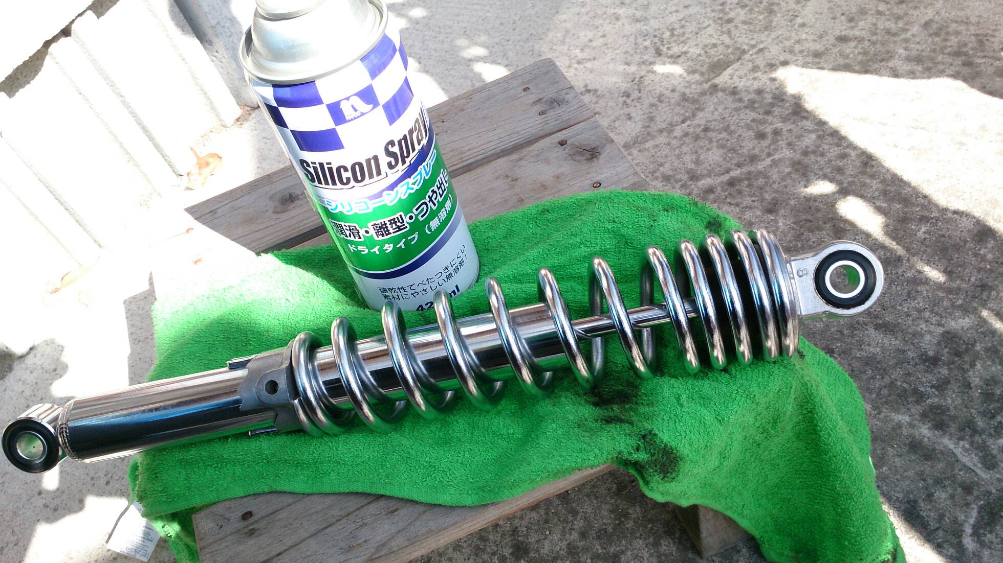 久々の整備 日記 2016年03月22日 1 今回は久々の整備です。半日かけてじっくりやってみました。初めてやってみたこともあったのですが、要領を覚えたので次回からはもう少し早く作業できると思います。整備に関してテーマは「費用は最小限に」です。まずは、ジャッキアップです。ただジャッキアップに関しては、コストパフォーマンスを追求すると危険度が上がります。▲まずはフロントブレーキを固定フェイスタオルで縛りました。▲「鋼製束(こうせいづか)」を立てます。鋼製束は近所のホームセンターにて360円で購入▲反対側反対側は右ステップの下にもう1つ鋼製束を立てます。念のためにマフラーに保護用のタオルをかけています。▲上げるスタンド側の鋼製束の高さを慎重に上げていきます。▲写真は上げすぎタイヤがわずかに浮けばよしよくあるジャッキアップ方法として、スタンドを利用して逆サイドだけを車載パンタジャッキで持ち上げる方法があります。はじめはそうやっていましたが、サイドスタンドへの過負荷が気になったのでやめました。ジャッキアップが完了したところで、リヤサスを外します▲取り外す片方ずつ外した方が、取り付けが楽です▲よく見ると内側に薄錆びいつもはシリコンスプレーで拭くだけですが、今回はピカールで錆びを落とします。▲手入れ後先日のスポーク磨きの要領でピカピカになりました。▲シリコンスプレーシリコンスプレーを全体に吹いて次の錆びや汚れを予防する。安いときは150円くらいで手に入ります。取り付けの準備に入ります。▲グリスを使うこれを塗るのはサスの取り付け部です。▲取り付け部金属面の磨耗を防いで、さらにボルトなどに塗ってカジリつきを予防します。▲綿棒などで取り付けましたら、片側は完了です。これをもう一度繰り返してサスはお仕舞いです。まだ続きます。次はチェーンの清掃です。今まで市販のチェーンルブを使っていたんですが、粘度が高いのと砂利を拾うためエンジンオイルに変更します。▲クリップジョイント100均のエンドカッターでチェーンクリップを外します。チェーンは先日交換したKMCの520Hです。▲外すノンシールチェーンですので抵抗がありません。自重でスルスルと落ちてきます。洗浄した後で、格安エンジンオイルに浸して宙吊りにします。2メートルほどあれば宙吊りにでき、油分は下に流れ落ちていきます。余分なものは写真のようにウエスで拭き取ります。(R2.11.20追記 ※この方法はとても面倒なので今はやっていません。)まだまだ続きます。宙吊りの間にシートを外すことにしました。▲3年分の埃です水拭きします。▲よく見ると、所々に赤錆び▲サビチェンジャーを使う赤錆を良性の黒錆に変化させるものですね。錆はフレームの溶接部の各所に点在してましたので、片っ端から塗り潰します。シートも全体的にシリコンスプレーを使い、表面の艶だしと裏のホチキス針の防錆処置をしました。干していたチェーンを取り付けます。▲S字フックを使ってみたが、あまり意味はありません。▲Made in JAPANST250は国産のバイクです。(R2.11.20追記※最近『MADE IN PRC』というのを見かけます。ご存じですか?正体はただの中国製です。確かな理由は知りませんが『MADE IN CHINA』の印象が悪いためPeoples Republic of CHINAの略である「PRC」と表記して誤魔化しているようです。最近はブレーキパッドの箱の裏に書かれているのを見たことがあります。ま、余談ですが。)今回の整備の内容は以上となります。走行距離が一万キロを越えたのでリフレッシュという感覚ですっきりしました。次はアーシング(正式名称は知らない)をしたいです。それからウインカーのレンズをクリアにしようか迷っています。バイク(スズキ)ランキングへ