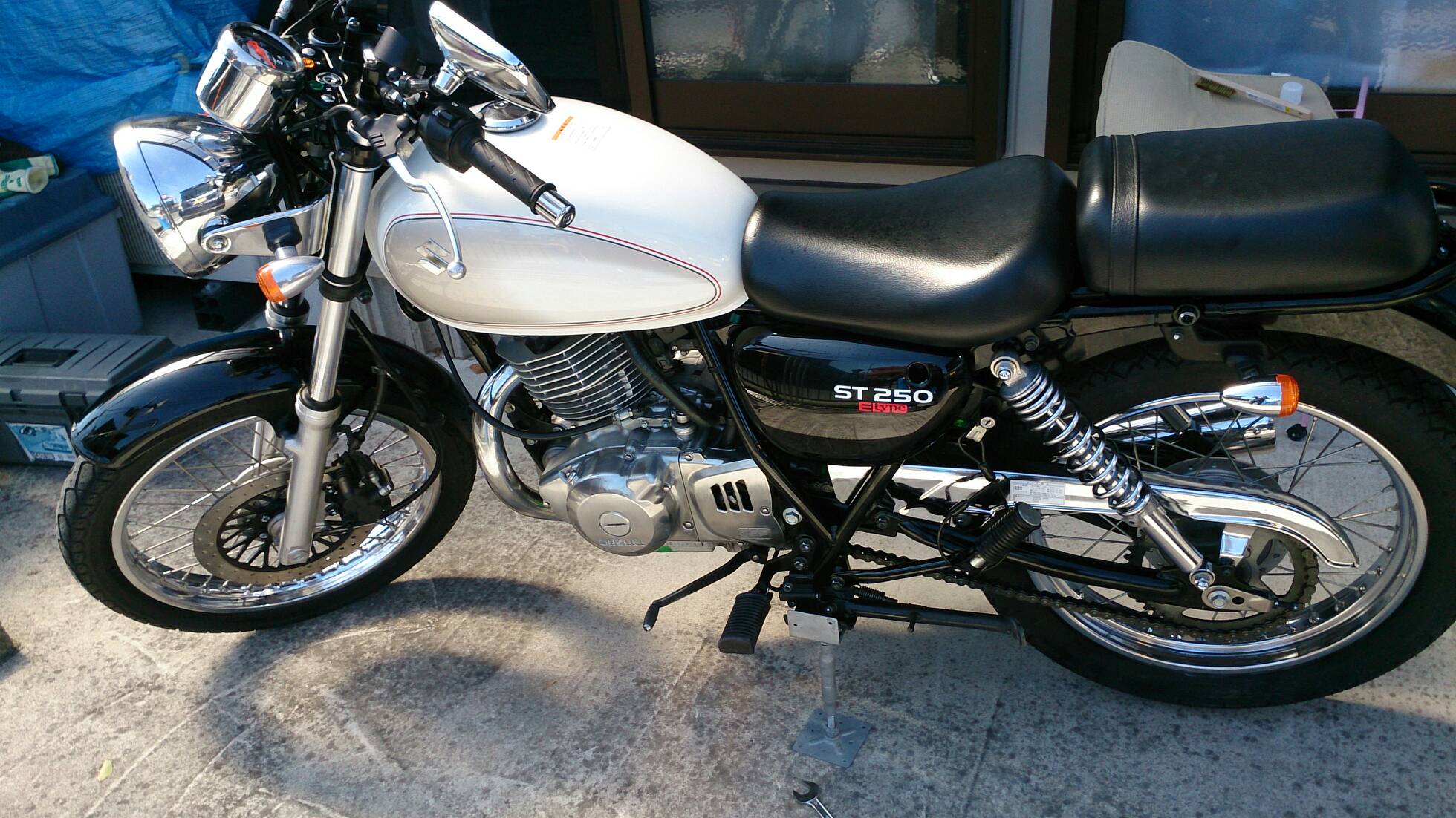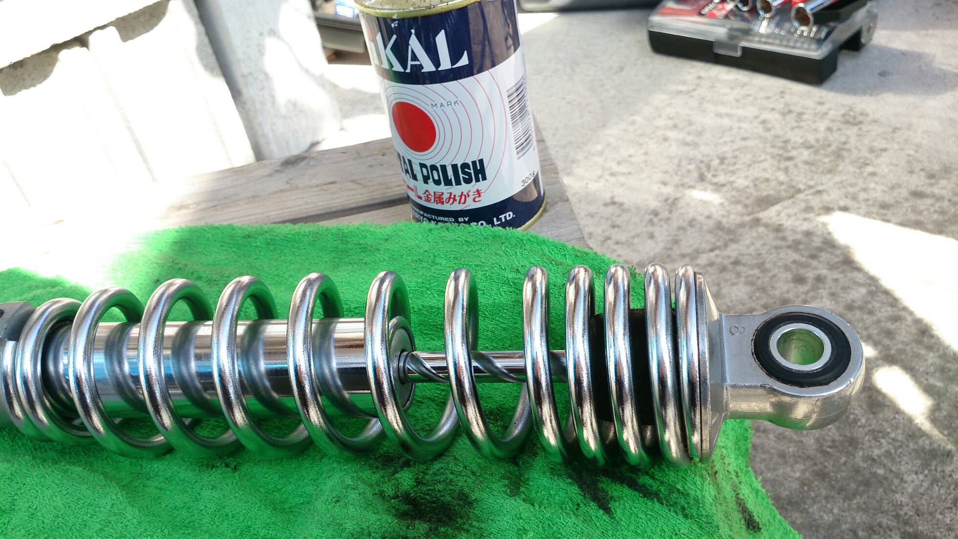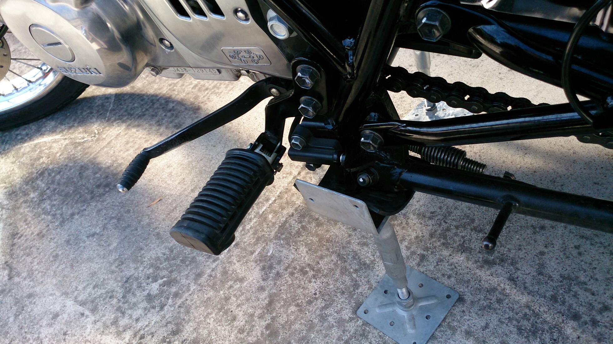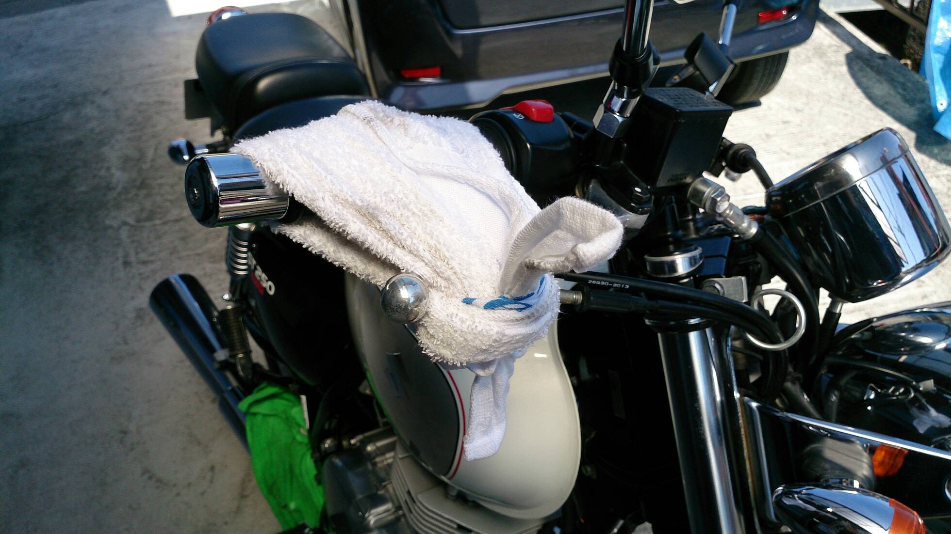 久々の整備 日記 2016年03月22日 1 今回は久々の整備です。半日かけてじっくりやってみました。初めてやってみたこともあったのですが、要領を覚えたので次回からはもう少し早く作業できると思います。整備に関してテーマは「費用は最小限に」です。まずは、ジャッキアップです。ただジャッキアップに関しては、コストパフォーマンスを追求すると危険度が上がります。▲まずはフロントブレーキを固定フェイスタオルで縛りました。▲「鋼製束(こうせいづか)」を立てます。鋼製束は近所のホームセンターにて360円で購入▲反対側反対側は右ステップの下にもう1つ鋼製束を立てます。念のためにマフラーに保護用のタオルをかけています。▲上げるスタンド側の鋼製束の高さを慎重に上げていきます。▲写真は上げすぎタイヤがわずかに浮けばよしよくあるジャッキアップ方法として、スタンドを利用して逆サイドだけを車載パンタジャッキで持ち上げる方法があります。はじめはそうやっていましたが、サイドスタンドへの過負荷が気になったのでやめました。ジャッキアップが完了したところで、リヤサスを外します▲取り外す片方ずつ外した方が、取り付けが楽です▲よく見ると内側に薄錆びいつもはシリコンスプレーで拭くだけですが、今回はピカールで錆びを落とします。▲手入れ後先日のスポーク磨きの要領でピカピカになりました。▲シリコンスプレーシリコンスプレーを全体に吹いて次の錆びや汚れを予防する。安いときは150円くらいで手に入ります。取り付けの準備に入ります。▲グリスを使うこれを塗るのはサスの取り付け部です。▲取り付け部金属面の磨耗を防いで、さらにボルトなどに塗ってカジリつきを予防します。▲綿棒などで取り付けましたら、片側は完了です。これをもう一度繰り返してサスはお仕舞いです。まだ続きます。次はチェーンの清掃です。今まで市販のチェーンルブを使っていたんですが、粘度が高いのと砂利を拾うためエンジンオイルに変更します。▲クリップジョイント100均のエンドカッターでチェーンクリップを外します。チェーンは先日交換したKMCの520Hです。▲外すノンシールチェーンですので抵抗がありません。自重でスルスルと落ちてきます。洗浄した後で、格安エンジンオイルに浸して宙吊りにします。2メートルほどあれば宙吊りにでき、油分は下に流れ落ちていきます。余分なものは写真のようにウエスで拭き取ります。(R2.11.20追記 ※この方法はとても面倒なので今はやっていません。)まだまだ続きます。宙吊りの間にシートを外すことにしました。▲3年分の埃です水拭きします。▲よく見ると、所々に赤錆び▲サビチェンジャーを使う赤錆を良性の黒錆に変化させるものですね。錆はフレームの溶接部の各所に点在してましたので、片っ端から塗り潰します。シートも全体的にシリコンスプレーを使い、表面の艶だしと裏のホチキス針の防錆処置をしました。干していたチェーンを取り付けます。▲S字フックを使ってみたが、あまり意味はありません。▲Made in JAPANST250は国産のバイクです。(R2.11.20追記※最近『MADE IN PRC』というのを見かけます。ご存じですか?正体はただの中国製です。確かな理由は知りませんが『MADE IN CHINA』の印象が悪いためPeoples Republic of CHINAの略である「PRC」と表記して誤魔化しているようです。最近はブレーキパッドの箱の裏に書かれているのを見たことがあります。ま、余談ですが。)今回の整備の内容は以上となります。走行距離が一万キロを越えたのでリフレッシュという感覚ですっきりしました。次はアーシング(正式名称は知らない)をしたいです。それからウインカーのレンズをクリアにしようか迷っています。バイク(スズキ)ランキングへ