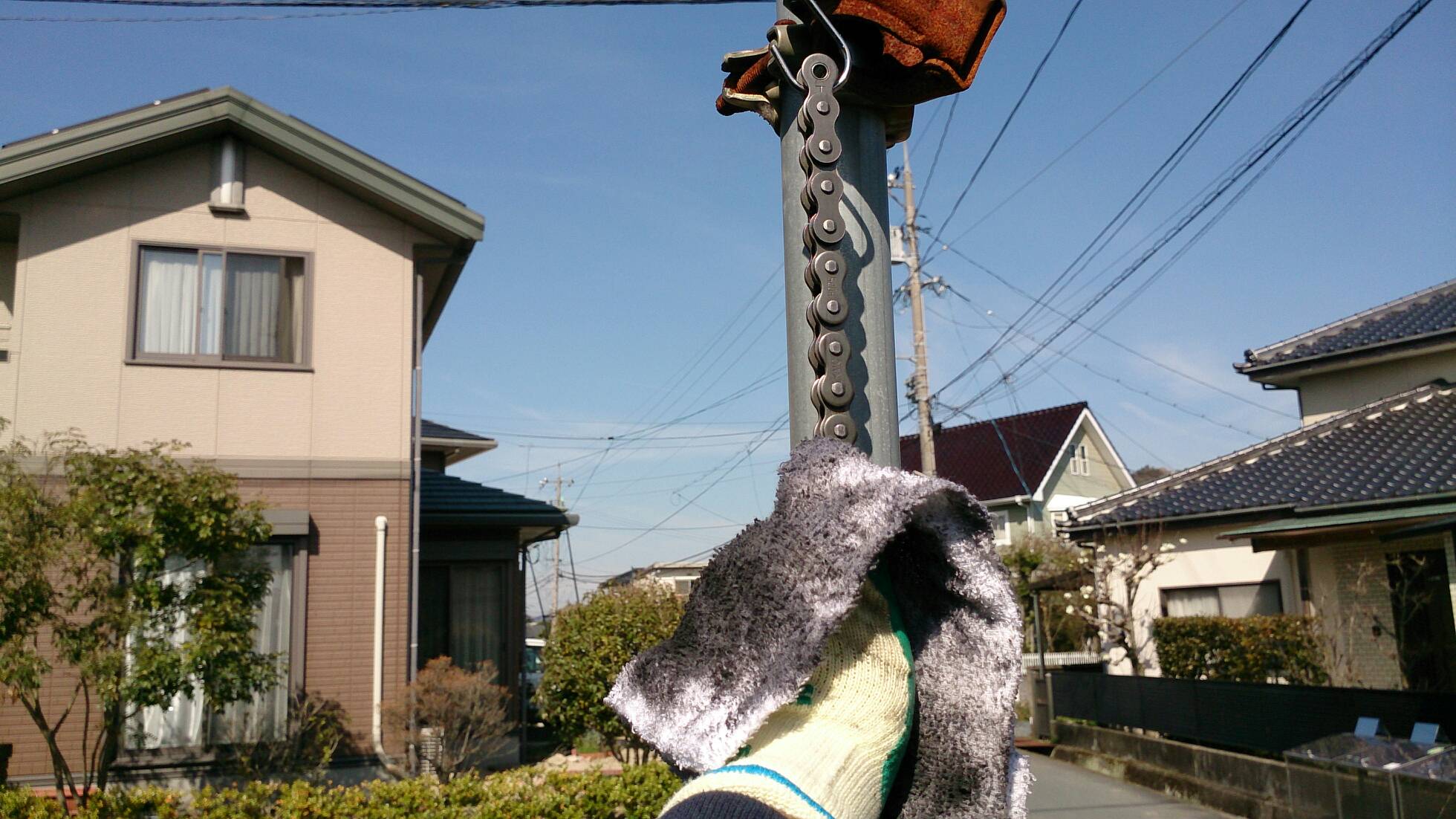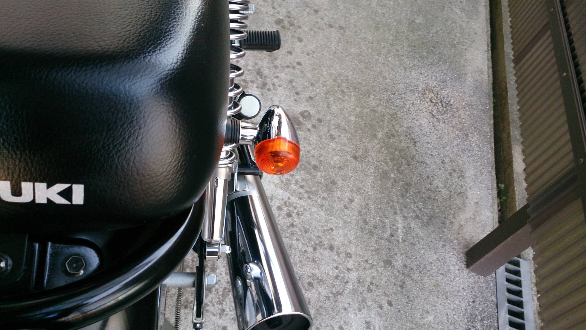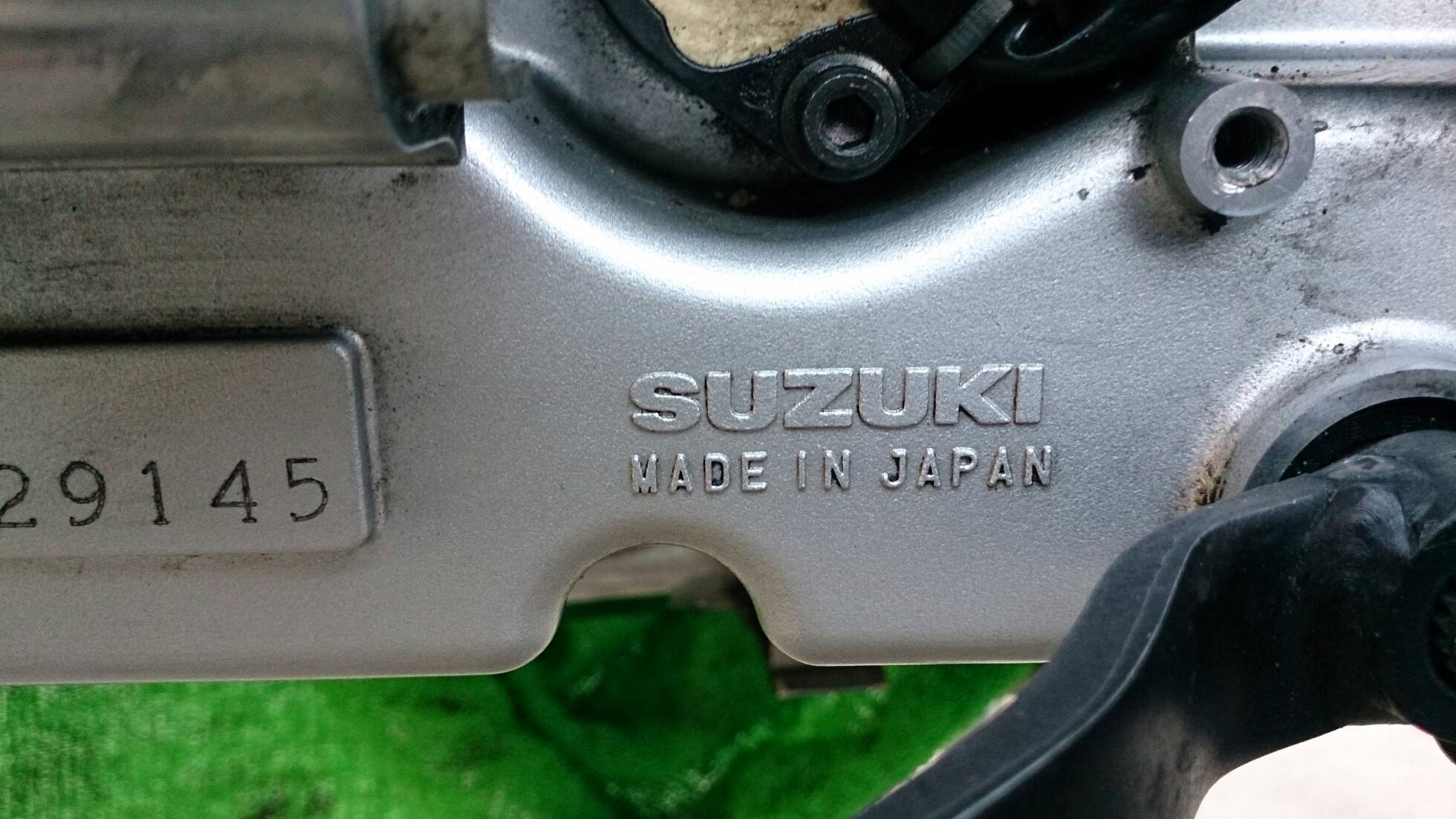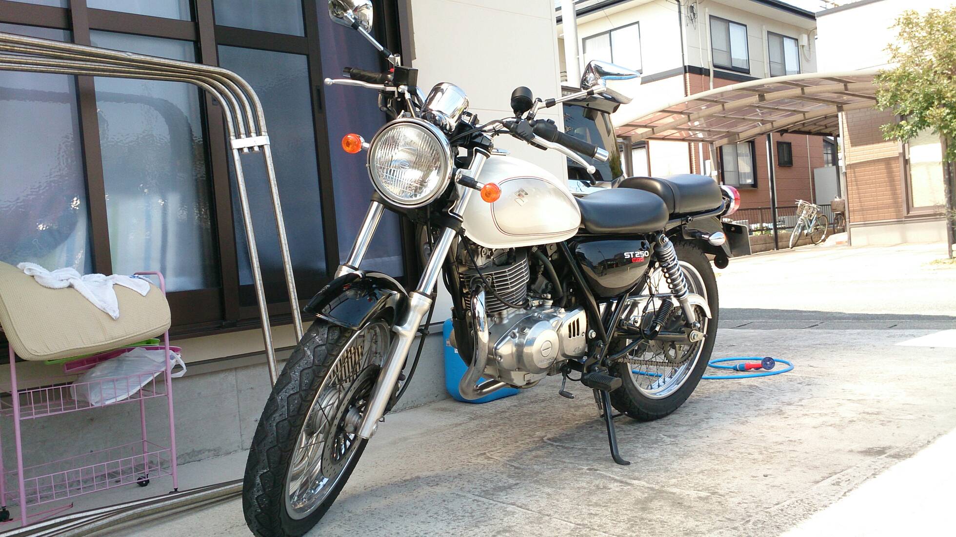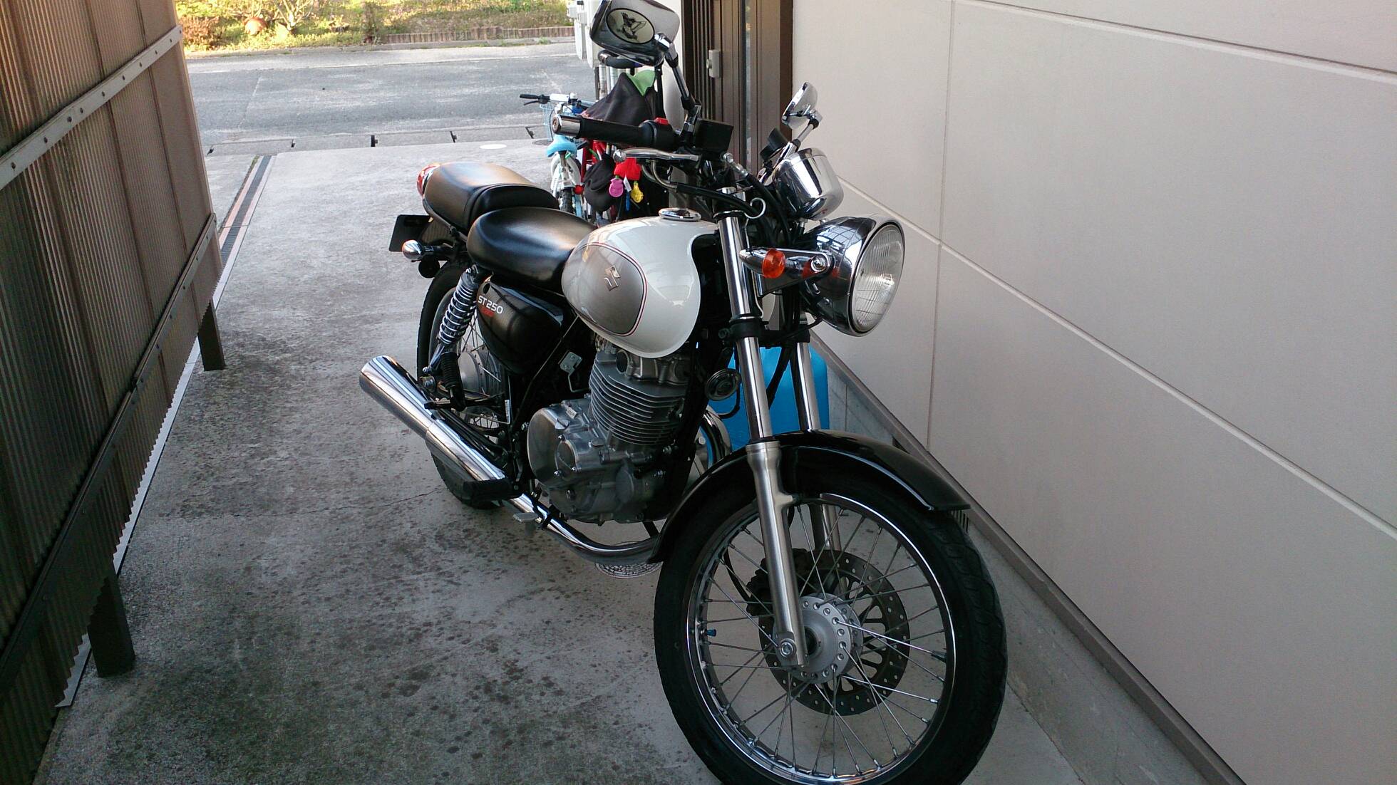 久々の整備 日記 2016年03月22日 1 今回は久々の整備です。半日かけてじっくりやってみました。初めてやってみたこともあったのですが、要領を覚えたので次回からはもう少し早く作業できると思います。整備に関してテーマは「費用は最小限に」です。まずは、ジャッキアップです。ただジャッキアップに関しては、コストパフォーマンスを追求すると危険度が上がります。▲まずはフロントブレーキを固定フェイスタオルで縛りました。▲「鋼製束(こうせいづか)」を立てます。鋼製束は近所のホームセンターにて360円で購入▲反対側反対側は右ステップの下にもう1つ鋼製束を立てます。念のためにマフラーに保護用のタオルをかけています。▲上げるスタンド側の鋼製束の高さを慎重に上げていきます。▲写真は上げすぎタイヤがわずかに浮けばよしよくあるジャッキアップ方法として、スタンドを利用して逆サイドだけを車載パンタジャッキで持ち上げる方法があります。はじめはそうやっていましたが、サイドスタンドへの過負荷が気になったのでやめました。ジャッキアップが完了したところで、リヤサスを外します▲取り外す片方ずつ外した方が、取り付けが楽です▲よく見ると内側に薄錆びいつもはシリコンスプレーで拭くだけですが、今回はピカールで錆びを落とします。▲手入れ後先日のスポーク磨きの要領でピカピカになりました。▲シリコンスプレーシリコンスプレーを全体に吹いて次の錆びや汚れを予防する。安いときは150円くらいで手に入ります。取り付けの準備に入ります。▲グリスを使うこれを塗るのはサスの取り付け部です。▲取り付け部金属面の磨耗を防いで、さらにボルトなどに塗ってカジリつきを予防します。▲綿棒などで取り付けましたら、片側は完了です。これをもう一度繰り返してサスはお仕舞いです。まだ続きます。次はチェーンの清掃です。今まで市販のチェーンルブを使っていたんですが、粘度が高いのと砂利を拾うためエンジンオイルに変更します。▲クリップジョイント100均のエンドカッターでチェーンクリップを外します。チェーンは先日交換したKMCの520Hです。▲外すノンシールチェーンですので抵抗がありません。自重でスルスルと落ちてきます。洗浄した後で、格安エンジンオイルに浸して宙吊りにします。2メートルほどあれば宙吊りにでき、油分は下に流れ落ちていきます。余分なものは写真のようにウエスで拭き取ります。(R2.11.20追記 ※この方法はとても面倒なので今はやっていません。)まだまだ続きます。宙吊りの間にシートを外すことにしました。▲3年分の埃です水拭きします。▲よく見ると、所々に赤錆び▲サビチェンジャーを使う赤錆を良性の黒錆に変化させるものですね。錆はフレームの溶接部の各所に点在してましたので、片っ端から塗り潰します。シートも全体的にシリコンスプレーを使い、表面の艶だしと裏のホチキス針の防錆処置をしました。干していたチェーンを取り付けます。▲S字フックを使ってみたが、あまり意味はありません。▲Made in JAPANST250は国産のバイクです。(R2.11.20追記※最近『MADE IN PRC』というのを見かけます。ご存じですか?正体はただの中国製です。確かな理由は知りませんが『MADE IN CHINA』の印象が悪いためPeoples Republic of CHINAの略である「PRC」と表記して誤魔化しているようです。最近はブレーキパッドの箱の裏に書かれているのを見たことがあります。ま、余談ですが。)今回の整備の内容は以上となります。走行距離が一万キロを越えたのでリフレッシュという感覚ですっきりしました。次はアーシング(正式名称は知らない)をしたいです。それからウインカーのレンズをクリアにしようか迷っています。バイク(スズキ)ランキングへ