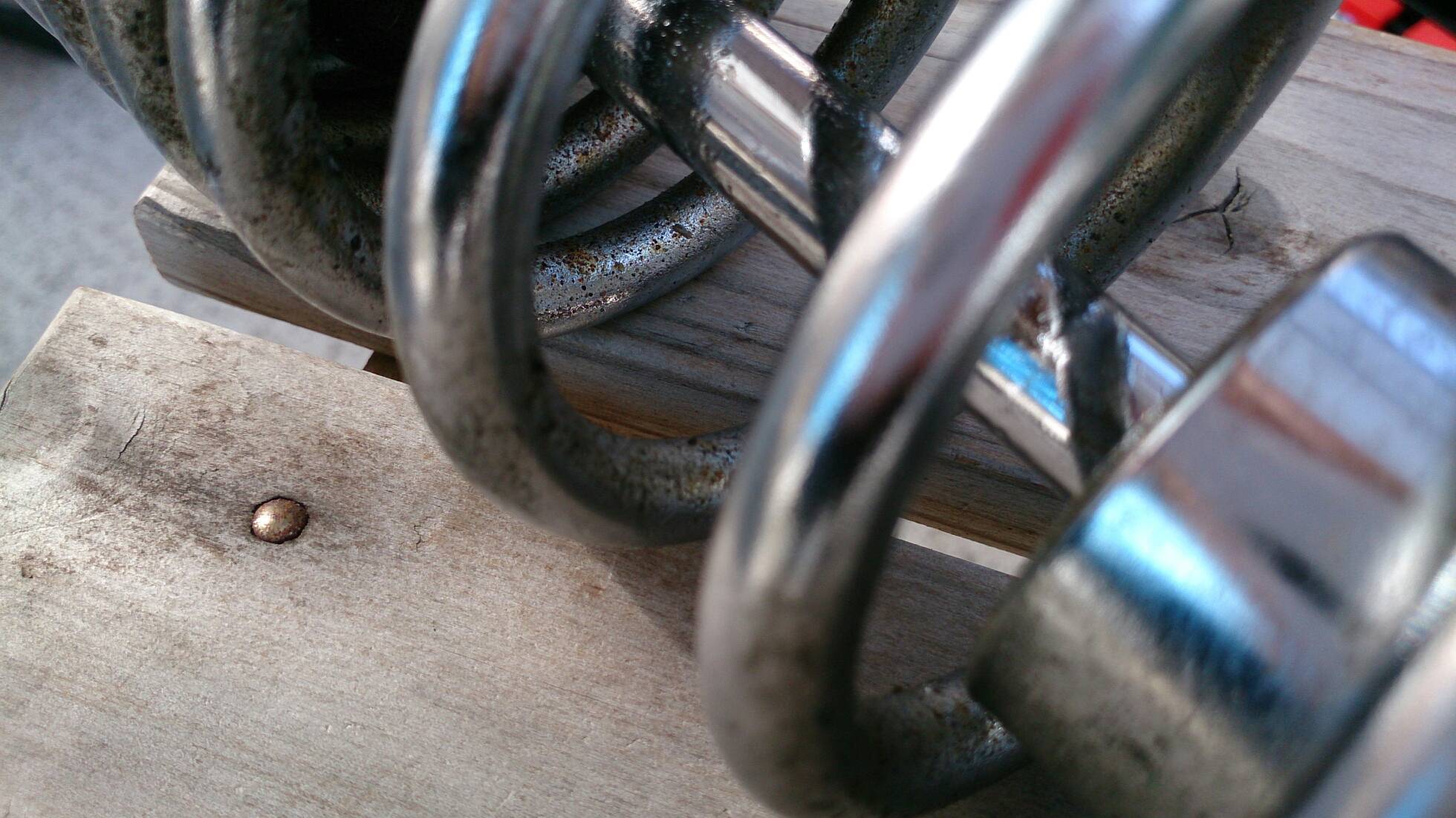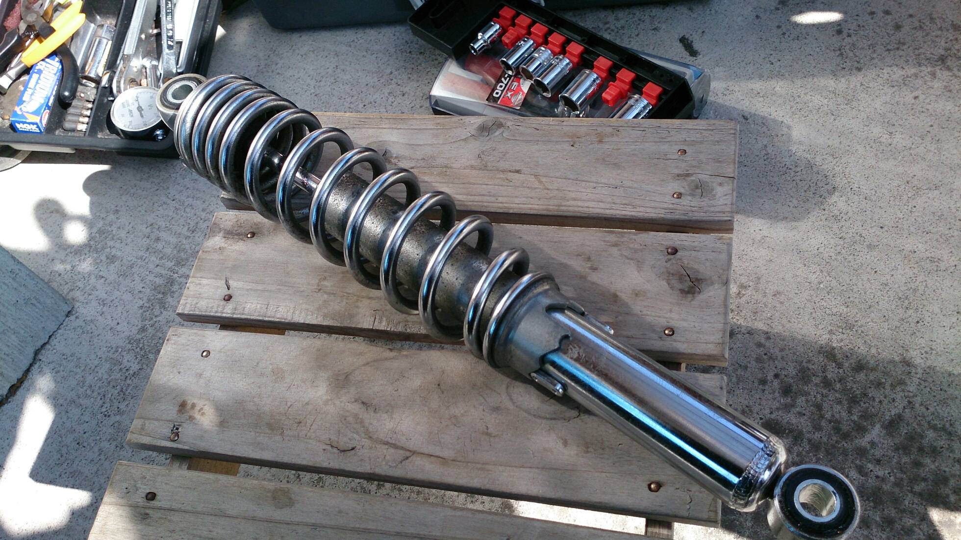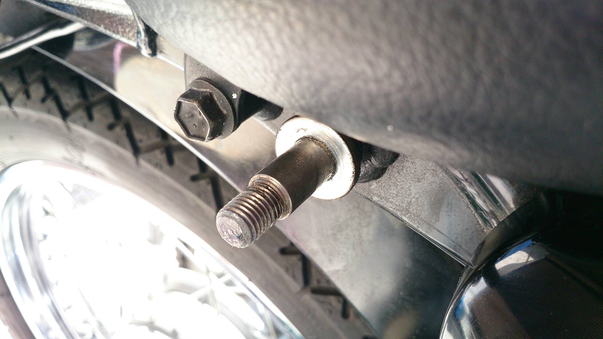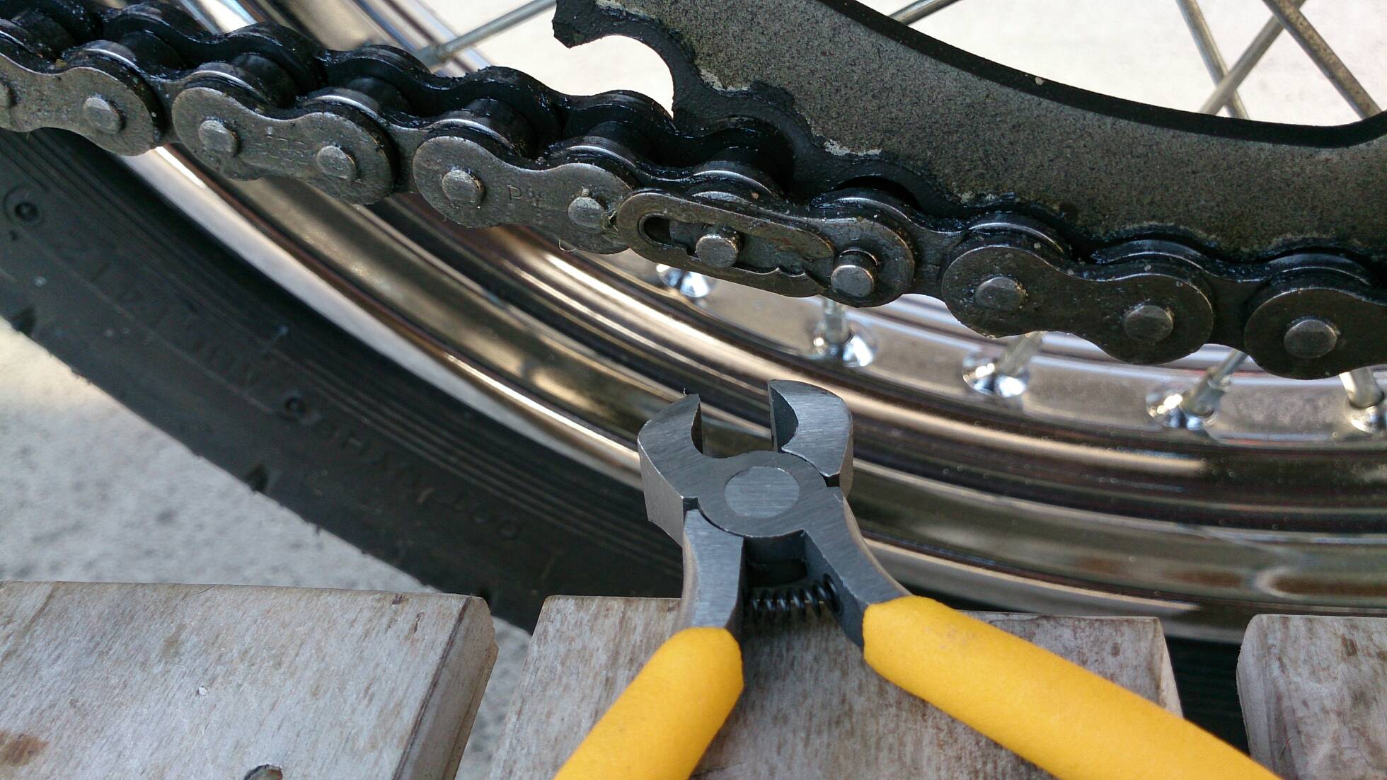 久々の整備 日記 2016年03月22日 1 今回は久々の整備です。半日かけてじっくりやってみました。初めてやってみたこともあったのですが、要領を覚えたので次回からはもう少し早く作業できると思います。整備に関してテーマは「費用は最小限に」です。まずは、ジャッキアップです。ただジャッキアップに関しては、コストパフォーマンスを追求すると危険度が上がります。▲まずはフロントブレーキを固定フェイスタオルで縛りました。▲「鋼製束(こうせいづか)」を立てます。鋼製束は近所のホームセンターにて360円で購入▲反対側反対側は右ステップの下にもう1つ鋼製束を立てます。念のためにマフラーに保護用のタオルをかけています。▲上げるスタンド側の鋼製束の高さを慎重に上げていきます。▲写真は上げすぎタイヤがわずかに浮けばよしよくあるジャッキアップ方法として、スタンドを利用して逆サイドだけを車載パンタジャッキで持ち上げる方法があります。はじめはそうやっていましたが、サイドスタンドへの過負荷が気になったのでやめました。ジャッキアップが完了したところで、リヤサスを外します▲取り外す片方ずつ外した方が、取り付けが楽です▲よく見ると内側に薄錆びいつもはシリコンスプレーで拭くだけですが、今回はピカールで錆びを落とします。▲手入れ後先日のスポーク磨きの要領でピカピカになりました。▲シリコンスプレーシリコンスプレーを全体に吹いて次の錆びや汚れを予防する。安いときは150円くらいで手に入ります。取り付けの準備に入ります。▲グリスを使うこれを塗るのはサスの取り付け部です。▲取り付け部金属面の磨耗を防いで、さらにボルトなどに塗ってカジリつきを予防します。▲綿棒などで取り付けましたら、片側は完了です。これをもう一度繰り返してサスはお仕舞いです。まだ続きます。次はチェーンの清掃です。今まで市販のチェーンルブを使っていたんですが、粘度が高いのと砂利を拾うためエンジンオイルに変更します。▲クリップジョイント100均のエンドカッターでチェーンクリップを外します。チェーンは先日交換したKMCの520Hです。▲外すノンシールチェーンですので抵抗がありません。自重でスルスルと落ちてきます。洗浄した後で、格安エンジンオイルに浸して宙吊りにします。2メートルほどあれば宙吊りにでき、油分は下に流れ落ちていきます。余分なものは写真のようにウエスで拭き取ります。(R2.11.20追記 ※この方法はとても面倒なので今はやっていません。)まだまだ続きます。宙吊りの間にシートを外すことにしました。▲3年分の埃です水拭きします。▲よく見ると、所々に赤錆び▲サビチェンジャーを使う赤錆を良性の黒錆に変化させるものですね。錆はフレームの溶接部の各所に点在してましたので、片っ端から塗り潰します。シートも全体的にシリコンスプレーを使い、表面の艶だしと裏のホチキス針の防錆処置をしました。干していたチェーンを取り付けます。▲S字フックを使ってみたが、あまり意味はありません。▲Made in JAPANST250は国産のバイクです。(R2.11.20追記※最近『MADE IN PRC』というのを見かけます。ご存じですか?正体はただの中国製です。確かな理由は知りませんが『MADE IN CHINA』の印象が悪いためPeoples Republic of CHINAの略である「PRC」と表記して誤魔化しているようです。最近はブレーキパッドの箱の裏に書かれているのを見たことがあります。ま、余談ですが。)今回の整備の内容は以上となります。走行距離が一万キロを越えたのでリフレッシュという感覚ですっきりしました。次はアーシング(正式名称は知らない)をしたいです。それからウインカーのレンズをクリアにしようか迷っています。バイク(スズキ)ランキングへ