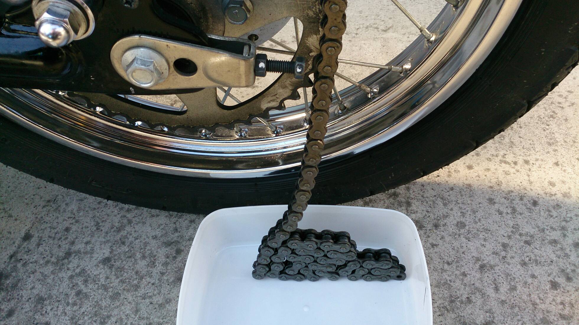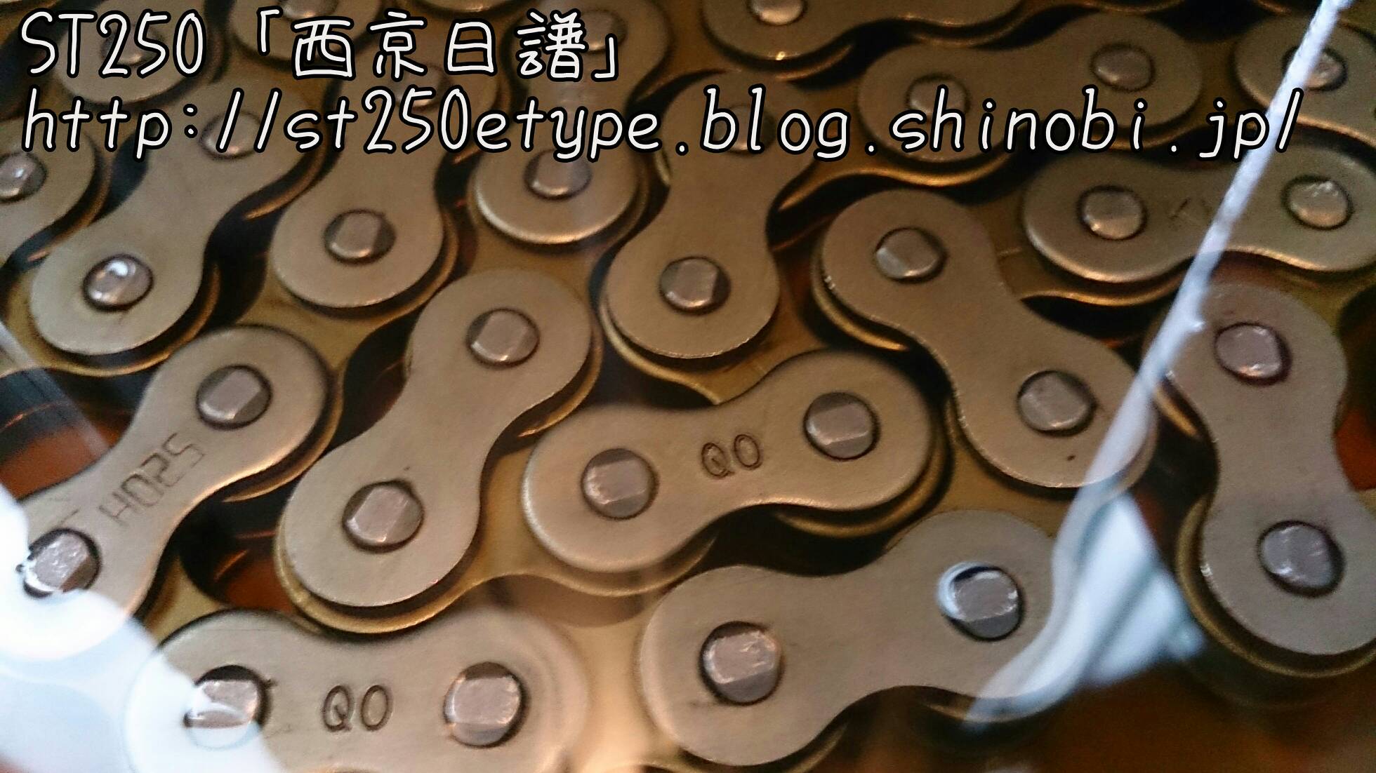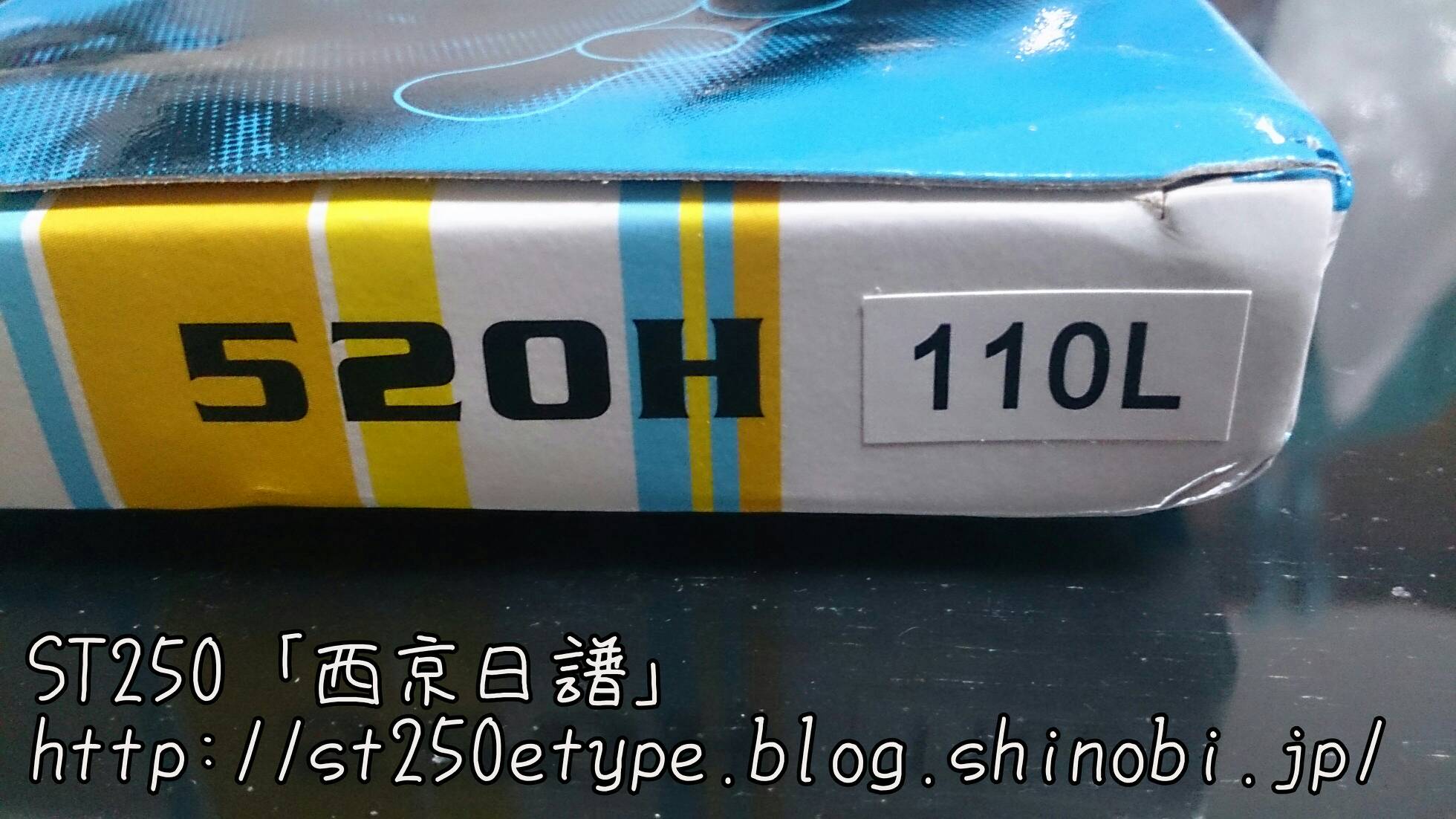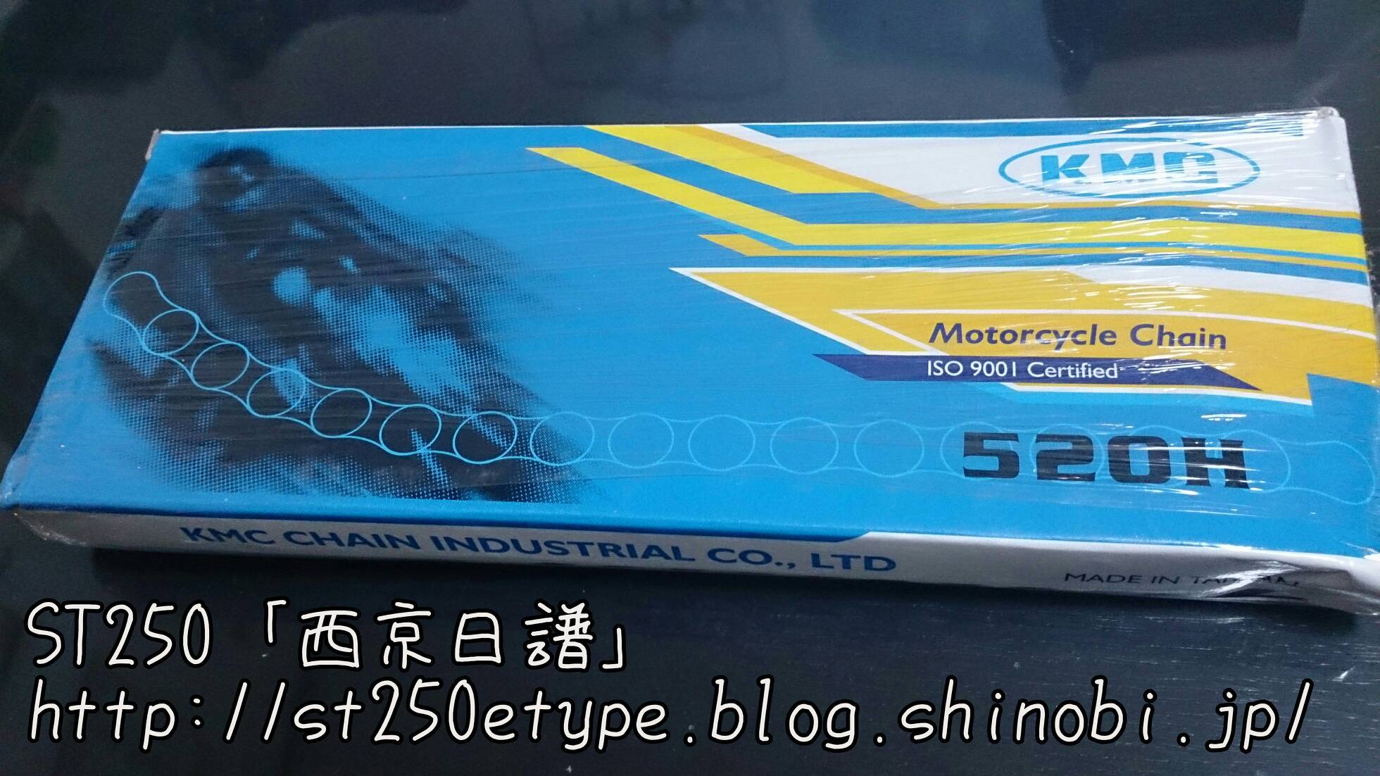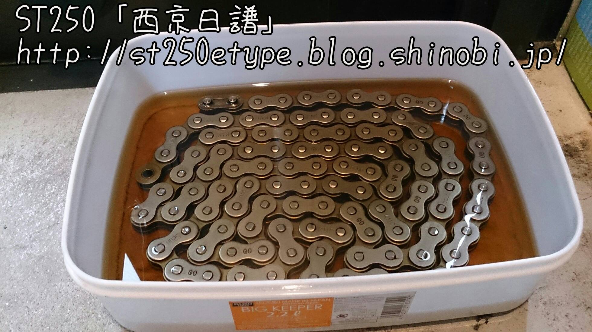 交換用チェーン(KMC 520H) 日記 2016年05月06日 0 最近はSTの整備をしていませんでした。4月から仕事が繁忙期に入ったためですが、荒天時も構わず乗り続けました。ただ、週1度のチェーンへの注油のみ。チェーンを交換してから約1000km乗りましたが、初期伸びはありませんでした。こまめに注油すると摩耗せず、伸びないのか?エンジンオイルを注油していますが、サラサラしている分切れるのが早いです。しかしスプロケットもチェーンも汚れません。非常に満足です。ただ、注油してすぐは垂れてきます。スプロケカバーの周辺とか、サイドスタンド付近などに油が垂れますのでアパートなどの駐輪場では汚さないよう注意が必要。で、交換用のチェーンを購入しました。(R2.11.20追記※結局、今はローテ交換していません。面倒なので。チェーンが痛んできたら買い替える、ということにしています。安いですし。)前回と同じくヤフオクの同じ出品物です。1990円+送料360円での購入、一番安いと思います。使うのは108コマですので、110コマを購入です。早速、軽く保護油をウエスで拭き取ってエンジンオイルにドボンと浸けます。タッパーは屋外ではすぐに劣化するので、次の出番まで玄関で保管します。エンジンオイルの匂いがするのでフタをするのは必須です。よく見ると、刻印が前回の物と違いました。前回は「PW」でした。この刻印は何なのでしょうか?交換の際に間違えないようにできるので、いいんですが。バイク(スズキ)ランキングへ PR