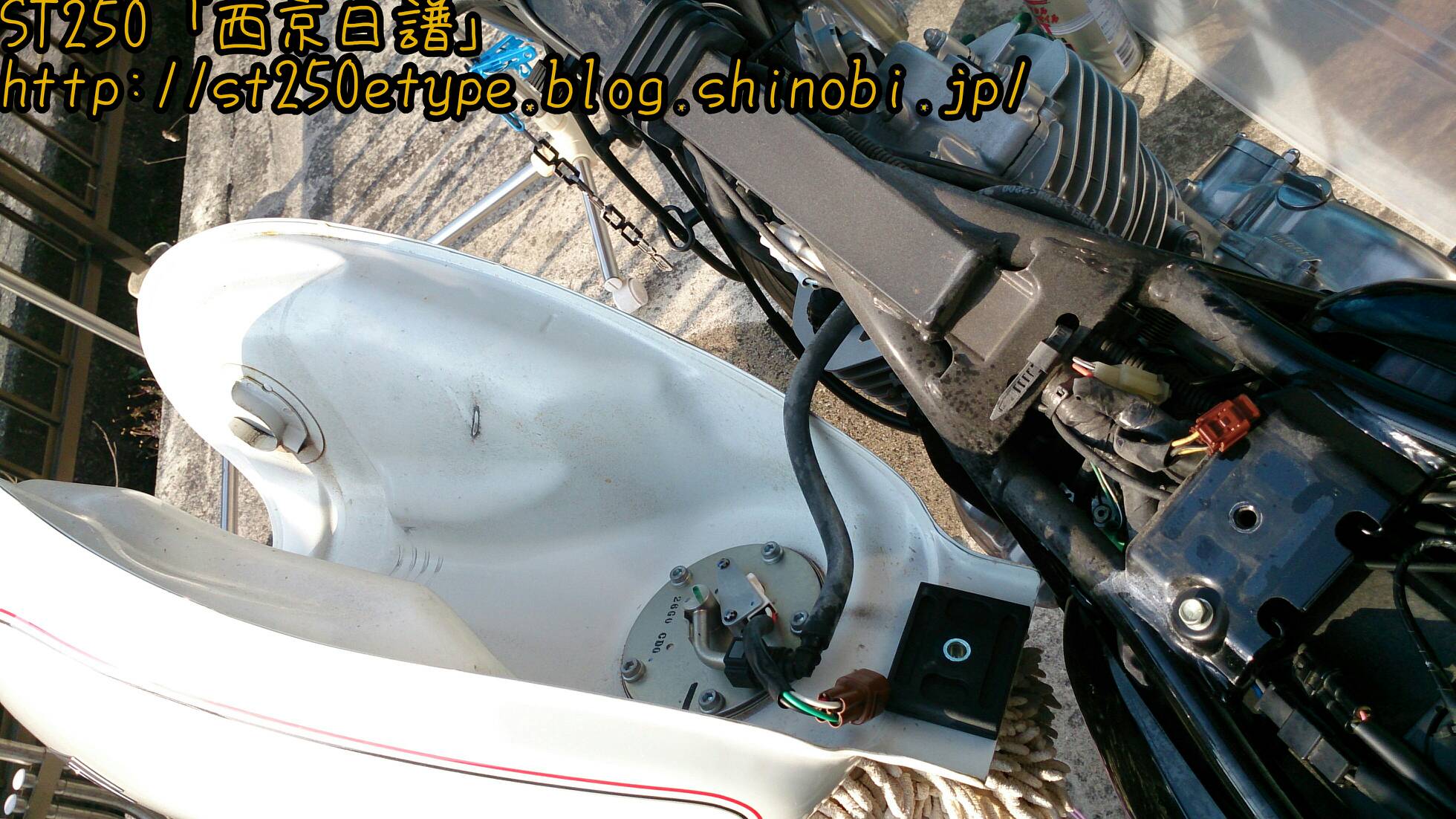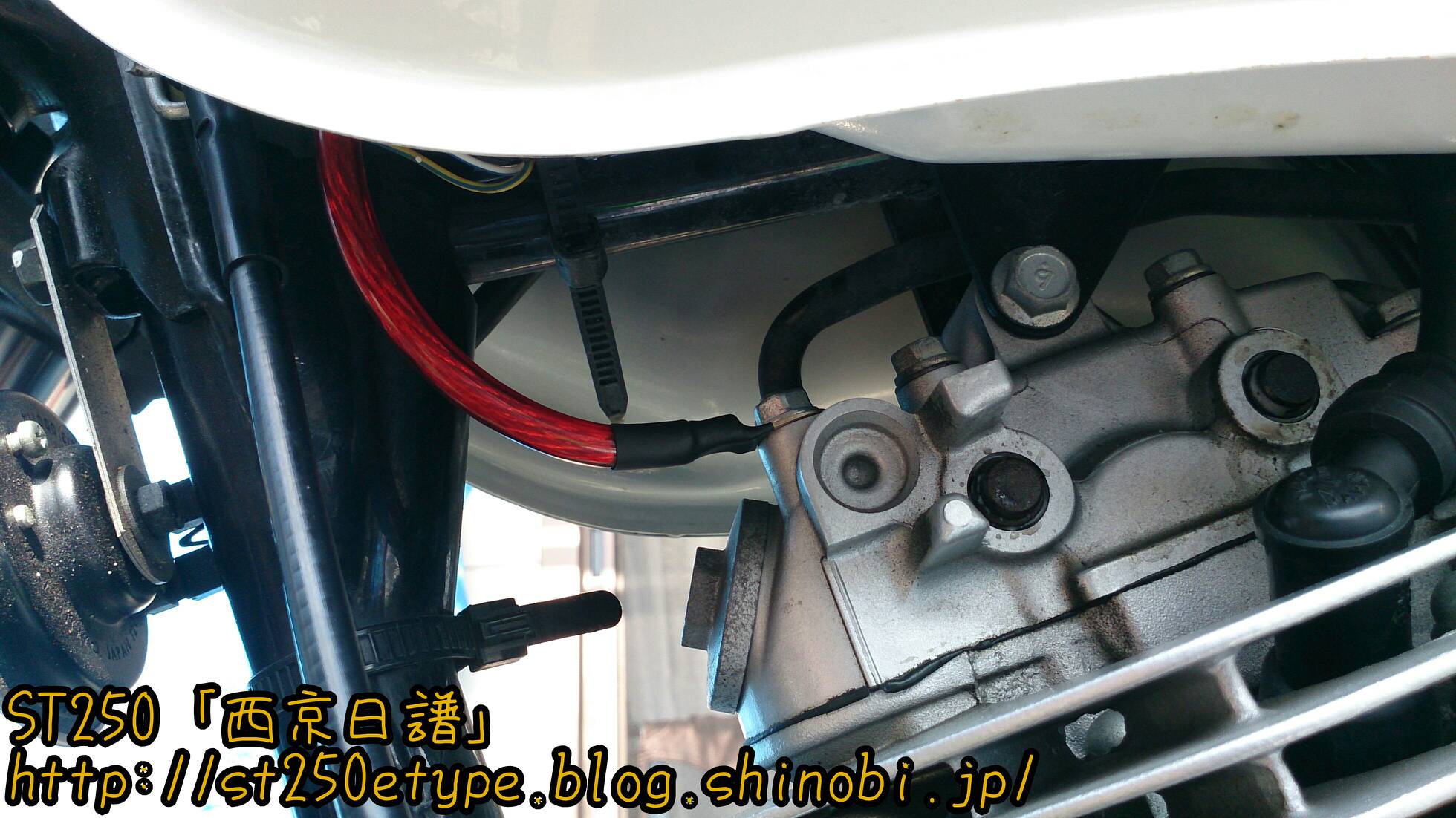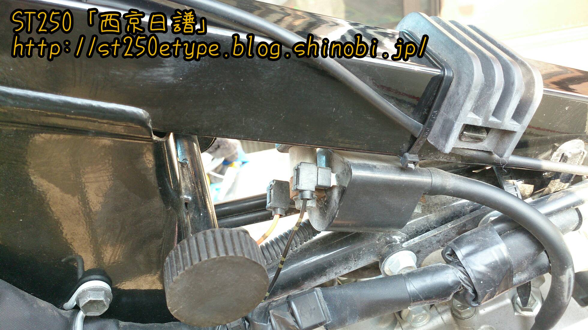 アーシングケーブルの取付け 日記 2016年03月27日 0 今回は先日届いたアーシングケーブルを設置した件です。今回のアーシングはシリンダーヘッドとイグニッションコイルを結ぶ配線なので、タンクを取り外す必要があります。初めてです。タンクを外すということは、タンクに繋がってる部分(ガソリンホース、FIのカプラー)を外す作業が出てきますが、できればホースは抜きたくない。ネットで調べると、タンクを外す手順としては……1*フロントシートを外す2*タンクの六角穴スクリューを外す3*FI関連カプラーを確認して外す4*ガソリンホースを外す 5*タンクを逆さに置くという感じです。で、4の「ガソリンホース」をつないだまま作業してみます。タンクと同じような高さの台を用意し、その上にクッションを敷いてにタンクを裏返しで保持。ガソリンはあらかじめ300km走行した状態ですので少ない状態になっています。ガソリンホースの形状と配置から、左側に置くことしかできません。FI(茶色)のカプラーを外しました。黒のガソリンホースは繋いだままです。このガソリンホースですが、ホースとは名ばかりでパイプのように固く、しなやかさがなく曲がりません。そのため写真のようにフレームとギリギリの位置になります。タンクの裏とフレームにサビがあったので、サビチェンジャーを塗って防錆し、シリコンスプレーを吹きました。イグニッションコイルは左側に延びています。今回の方法では、タンクも左側によけてあるので作業がやりにくかったです。アーシングケーブルは、イグニッションコイルが固定されているボルトに共締めするだけです。(詳しくはST250の某サイトにて。)タンクから少しガソリンが漏れていたようなので、共締めしてすぐにタンクを戻しました。アーシングケーブルの先はシリンダーヘッドです。20センチという長さの制約でこの場所になりました。20センチでは短すぎたかも。遠目にはまったく分かりません……(;´Д`)短すぎて目立たずドレスアップとしての効果はありませんでした。次はもう少し長めの30cmで用意してみようと思います。装着後のインプレッションです。効果はよく分かりません。よく分からないだけで、効果はあるのかもしれません。■アーシングの主な効果■全域にわたるトルクアップスロットルレスポンスアップ燃焼効率が向上し低燃費を実現中・低速域のトルクの向上ヘッドライト照度の向上等旧車には効果が覿面しかし、作業としては簡単なのでやってよかったと思います。バイク(スズキ)ランキングへ