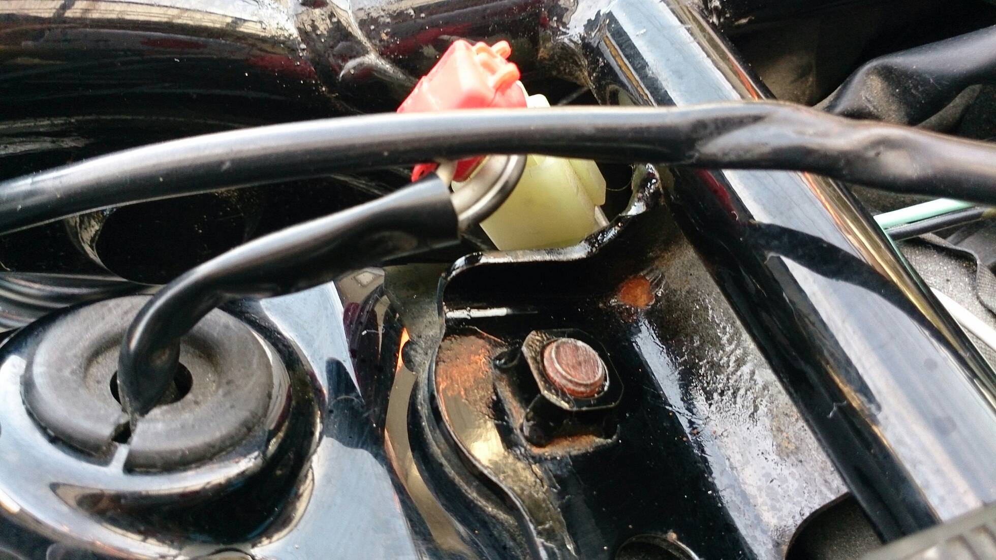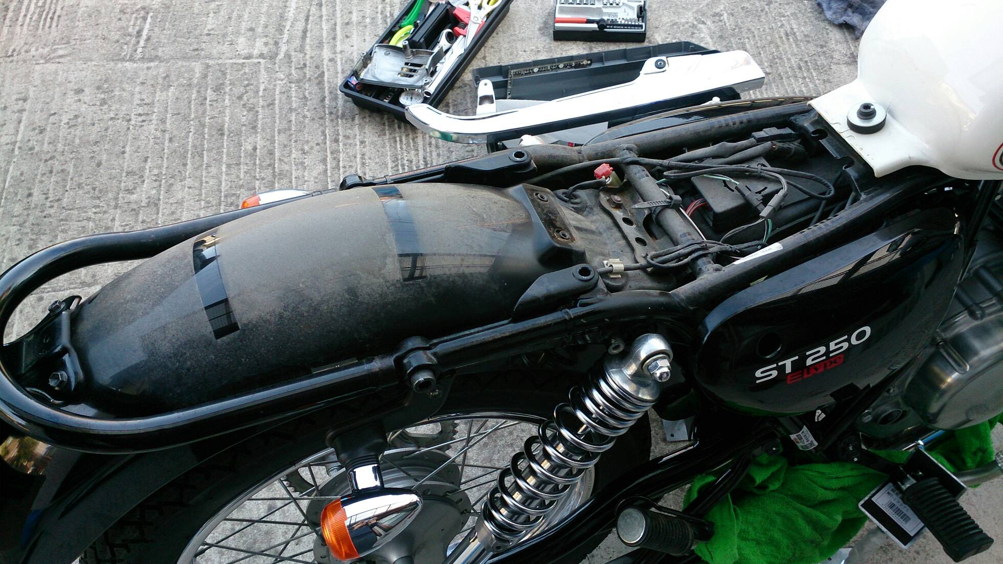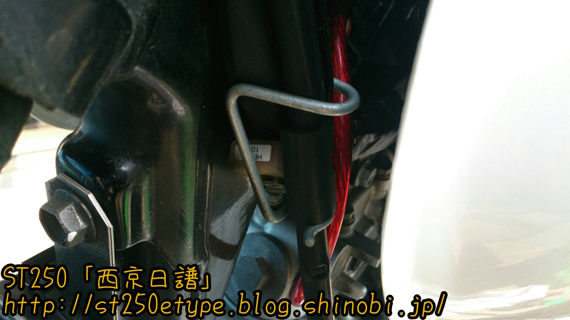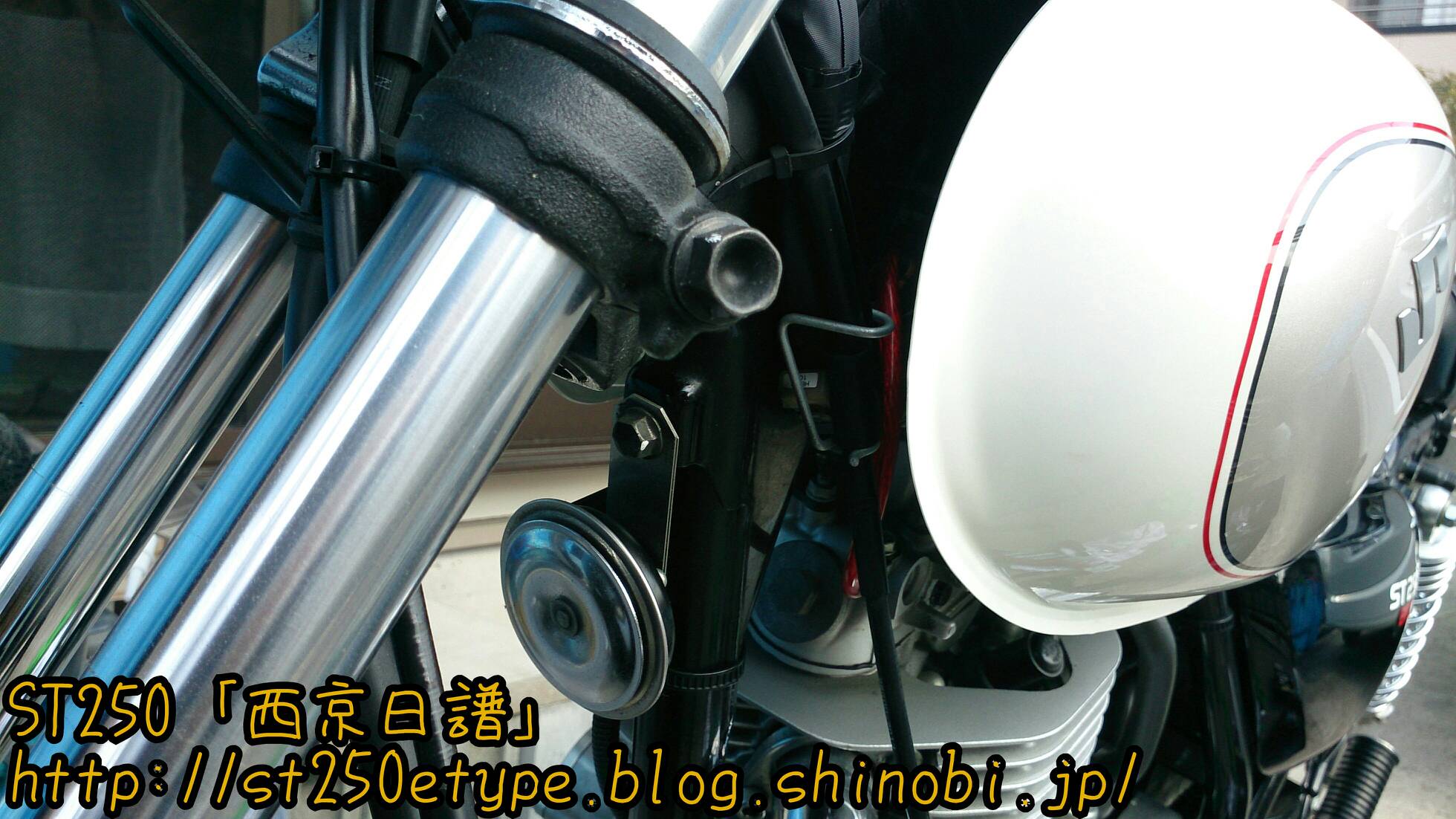 アーシングケーブルの取付け 日記 2016年03月27日 0 今回は先日届いたアーシングケーブルを設置した件です。今回のアーシングはシリンダーヘッドとイグニッションコイルを結ぶ配線なので、タンクを取り外す必要があります。初めてです。タンクを外すということは、タンクに繋がってる部分(ガソリンホース、FIのカプラー)を外す作業が出てきますが、できればホースは抜きたくない。ネットで調べると、タンクを外す手順としては……1*フロントシートを外す2*タンクの六角穴スクリューを外す3*FI関連カプラーを確認して外す4*ガソリンホースを外す 5*タンクを逆さに置くという感じです。で、4の「ガソリンホース」をつないだまま作業してみます。タンクと同じような高さの台を用意し、その上にクッションを敷いてにタンクを裏返しで保持。ガソリンはあらかじめ300km走行した状態ですので少ない状態になっています。ガソリンホースの形状と配置から、左側に置くことしかできません。FI(茶色)のカプラーを外しました。黒のガソリンホースは繋いだままです。このガソリンホースですが、ホースとは名ばかりでパイプのように固く、しなやかさがなく曲がりません。そのため写真のようにフレームとギリギリの位置になります。タンクの裏とフレームにサビがあったので、サビチェンジャーを塗って防錆し、シリコンスプレーを吹きました。イグニッションコイルは左側に延びています。今回の方法では、タンクも左側によけてあるので作業がやりにくかったです。アーシングケーブルは、イグニッションコイルが固定されているボルトに共締めするだけです。(詳しくはST250の某サイトにて。)タンクから少しガソリンが漏れていたようなので、共締めしてすぐにタンクを戻しました。アーシングケーブルの先はシリンダーヘッドです。20センチという長さの制約でこの場所になりました。20センチでは短すぎたかも。遠目にはまったく分かりません……(;´Д`)短すぎて目立たずドレスアップとしての効果はありませんでした。次はもう少し長めの30cmで用意してみようと思います。装着後のインプレッションです。効果はよく分かりません。よく分からないだけで、効果はあるのかもしれません。■アーシングの主な効果■全域にわたるトルクアップスロットルレスポンスアップ燃焼効率が向上し低燃費を実現中・低速域のトルクの向上ヘッドライト照度の向上等旧車には効果が覿面しかし、作業としては簡単なのでやってよかったと思います。バイク(スズキ)ランキングへ
